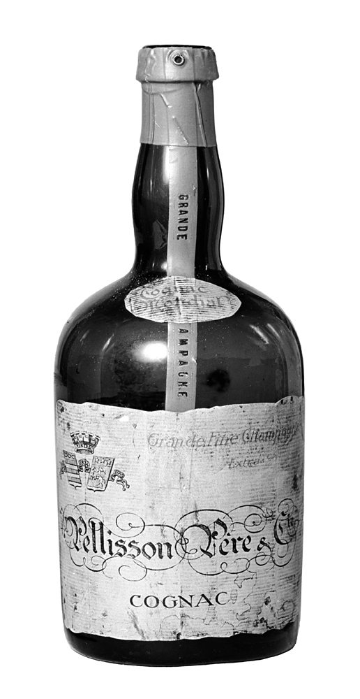 COGNAC MONDIAL EXTRA, Pellisson Père & C:ie, fyra helbuteljer Av grönt glas. Cylindriska, låga, vida, med kupigt indragen skuldra och spolformig hals med stärkring; bottnen skålig. Etikett gul- och vitrandig, på denna varumärke och firmanamn i svart jämte text i rött: "Grande Fine Champagne Extra"; på skuldran en liten, liggande oval etikett, varpå i rött: "Cognac Mondial". Kapsylfragment av förtent bly, rödfärgat; från detta nedlöpane under etiketterna ett rött band som kapsylen, på bandet text i svart relief. Höjd: 23,9 cm.; diameter: 9,8 cm.