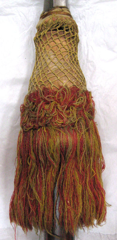Balusterformig träknopp överdragen med gulvitt och bitvis rosa siden samt över detta ett nät av guldgul silketråd. Upptill fäst runt holkens ring med kläde och grov linnetråd. Nertill frans av vinröd och guldgrön ylle.