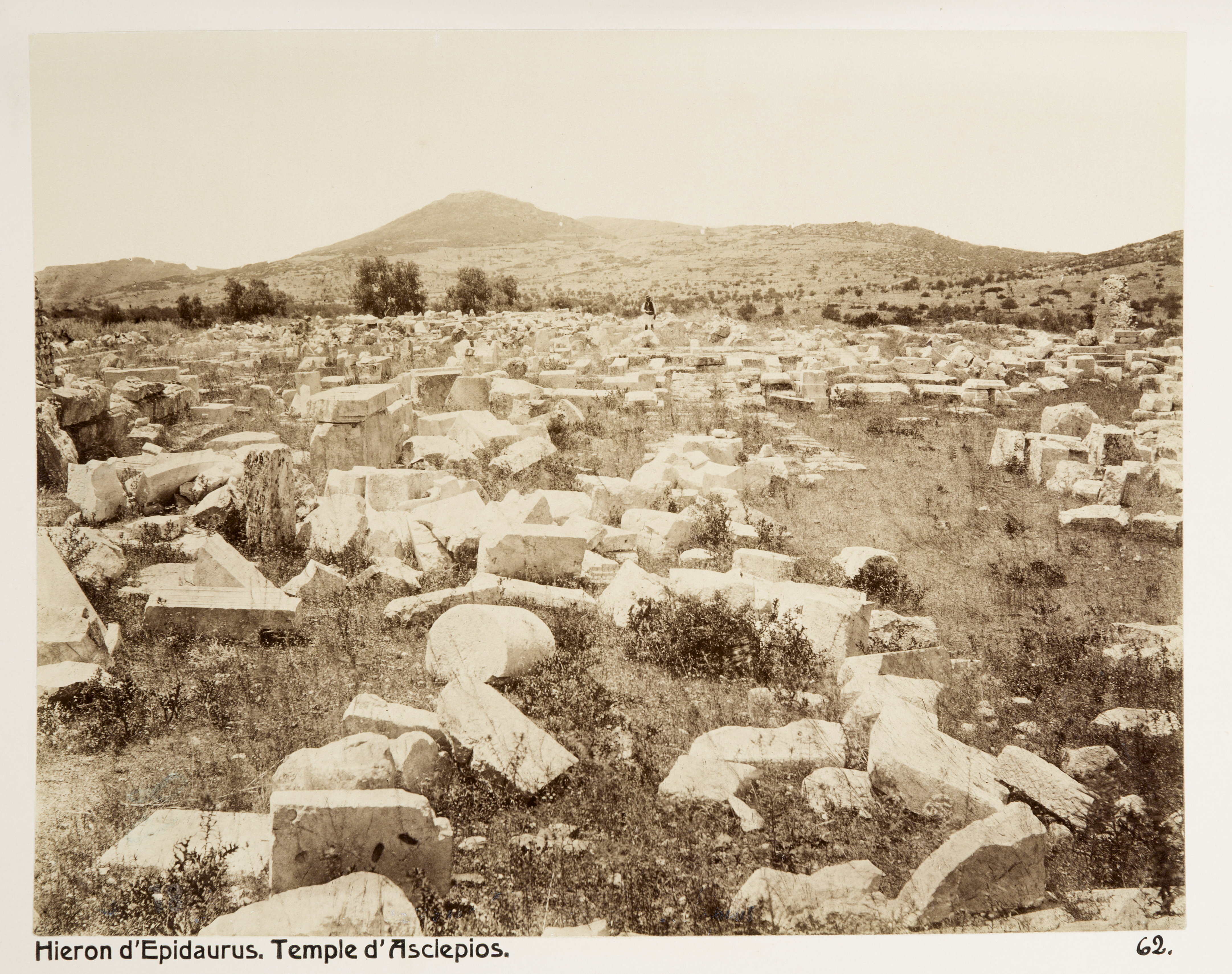 Asklepiostemplet i Epidauros. Text på originalet: "Hieron d'Epidaurus. Temple d'Asclepios." Foto från resa genom Grekland, Makedonien och Serbien, 15 mars-6 juni 1896. Fotografierna LXVI:K.18.-147. är köpta av Wilhelmina von Hallwyl, f. Kempe på Korfu samt i Patras, Nafplion, Aten, Thessaloniki och Belgrad. Med på resan var maken Walther von Hallwyl och fröken Ida Uhse. Uppgifterna kommer från Ida Uhses reseanteckningar.