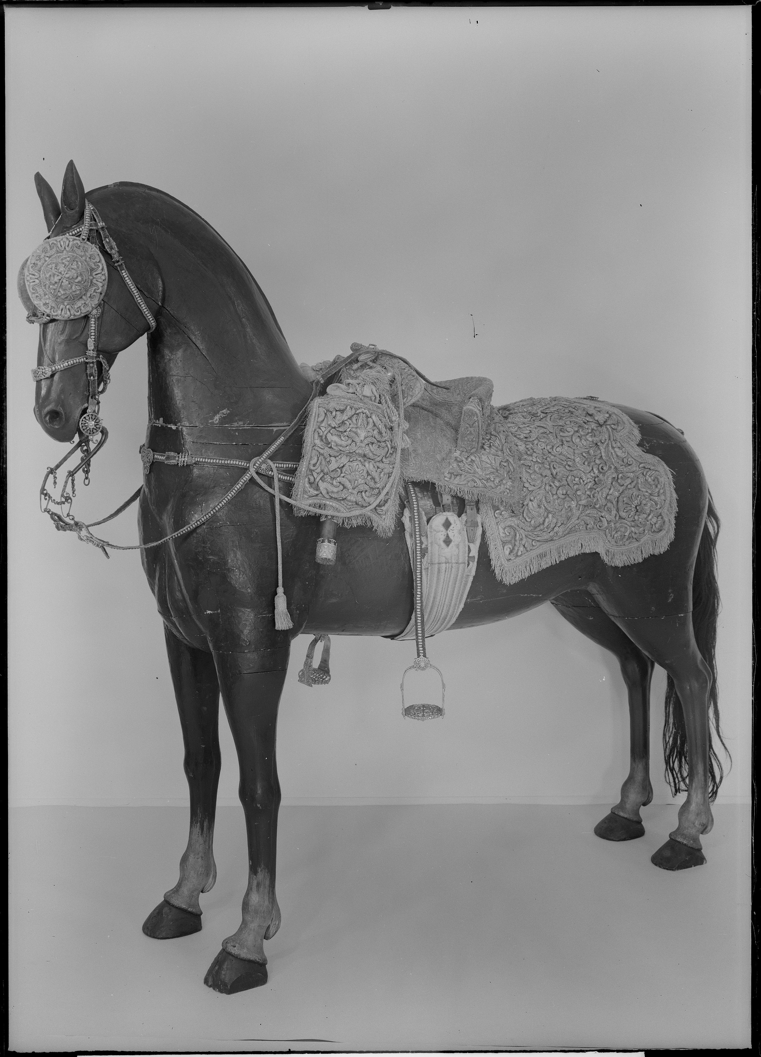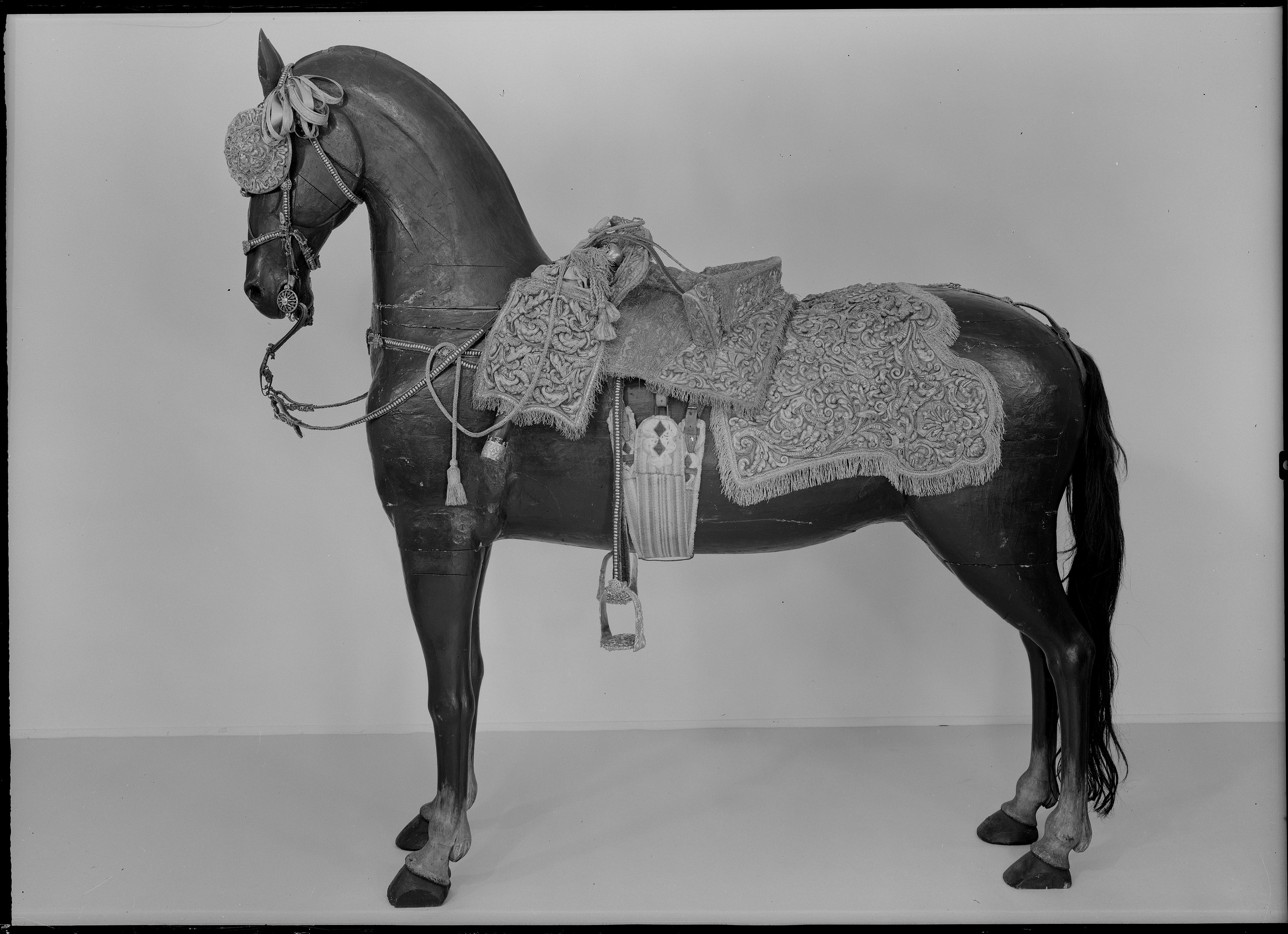 - Sadel af citronfärgadt sammet med sadelkåpa, hölsterkappor och schabrak ornerade och broderade i silfver med med silfverfransar och tofsar; på schabraket dubbelt C broderadt i guld; sadelknappen med en sleif af rent silfver, och på sadeln tennlickor af samma metall; förbygeln af gult saffian med en silfvergalon och beslagen med silfverstifter, pucklor och söljor af drivet arbete; ryggstycket lika med förbygeln och beslaget af en defekt silfvergalon, beslaget som utgöres af gult saffian, beslagne med utarbetadt silfver; remmar med söljor af silfver; husen öfver pistolkapporna af citronfärgadt moiré med en silfverfrans; hufvudstället och tygeln lika med förbygeln - beslaget af silfver -; 4 st. pannkedjor; betselstängerna försilfrade med 2 buketter af silfver; 1 par runda pistolhufvuden (tillskrivet med blyerts: blindor) i samma broderi som sadeln; remmarne af gult saffian med söljor och styfter af silfver (saknas); handtygeln saknas och på stigläderna äro 39 tennlickor bortfallna. (Förärad från Frankrike.)