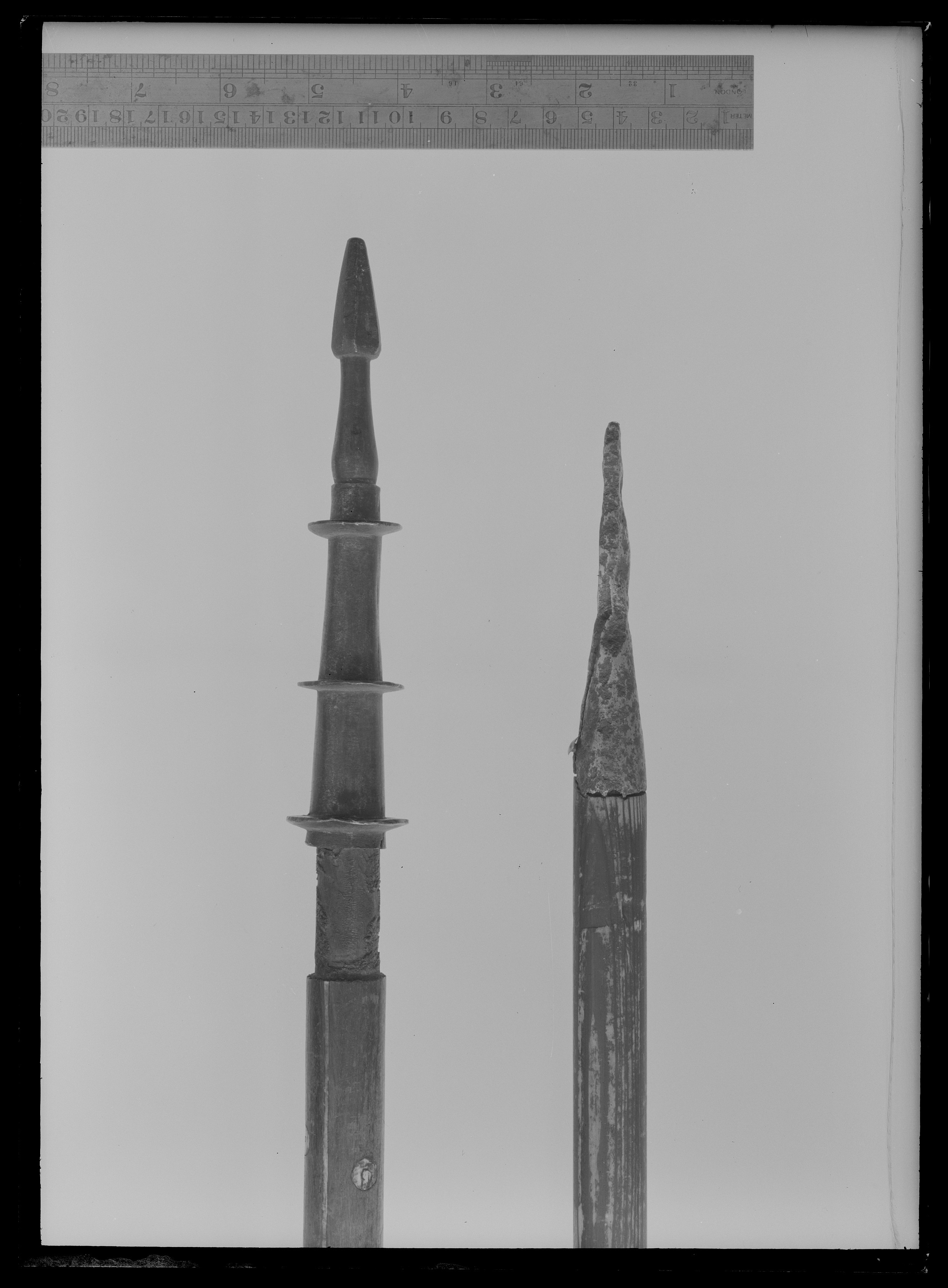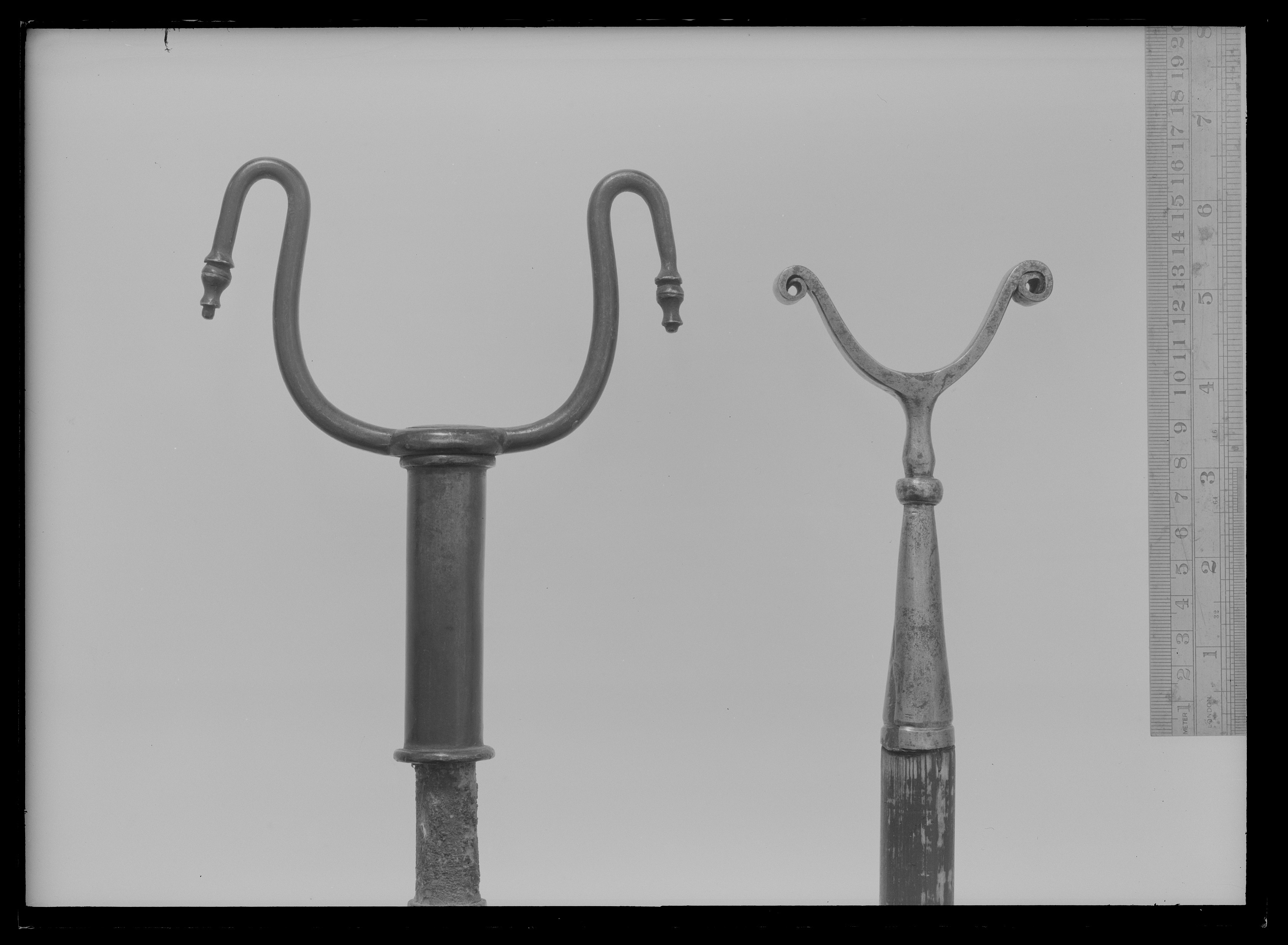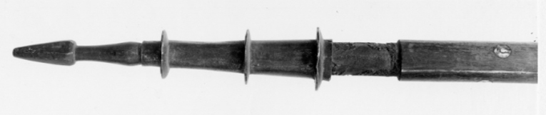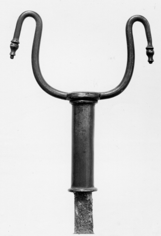 Runt skaft av valnöt med inläggningar av vitt och grönfärgat ben i form av längsgående lister samt på övre hälften bladrankor och två grupper om vardera tre avlånga, graverade plattor med rundad hörn. På nedre hälften är inlagt runda plattor. Gaffel av svärtat stål med rak holk med fläns längs ned, i överkänden på holken ett gängat hål. Gaffeländarna nedåtsvängda med balusterformiga spetsar. Doppsko av svärtat stål, konisk med tre flänsar, pyramidformig spets med fasade kanter på balusterformigt skaft.