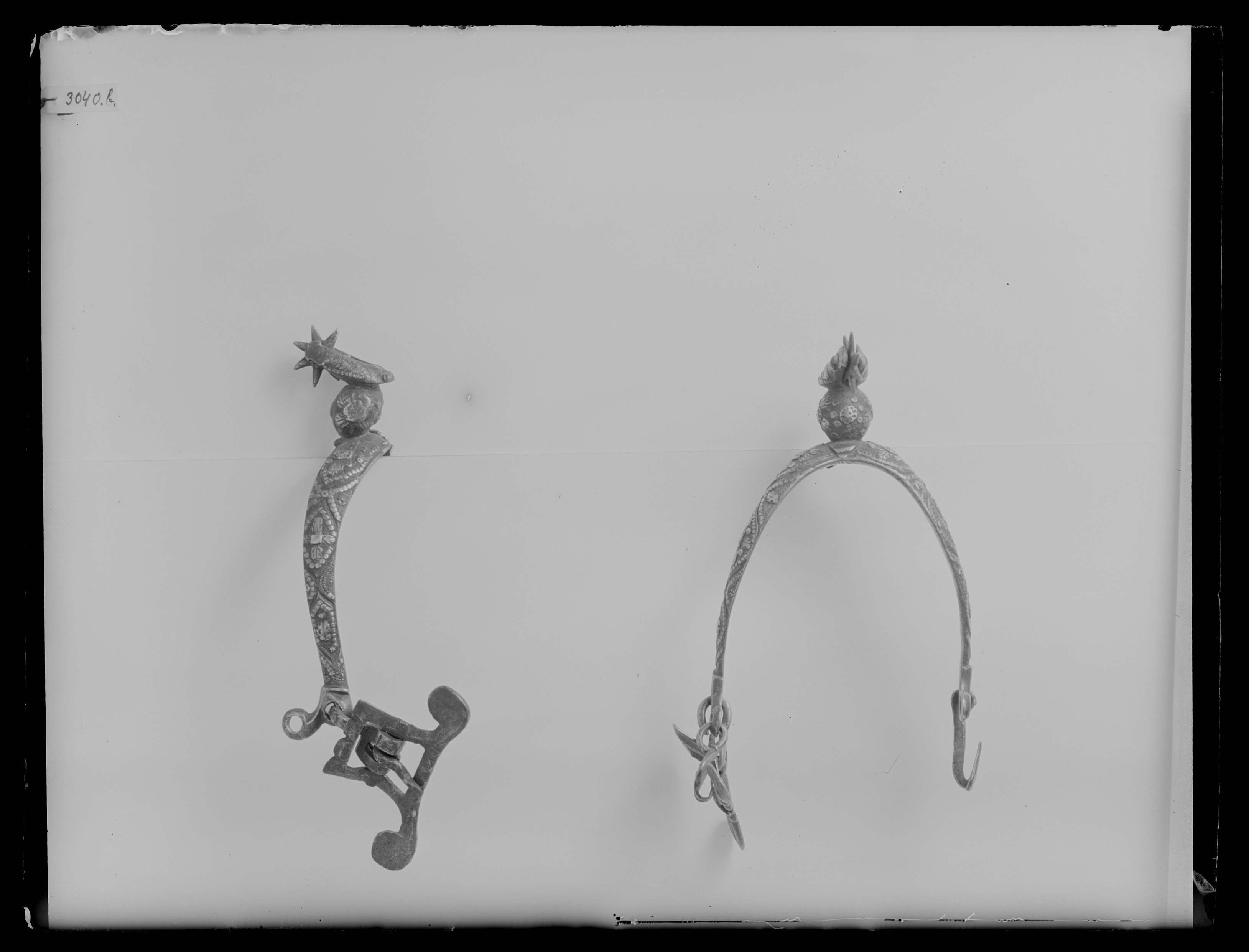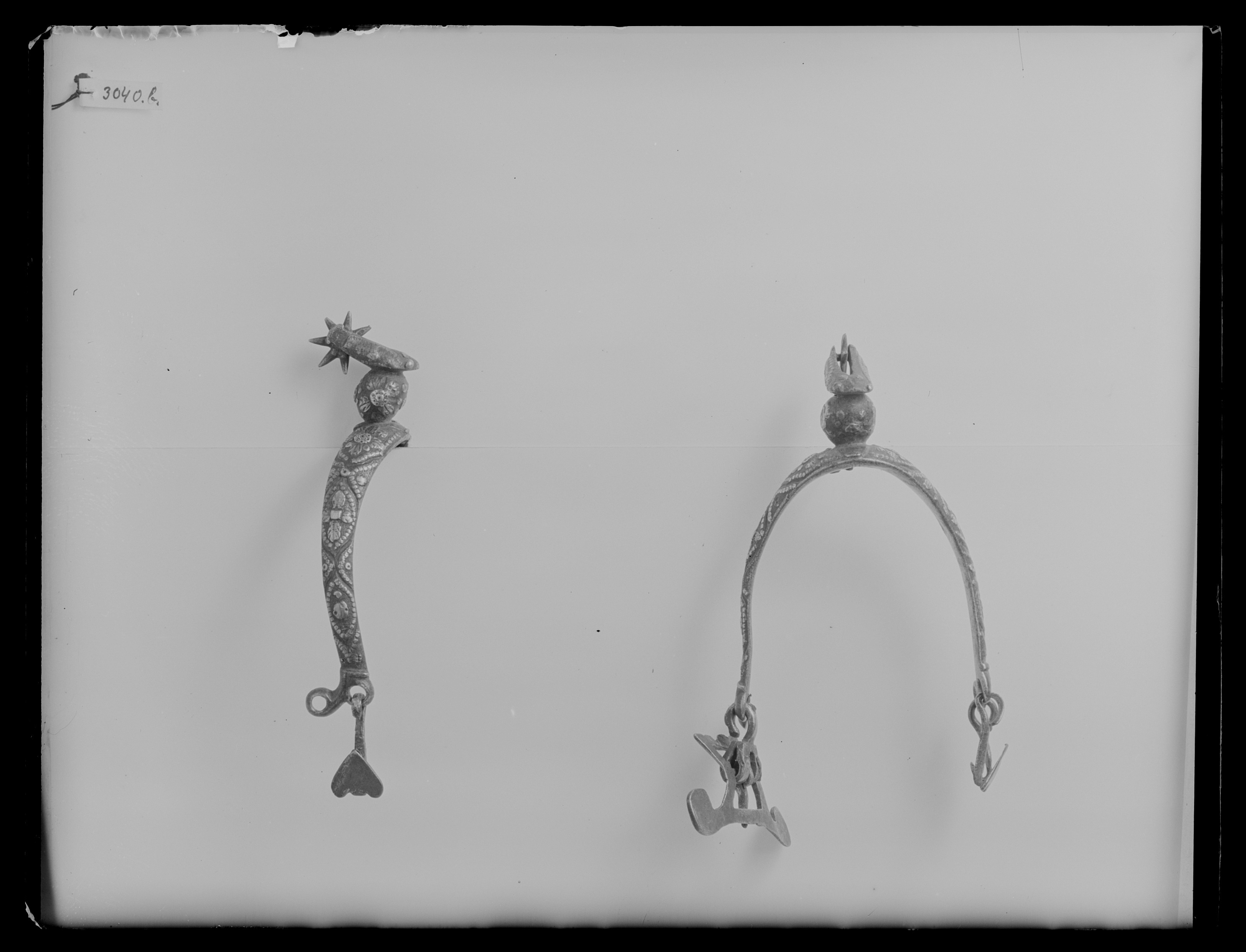 Sporre av stål med graverad dekor, försilvrad. U-formade skänklar avsmalnande mot ytterändarna som har två öglor nedåtböjda. I öglorna är fästa en fyrkantig sölja med två utdragna böjda delar med plana ytterändar. I de nedre öglorna är fästa hjärtformade kläppar. Sporrhals 23 mm lång i form av rund kula och en nedåtböjd arm med stjärnformig klinga av stål, 7 taggar.