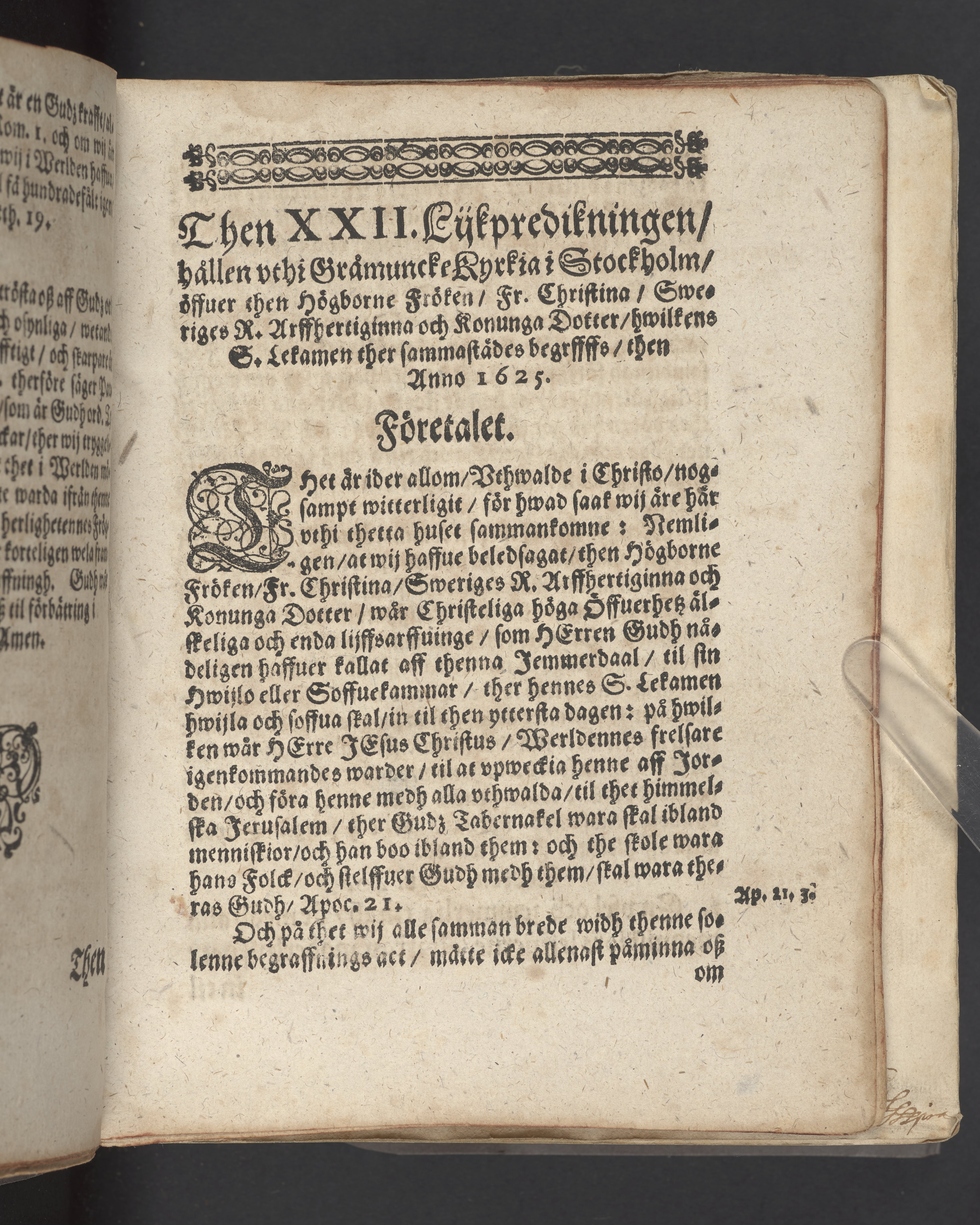 Then XXII lijkpredikningen/ hållen uthi Gråmuncke kyrkia i Stockholm/ öffuer then högborne fröken, Fr. Christina/ Sveriges R. arffhertiginna och konungadotter/ hwilkens s. lekamen ther sammastädes begroffs/ then Anno 1625.
