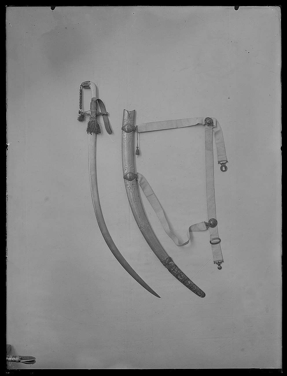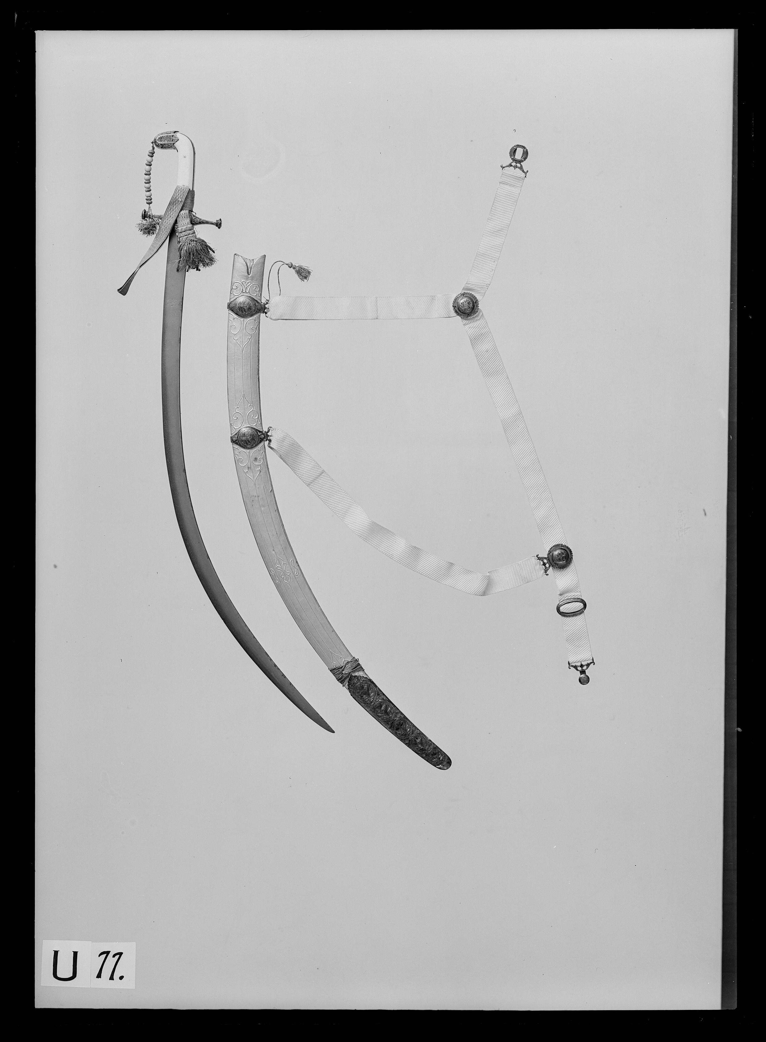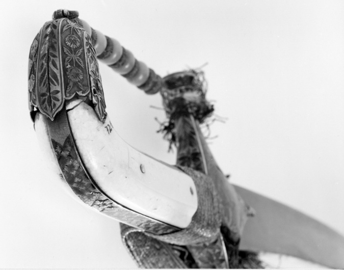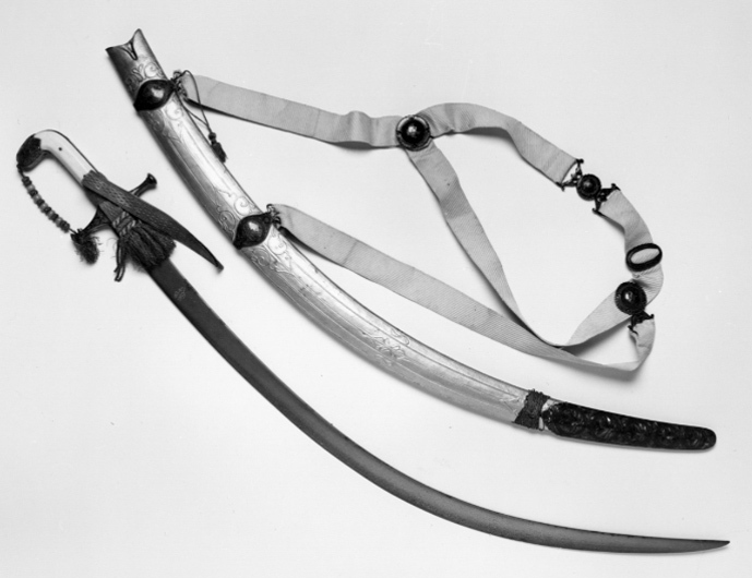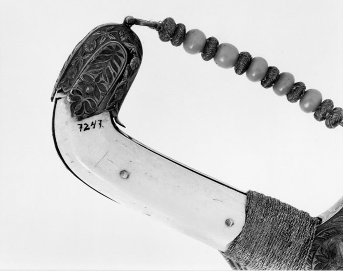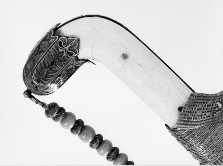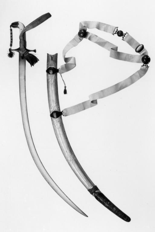 Framåtböjt fäste. Raka parerstänger med runda ändknappar i ett med styrskenor, totall: 110 mm. Kappa med flikig nederkant. Fram och bak skenor. Allt av silver med emaljarbete (gropemalj) i grönt med inslag av blått och rött, blad- och blommönster, mitt på krysset en cirkel med en blå blomma med två röda knoppar och gröna blad mot silverbotten. På parerstängernas knoppar rosetter. Kavel klädd med pånitade plattor av valrossbete. På kappen en liten bygel vari guldsnodd med påträdda pärlor av guldtråd och ljusrött glas. Snodden fäst vid främre parerstången med en liten guldtofs. Klinga av damaskerat stål, b: 31 mm, böjd, eneggad med persisk signatur (se katalogkort) "Sharafollah" och magiskt tecken. Tillbehör: Portepé av guldtråd och litet rött silke.