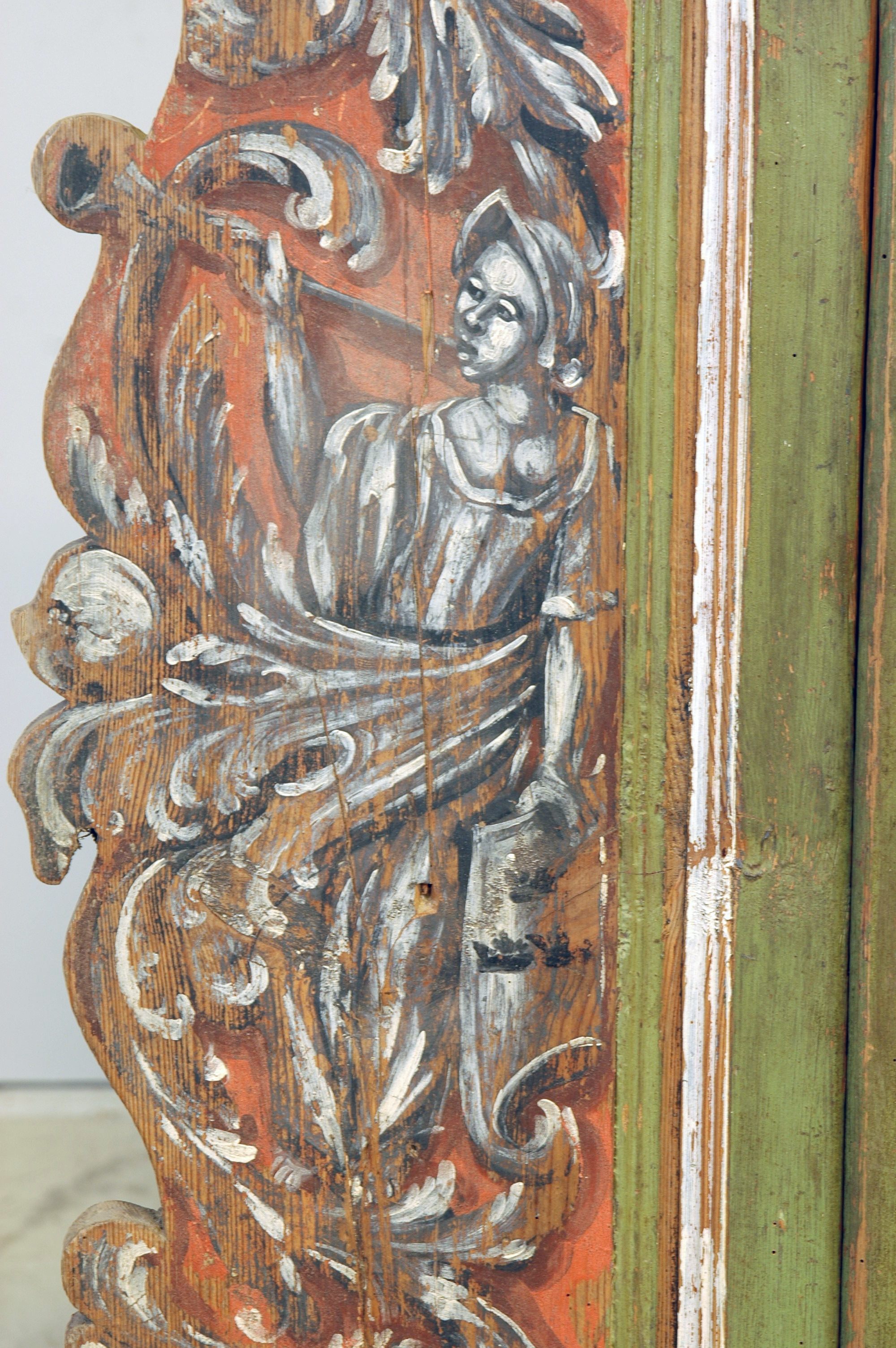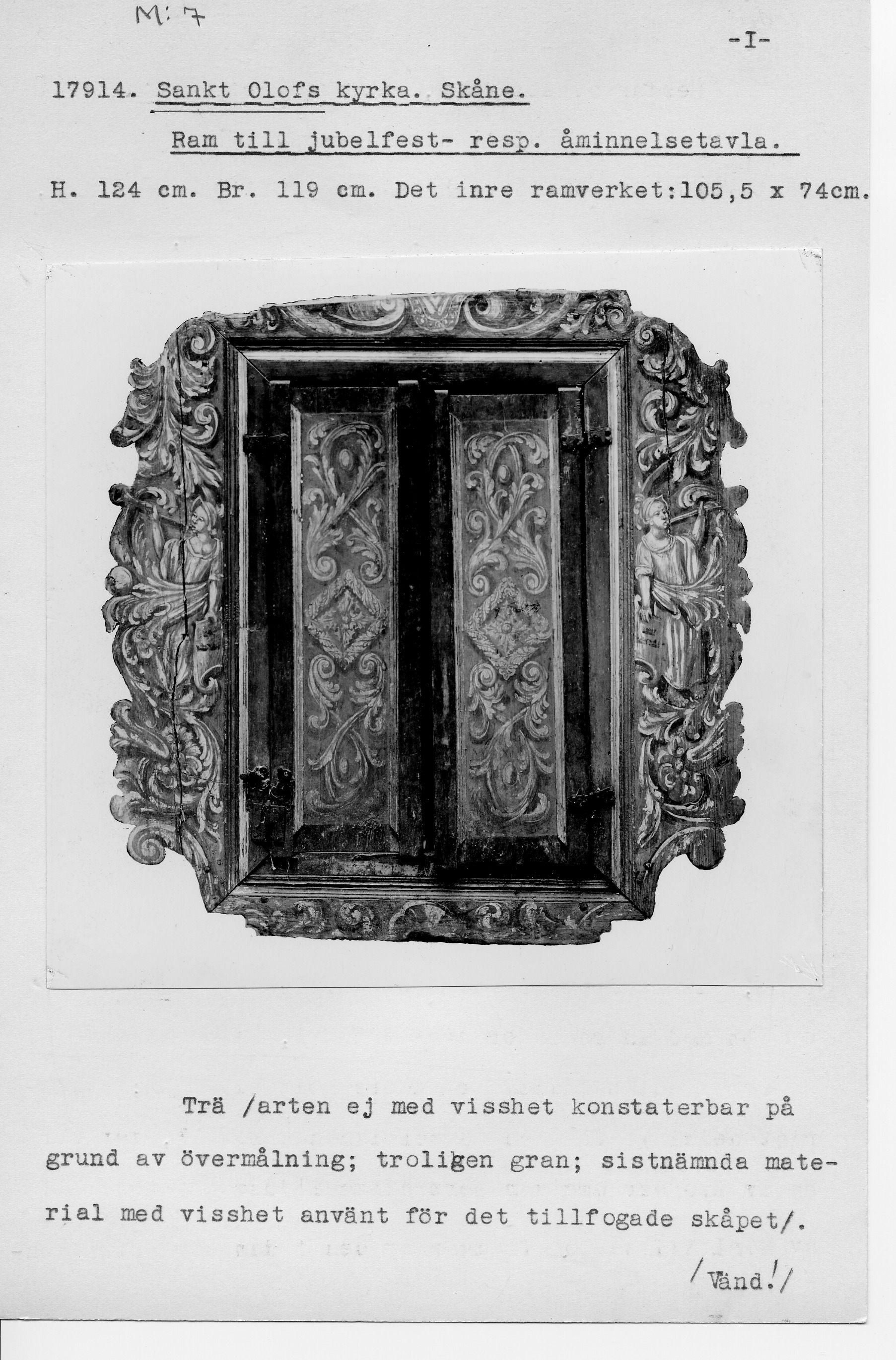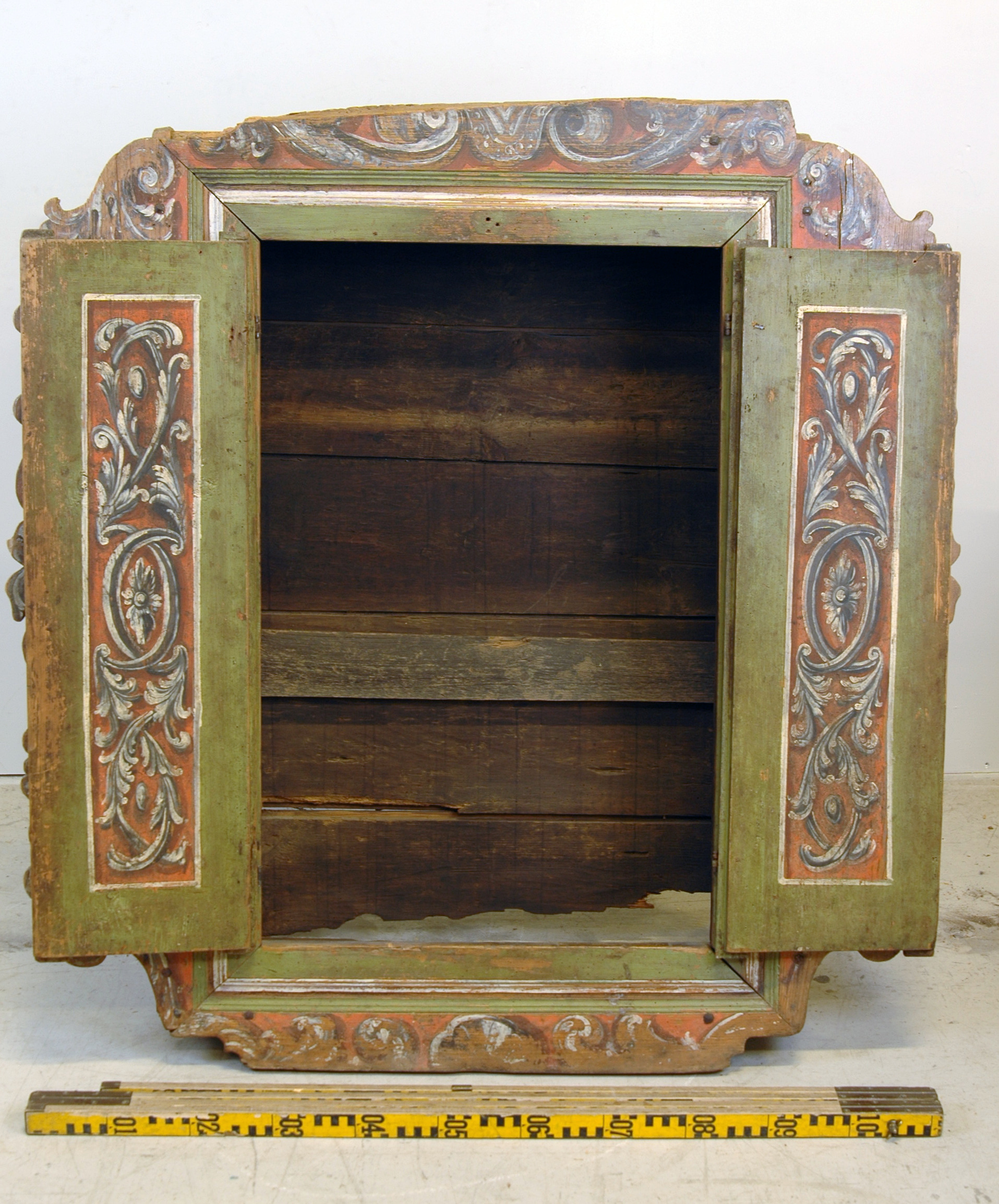 Skåp med äldre tavelram som tillhört åminnelsetavla. Skåpet har varit inmurat.