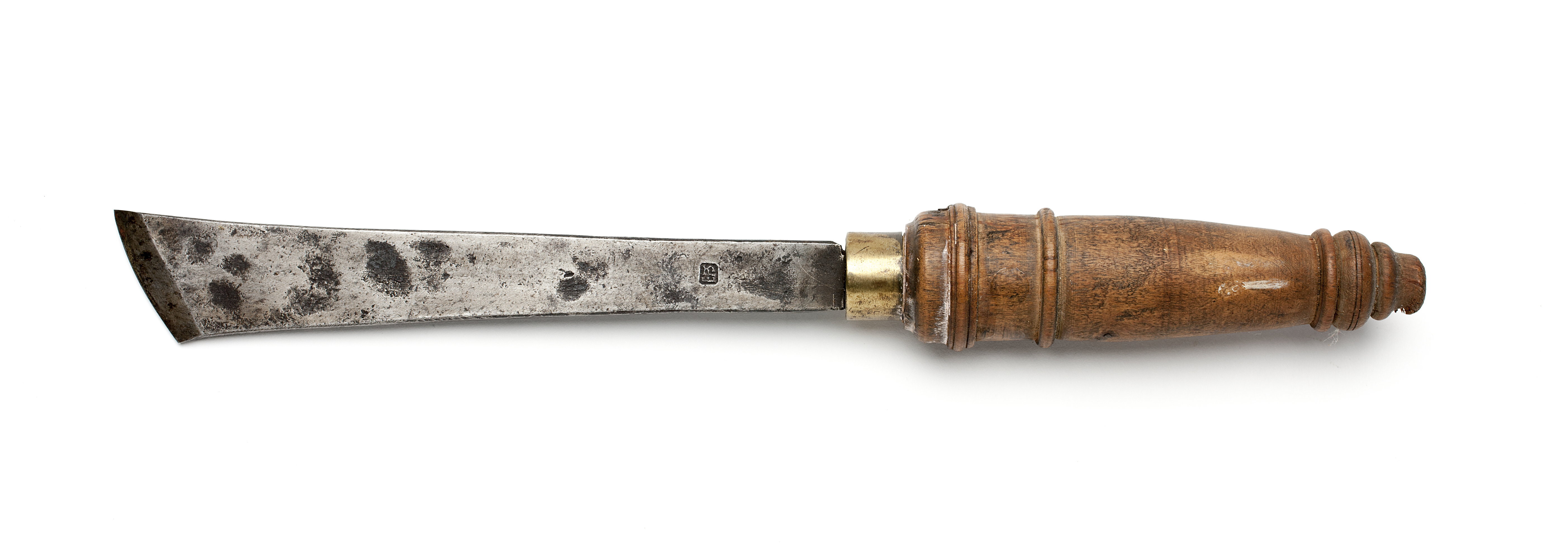 Klinga med rektangulär genomskärning. Stämplat på klingan: "EPS". Sned, lätt rundad egg. Svarvat, profilerat skaft av björk, avsmalnande mot änden, mässingsring.