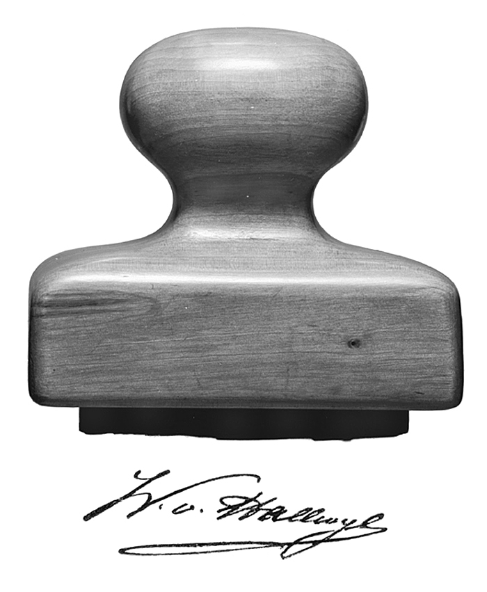 Avlång skiva, på vars undersida WALTHER VON HALLWYLS namnteckning (avtryck, se Planschverket); skivan på fot av mahogny. Skaft av björk, polerat, nedre delen tjock, avlång, med rundade hörn och kanter, den övre i form av en liggande avlång knopp på kälformig kort hals. Skivans fot infälld i skaftets undersida. Tillhört inventarierna på firman Wilh. H. Kempes (innehavare Walther von Hallwyl och Johanna Kempe, f. Wallis) kontor, inrymt i Blasieholmstorg 11, 1884 - 30 September 1896, och Hamngatan 4, 1 Oktober 1896 - 1909; sedermera på Walther von Hallwyls privata kontor 1909 - 1921.