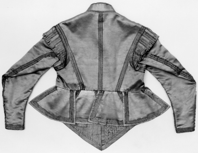 Avskuren i midjan med skört och axelkarmar, ursprungligen i gråvit atlas garnerad med silvergaloner och silvertrådsknappar, fodrad med vit taft. Atlasen var mönsterstucken med små hål på alla ytor. Längd mitt fram: liv 40,5 cm, skört 19,5 cm. Bröstvidd: 100 cm. Längd mitt bak: liv 40 cm, skört 18 cm. Ryggbredd: 45 cm. Midja: 99 cm. Längd sida: liv 13,7 cm, skört 18,2 cm. Axel: 16,3 cm. Ärmlängd: 64 cm, största vidd 40,5 cm, 24,5 cm ärmvidd nedtill, 15 cm ärmsprund. Krage: 52 cm längd, 5 cm höjd. Ärmsprund: 20,5 cm. Tröjans ståkrage som är är gjord av tre lager linne med ett lager näver mellan varje och sedan klädd med ny atlas från konserveringen 1978. Kragen har två silverbandsöglor i vänster framkant samt två silvergaloner runt över- och nederkant. Kragen har en nummerlapp, baksidan av ett spelkort, 4 x 2,8 cm. Ned brunt bläck är skrivet N 4 "kong Gustav Adolphs atlaströja". På tröjans insida från midjan och 26 cm upp; ligger på var sida om öppningen, en kilformad styvnad. Styvnaden består av ett tätt lager små kvistar på bägge sidor därom ett stycke papper och ytterst ett grovt linne. Styvnaderna går utmed bägge framkanterna, är 5 cm breda i toppen och 14 cm i basen mot midjekanterna, är 3 cm breda i toppen och 14 cm i basen mot midjekanten. På styvnadernas nederkanter sitter på vardera sidan en 7 cm lång sidenögla, numera fastsydd runtom. Tjugotvå knapphål mitt fram på vänster framstycke, sydda i vitt silke. 18 knappar finns kvar. Knapparna är silvertrådsklädda och fastsydda med grovt lingarn. Ärmsprundet har 9 knapphål, höger ärm har 8 knappar kvar och vänster ärm har alla 9 knapparna kvar. Ärmsprunden är kantade med kanvas. Vid midjan sitter en hälla 4 cm höhg tillverkad av en silvergalon, på varje framstycke samt en på vänster bakstycke. Skörten är intill midjesömmen kantade medsmå runda hål med 1 cm mellanrum. Hålen är kantade med stygn i gulvitt, tjockt silke. Runt flera hål har stygnen fallit bort. Dessa hål syns numer bara från insidan. Varje axelkarm har 10 små sprund, 1,5 och 2 cm djupa som bildar 12 flikarsom är 4 cm breda, karmens bredd är 8,5 cm. Karmarna är 4 cm breda och mellan flikarna vid sprundens botten sitter två tränsar mellan varje flik.