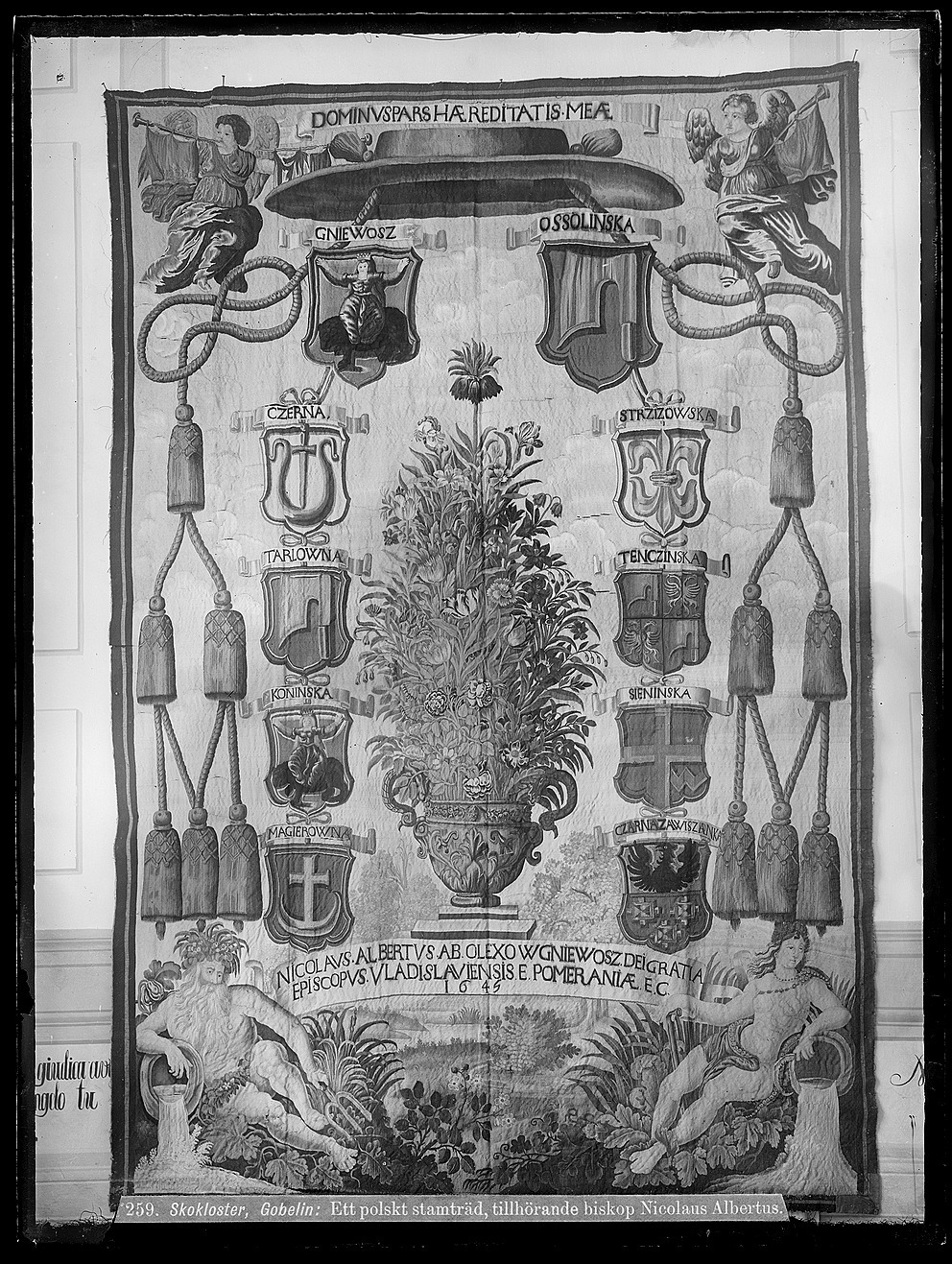 Tio vapensköldar omsluter stor blomsterurna. Upptill kardinalshatt, i hörnen två änglar med trumpeter, nedtill i hörnen en flodgud och flodgudinna , mellan dessa textband med "NICOLAVS ALBERTVS. AB. OLEXOW GNIEWOSZ DEI GRATIA EPISCOPVS. VLADISLAVIENSIS. E. POMERANIAE. E. C. 1645". Av ylle och silke (8-9 trådar per kv.cm) i gobelängteknik.
