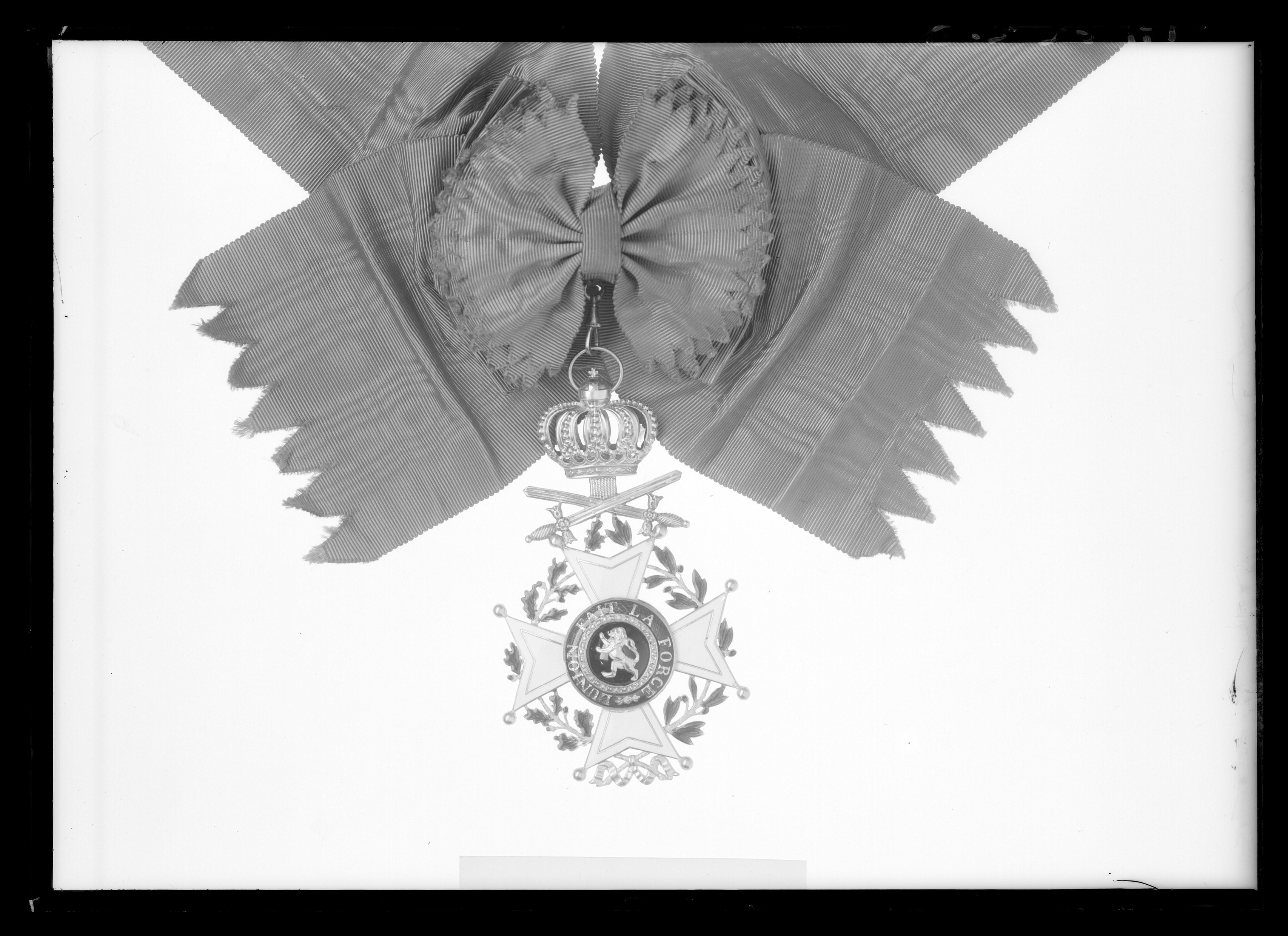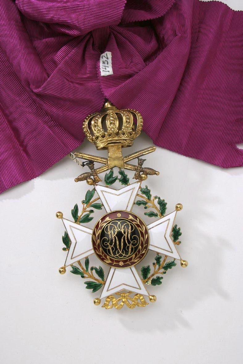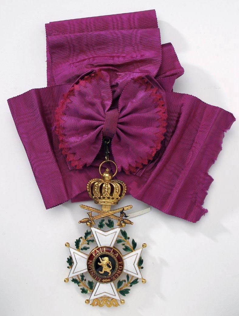 Vitemaljerat malteserkors av guld med kulor på spetsarna och kantlinje av guld. Mellan korsarmarna en krans av en lager- och en ekkvist med grönemaljerade blad. Välvd medaljong täckt med svart emalj, därpå fäst ett krönt lejon av guld. Däromkring en guldkantad ring täckt med röd, genomsynlig emalj, däri guldtext: "L'UNION FAIT LA FORCE". Frånsidans medaljong svagt välvd och täckt med röd, genomsynlig emalj, däri en lagerkrans av guld. På den övre korsarmens spetsar fäst två korslagda svärd av guld med spetsarna uppåt, ifrån krysset utgående ett band, däri fäst med scharner en kunglig krona av guld, igenom äpplet draget en räfflad bandring.