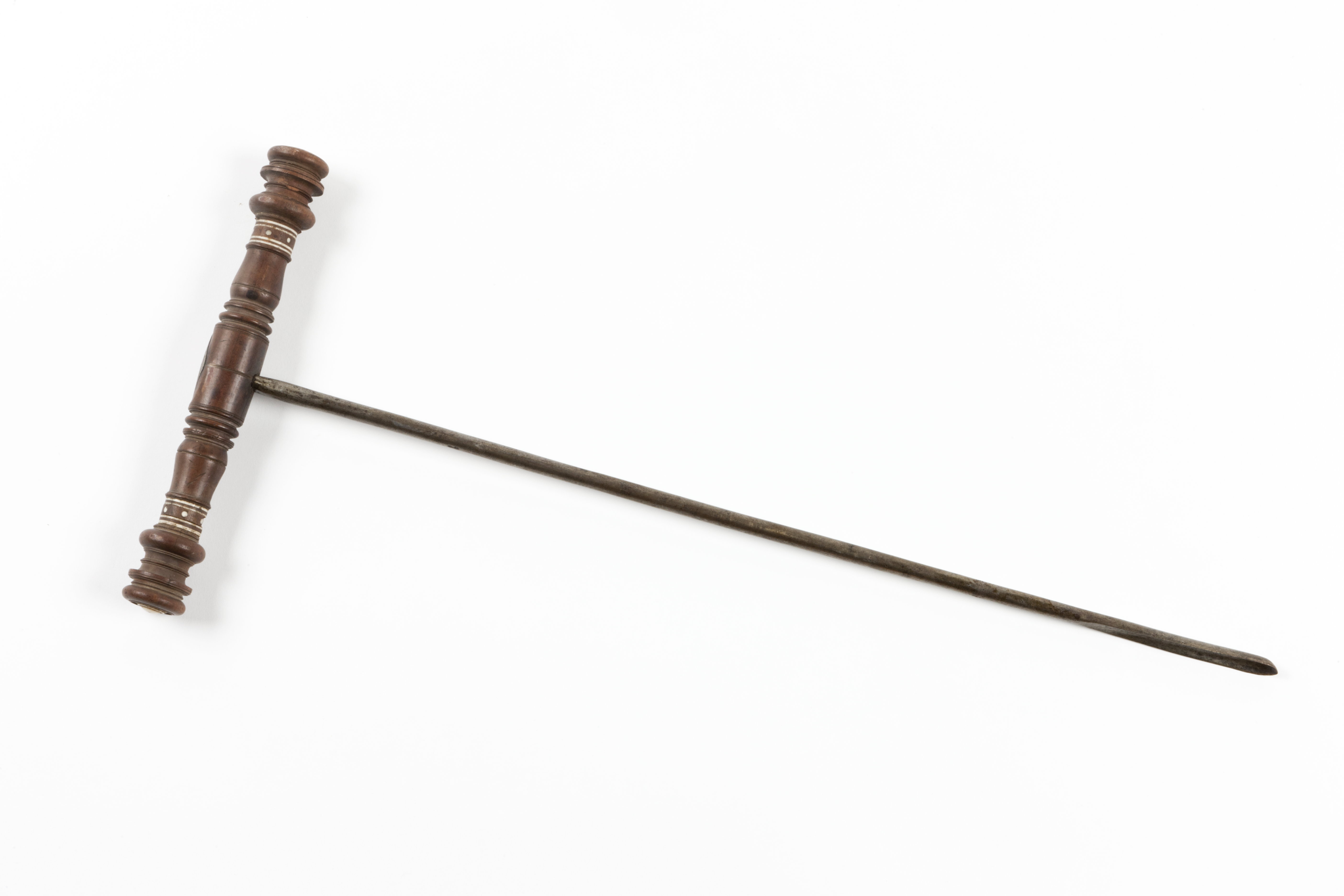 Stämpel: nyckel. Svarvat, profilerat handtag av päronträ med inlagda ringar och knappar av ben.