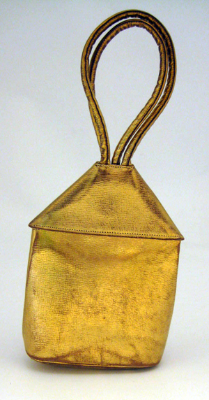 Väska av guldskinn i form av en stående rektangel med vinkelformig överdel, där två flikar går omlott och knäpps med en stor tryckknapp. Två handtag i form av två stora öglor, utgående från spetsen. Oval, isydd botten. Invändigt fodrad med gul sidenatlas, en ficka.