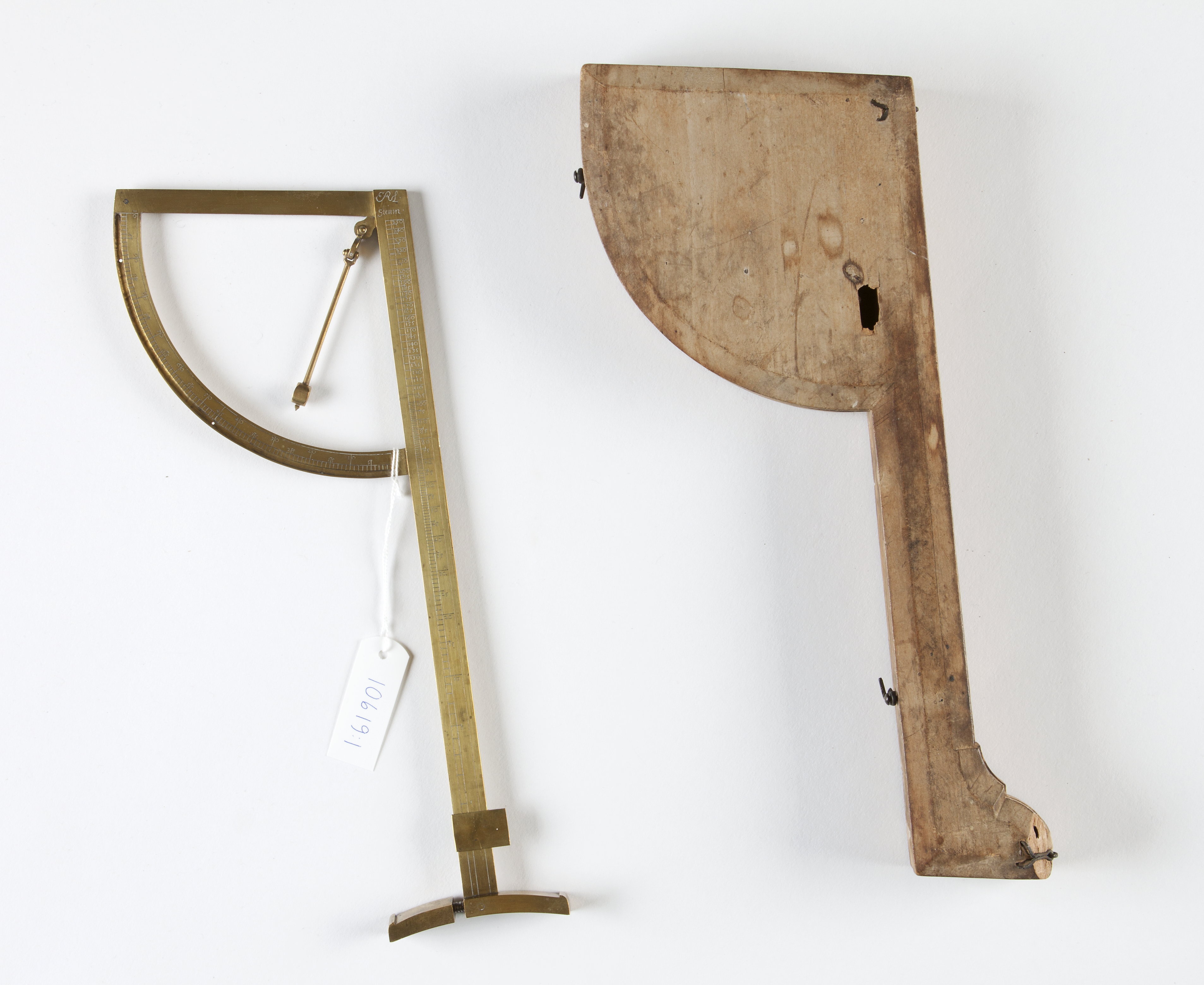 Kombinerad artillerimåttstock och artilleri “kvadrant” (100 graders vinkel).
