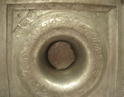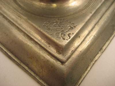 Ingår i Strömsholmsservisen. Ytterligare delar finns bl a på Nationalmuseum och på Nordiska museet. Utförd av Mårten Kasper Rokus, mästare i Stockholm 1683-1714. Tennljusstake med cylindrisk ljuspipa och smal manschett. Profilerad stam och droppskiva över kvadratisk fotplatta med hålkäl. Fotens mittparti nedsänkt till droppskål. I fotplattans ena hörn graverat "HERS" (Hedvig Eleonora Regina Sueciae) under kungakrona. På fotplattans undersida graverat "STRÖMSHOLM Ao 1696". Trestämpling samt årsbokstav på fotplattans undersida. 1) 2) Tenngjutarmästare Mårten Kasper Rokus märke "MR" (antikvaversaler) över månskära med ansiktsprofil i mindre kontursköld. (Bruzelli nr A 70b) 3) Stockholms stadsmärke, en öppen krona på kontursköld (Bruzelli A 89) 4) Årsbokstav C i antikvaversal betecknande år 1696 (lag om årsbokstav infördes år 1694)