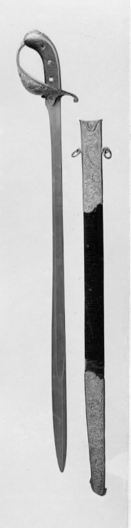 Modellenlig. På fästet rester av signatur: "ELL & CO STOCKHOLM". Klinga rak, delvis tvåeggad, s.k. Hafströms-klinga.