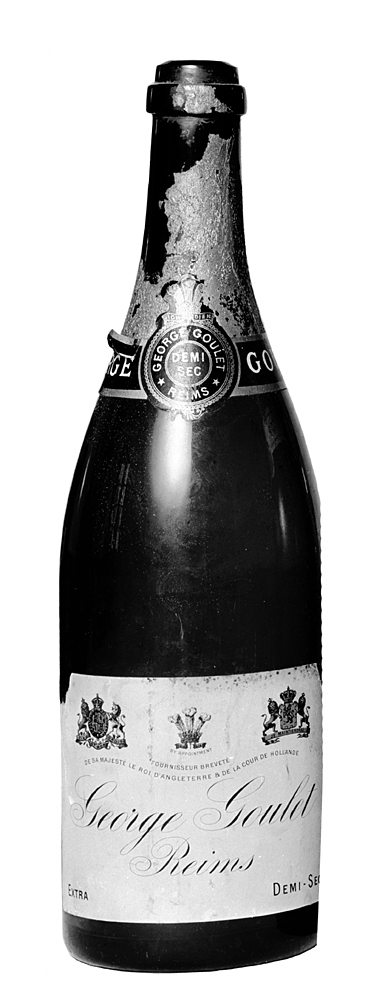 GEORGE GOULET, Reims, demi-sec, femton helbuteljer Av mörkgrönt glas. Cylindriska, med sluttande skuldra och lång smal hals med stärkring; bottnen konisk, högt uppskjutande. Etikett vit, på denna text med firmanamn i svart, dessutom upptill i färger Englands och Hollands riksvapen samt en hjälmkrona med hjälmprydnad och bindel. Upptill på skuldran två runda etiketter, varpå i guld mot svart botten text som på den vita etiketten. Kapsylfragment av kornigt stanniolpapper i guld, långt nedlöpande på halsen. Höjd: 30,5 cm.; diameter: 9,2 cm.