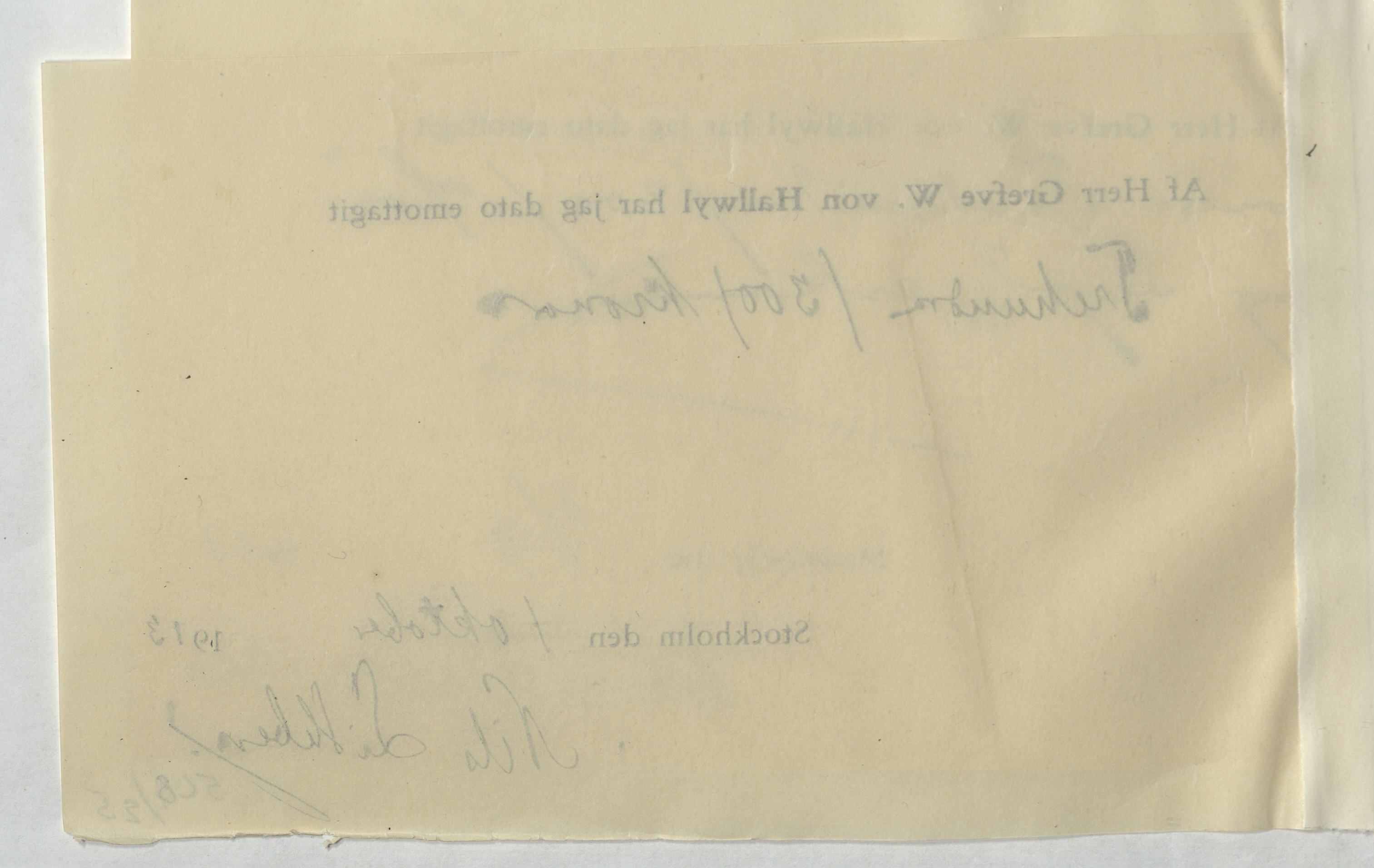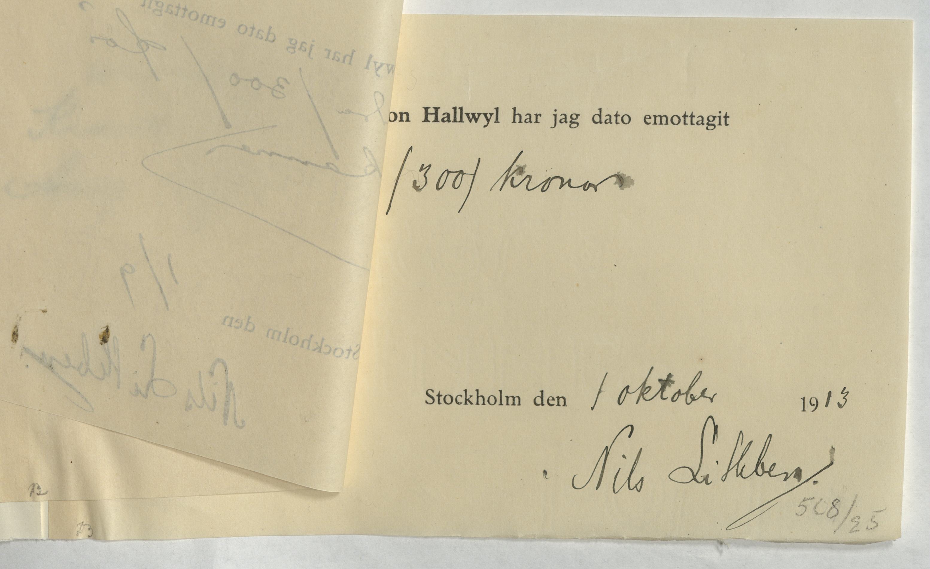 Kvitto gällande pengatransaktion mellan W. von Hallwyl och Nils Lithberg. Stockholm, 1913. Kvittot av misstag sammanlimmat med annat arkivmaterial.
