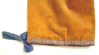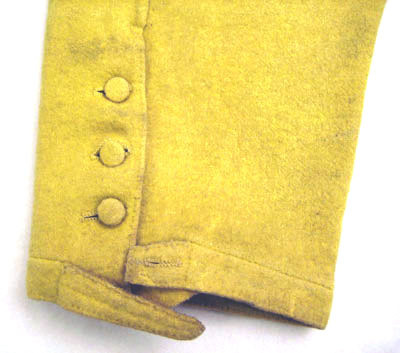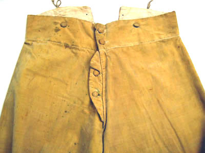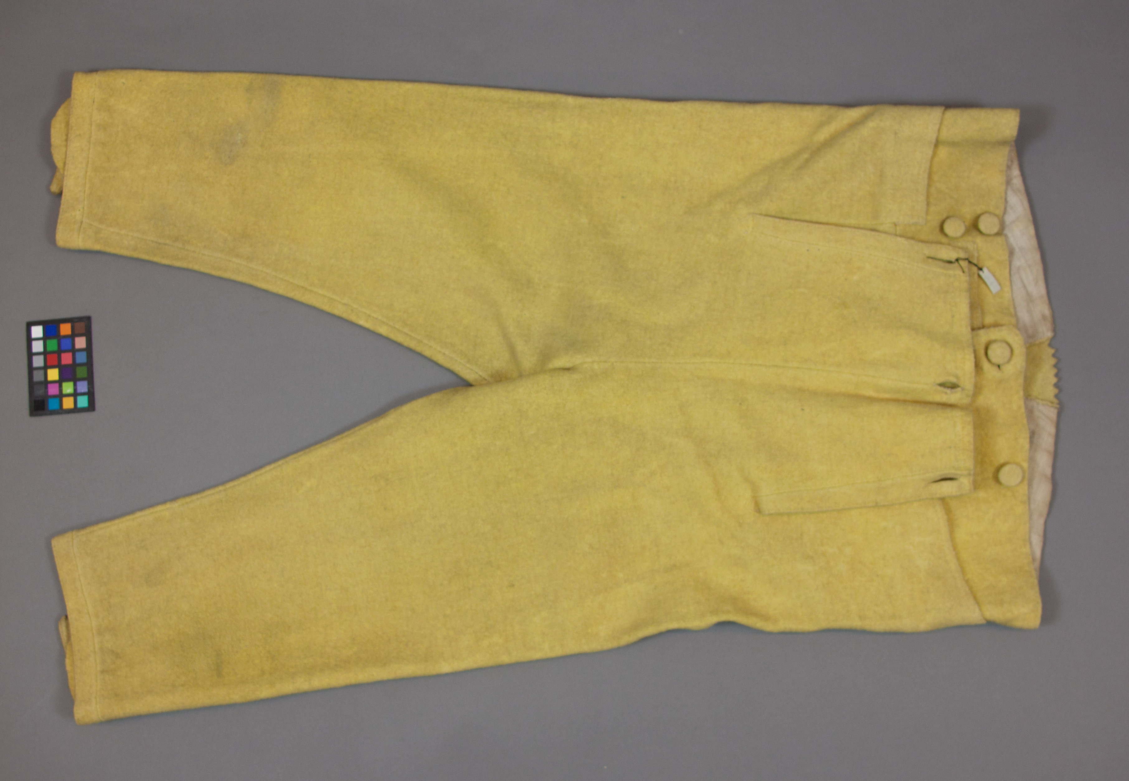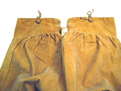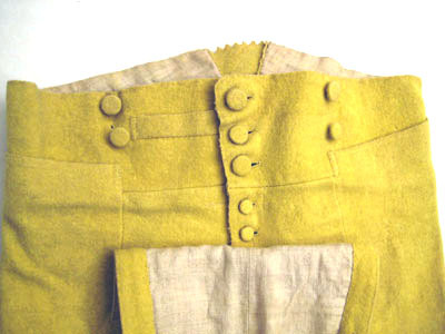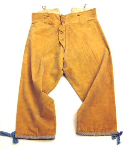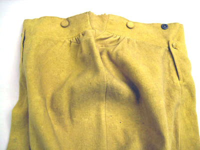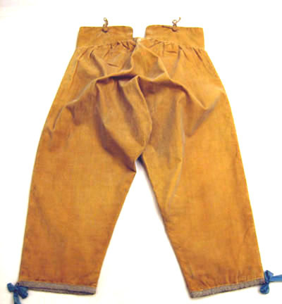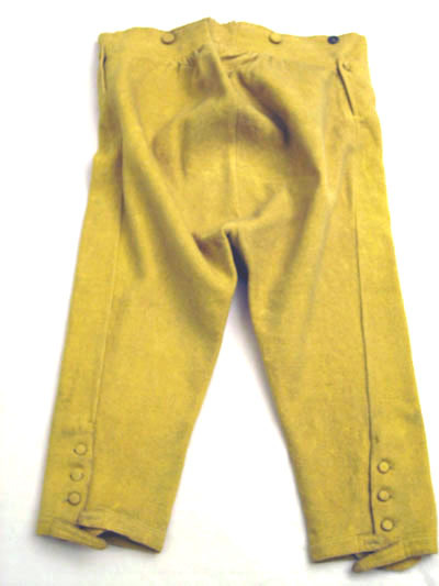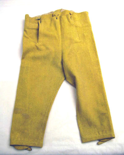 Ridbyxor med klaff sydd i gult ylletyg. Modellen är smal. Klaffen är 190 m djup och 240 mm bred. Fickor på varje sida knäpps baktill med en knapp, 170 mm bred och 170 mm djup. Linning är bred framtill och knäpps med fem knappar därav tre är 20 mm breda och två är 13 mm breda. Linningen är 940 mm i omkrets. Baktill är byxan rymlig och på linningen är två knappar, 20 mm breda samt en längst ut till höger i svart järn med fyra hål, 18 mm bred. Längst ned på båda byxben är ett sprund 150 mm lång med tre sydda knapphål och tre knappar. Alla sömmar är förstärkta med linnelärft. Invändigt i linningen är en text skriven " Hellberg".