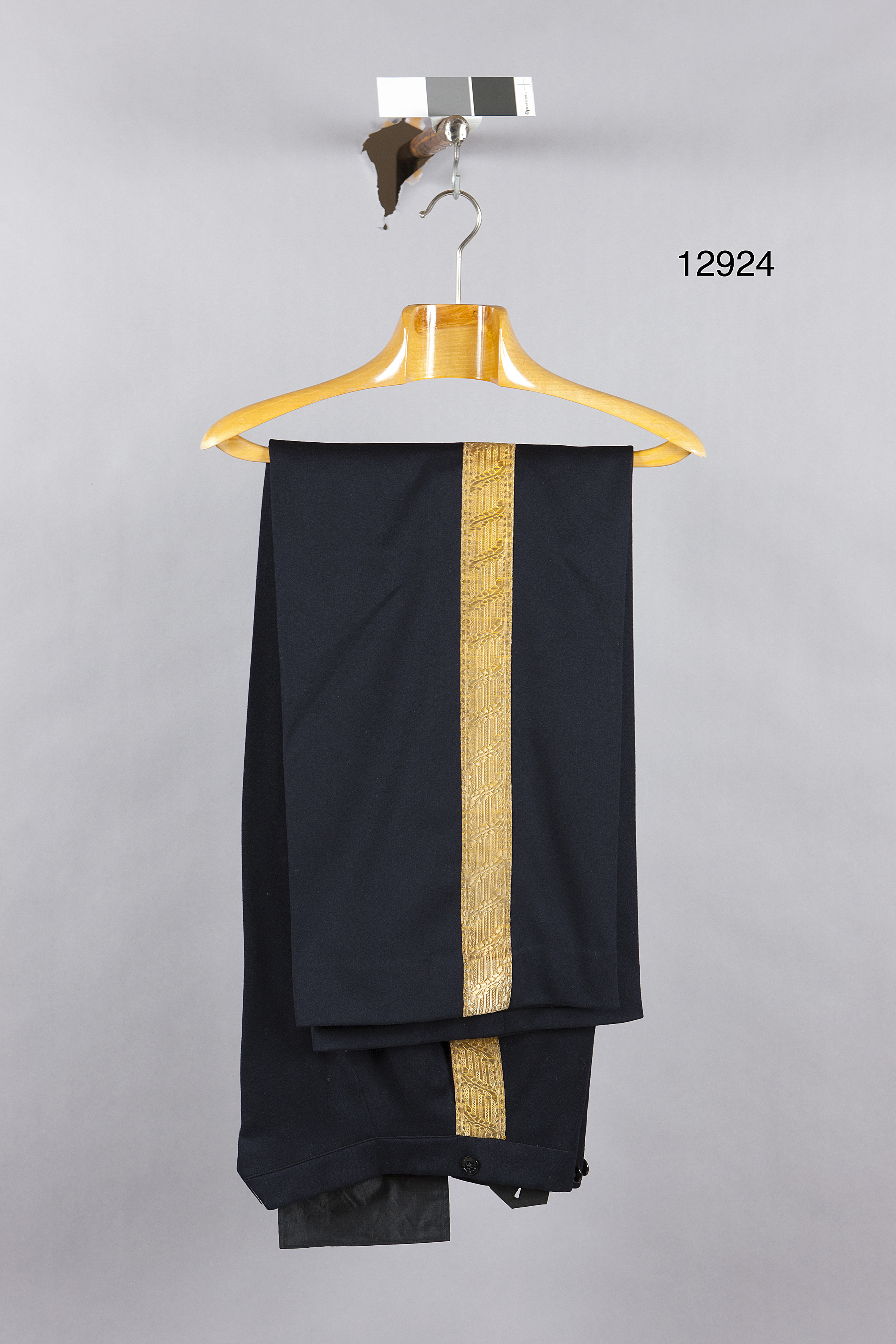 Modellenliga långbyxor av mörkblått kläde med guldgalon. Gylf med se mörkblå skålformiga plastknappar. Upptill hake och hyska med på ovansidan: "MILITÄR EKIPERINGS A.B." Utefter byxornas överkant fyra mörkblå knappar utvändigt och två blekgula vita invändigt vid sprundet bak. Knapparna som föregående. Sidsömsfickor och stolpficka baktill t.h. Foder av vit yllesatäng. Fickfoder av svart yllekypert. Grenfoder av vit yllesatäng. Framtill en slejf av svart ylletuskaft som knäpps i en av gylfknapparna. På slejfen en vit sidenetikett med kunglig krona: "Militär Ekiperings a.B// KUNGL. HOFLEVERANTÖR// MEA // Stockholm, den 9:11 1938 //. Herr H.K.H // Prins Wilhelm". I linningen två vita tyghällor med knäppen och baktill en upphängningsögla.