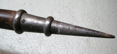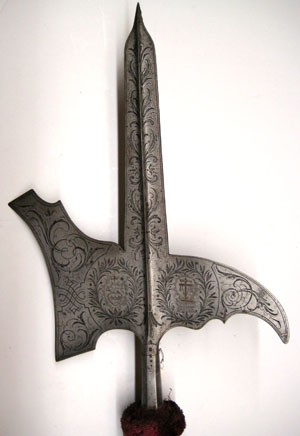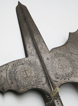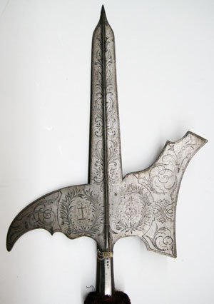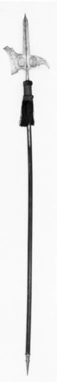 Bred stötklinga med mötande skär, tydlig rygg och snabbt avsmalnande spets. Asymetriskt yxblad med konkav egg. Övre kanten konturerad, den nedre med rundad urtagning. Nedåtsvängd hake med bred bas och konturerad undre kant. Heltäckande etsad dekor, lika utförd på bägge sidor. På klingan stiliserade blad. På yxa och hake fält med kantlinjer och arabeskliknande mönster. I mitten två lagerkransar, den första omgärdar ett altare med kors och texten INRI och den andra ett hjärta med törnekvist och ett kors. Alla detaljer innanför lagerkransarna har rester av förgyllning. Hals övergående i holk, konisk med åttsidigt tvärsnitt. På ena sidans övre del fyra punkter i rad, nedåt minskande i storlek. Påsmidda skenor, L 490 mm, fästade med tre mässingsskodda nitar. Stång av finådrigt trä betsat mörkbrunt. Cirkulärt tvärsnitt, diam 35 mm. Doppsko av stål, L 177 mm, konisk och spetsig med två ringar.
