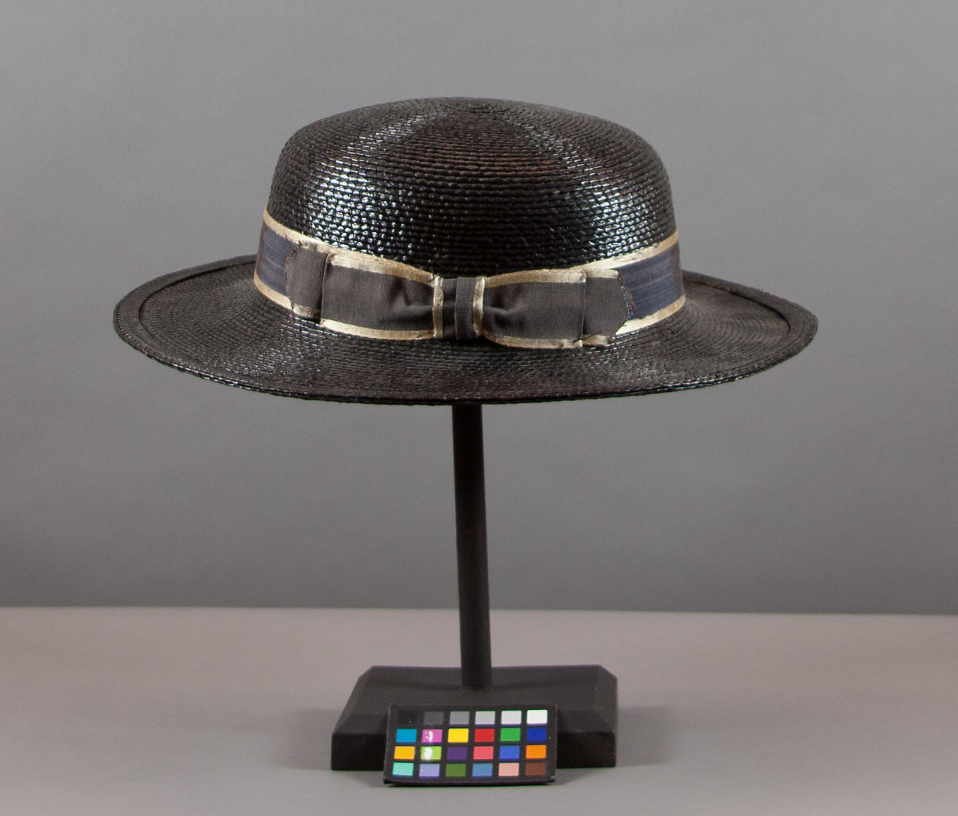 Mörkt blå stråhatt med rund kulle och runt brätte. kring kullen ett numera blekt, guldkantat sidenripsband (ursprungligen mörkt blått), format till en rosett på vänster sida. Firmamärke i guldtryck på den grå svettremmen: "Hobson & Sons / Official Red + CONTRACTORS".