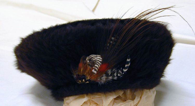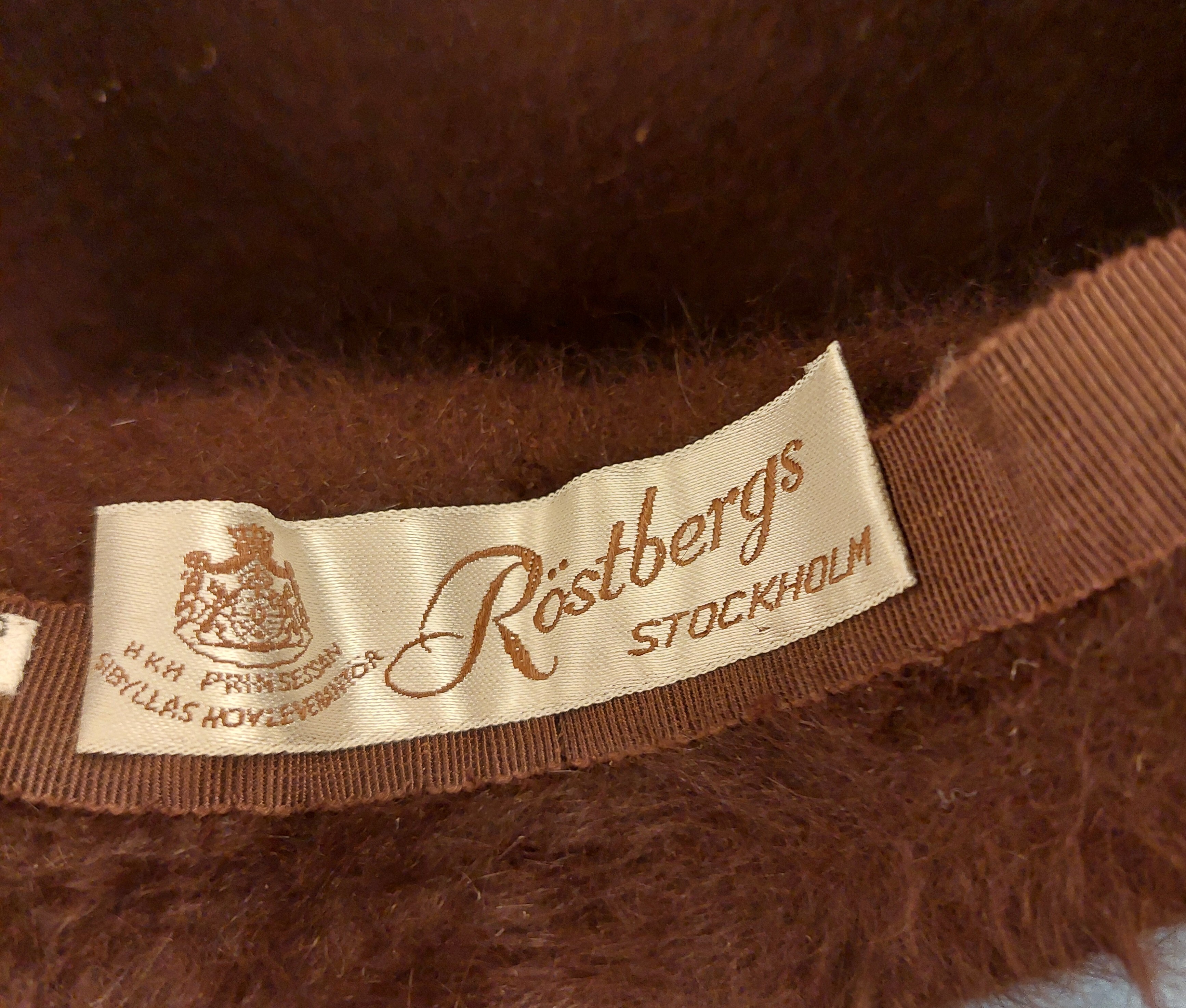 Brun vinterhatt i baskermodell. Av långhårig hårfilt, kallad mufflon. Hög framtill, med hägerfjädersmontering, baktill dubbelvikt så att hatten blir sluttande. Ripsband. Etikett av vitt siden med Sibyllas vapen och text: "HKH PRINSESSAN // SIBYLLAS HOVLEVERANTÖR", samt tillverkarens namn bredvid: "Röstbergs // STOCKHOLM". Datering: 1970. Buren till päls av prinsessan Sibylla.