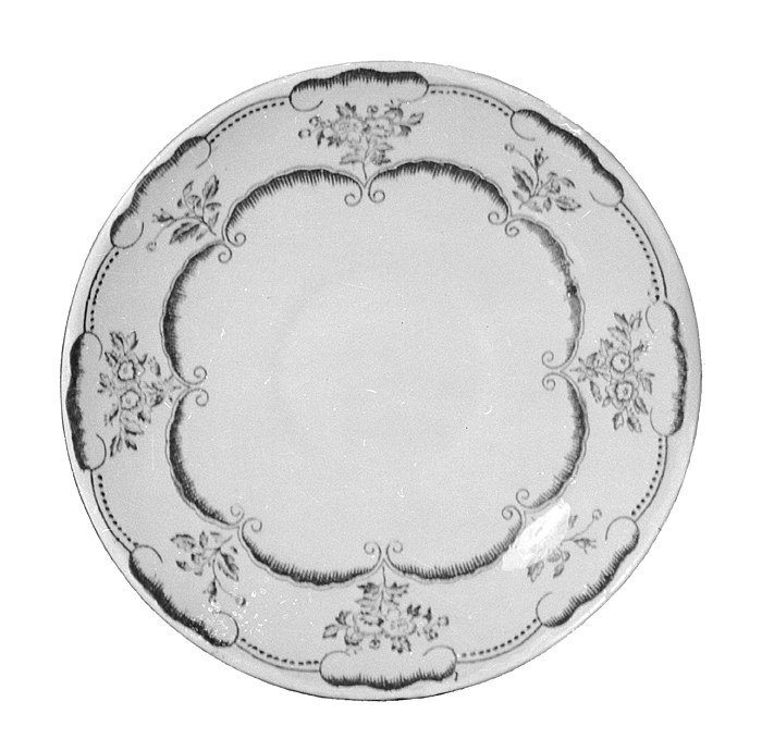 TEFAT av porslin. Skålformigt, med liten plan botten samt på låg fotkant. Dekor i blått under glasyren. På insidan kring brättet en ornering av sammanhängande fransliknande bågar i två rader, de i inre raden med hoprullade ändar, mellan bågarna utgående utåt en kvist med blad och blommor, varannan kvist större; bågarna i yttre raden glest ställda, en mitt över varje kvist, mellan de sistnämnda bågarna en pärlrand och en slät rand. H 1,9 cm. D 13,1 cm.