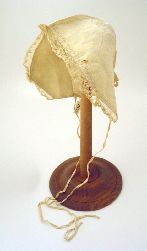 Vit barnmössa av lärft (linne?) med spetskant, 12 mm bred, samt en 5 mm bred broderad dekoration i form av en stiliserad blomsterslinga längs de främre kanterna. Mössan är sydd i två delar med ett bakstycke och ett framstycke som förenas av en söm som löper över bakre delen av hjässan, från öra till öra. Förstärkning fram i form av dubbelt tyg, 55 mm bred i mitten upptill. Mössan har avfasade sidokanter nedtill. 4 mm breda knytband är fästa bak i nederkanten i ett flätliknande mönster, för att knytas under hakan. Fasta knytband, c:a 410 mm långa.