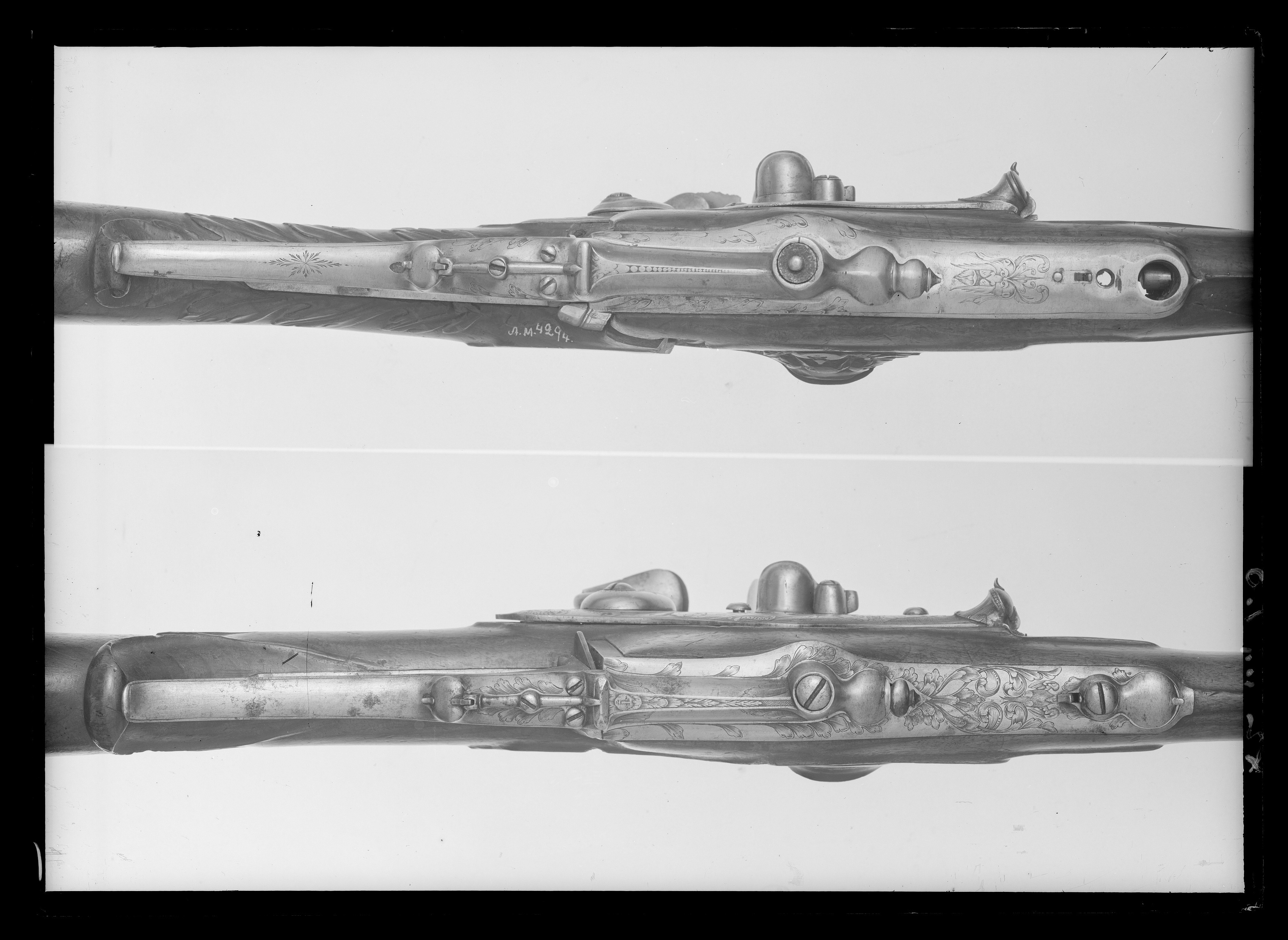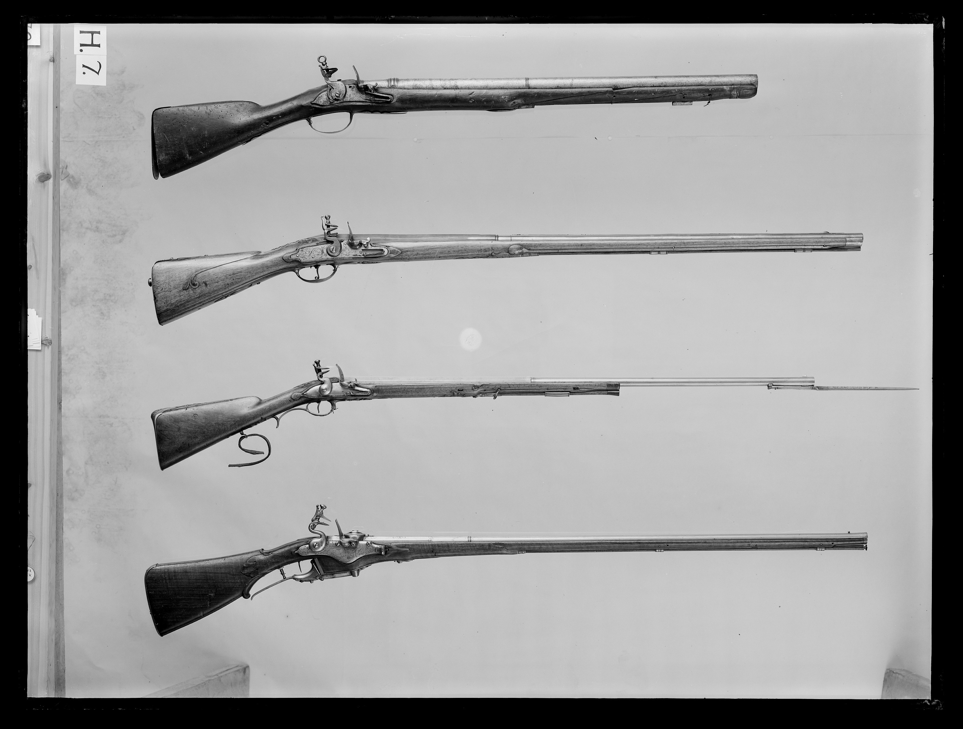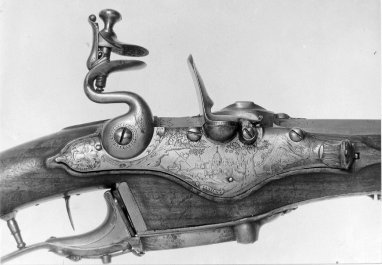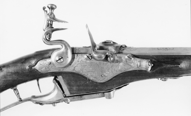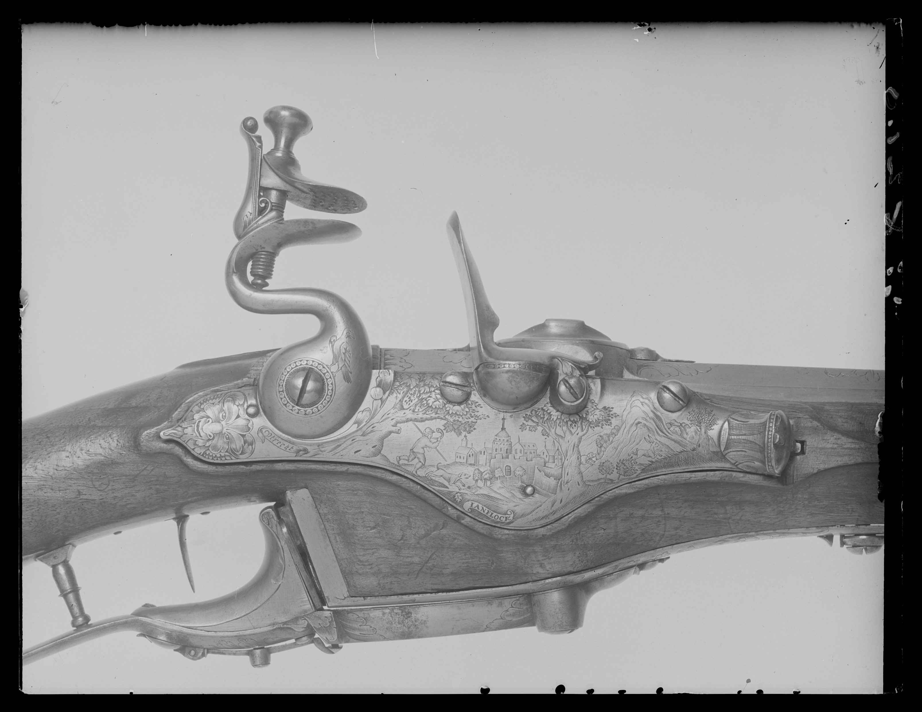 Rund, slätborrad pipa av stål. Kammren femsidig, framtill med fasade kanter. Kammarstycket graverat med bladornament och signatur: " IAN // FLOCK " i en kartusch. På kammaren cylinder med fastskruvat lock, därpå v-formig skiktskåra med inåtvikta kanter. Riktmedel: Knoppkorn av mässing. Fästning: Tre häften. Pipan fäst med tre pipstift av stål. Flintlås med något välvt låsbleck av hjullåsform, l: 190 mm. Blecket graverat med en maskaron längst bak, framför hanen naturscen med jägare, i bakgrunden en stad. Längst fram slutar blecket i en tratt med ett ovalt lock. Nedanför hanen graverat "Utrecht", vid kanten nedanför fängpannan: " IANFLOCK ". Välvd, kraftigt svängd, s-formig hane med en graverad fågel. Lös överkäke, käkskruv med koniskt huvud. Batteri med åsat eldstål och klump på buken. Rundad fängpanna med graverad kant. Låsets insida konstruerat för Kalthoff-systemet för nio skott per laddning. Fästning: Rak avtryckare. Brun helstock av valnöt med tidig fransk kolv, snidat blad vid kolvhalsen, snidad markering på sidbleckets plats med en halvcirkelformig hornbit. Beslag av stål., bakplåt samt balusterformiga rörkor, spets-, mellan och överrörka, smalt näsband. Underbeslag enligt Kalthoffs system av stål och mässing med graverad rankdekor. Tillbehör: Laddstock, l: 940 mm av valnöt, stålskodd med platt knopp av stål.