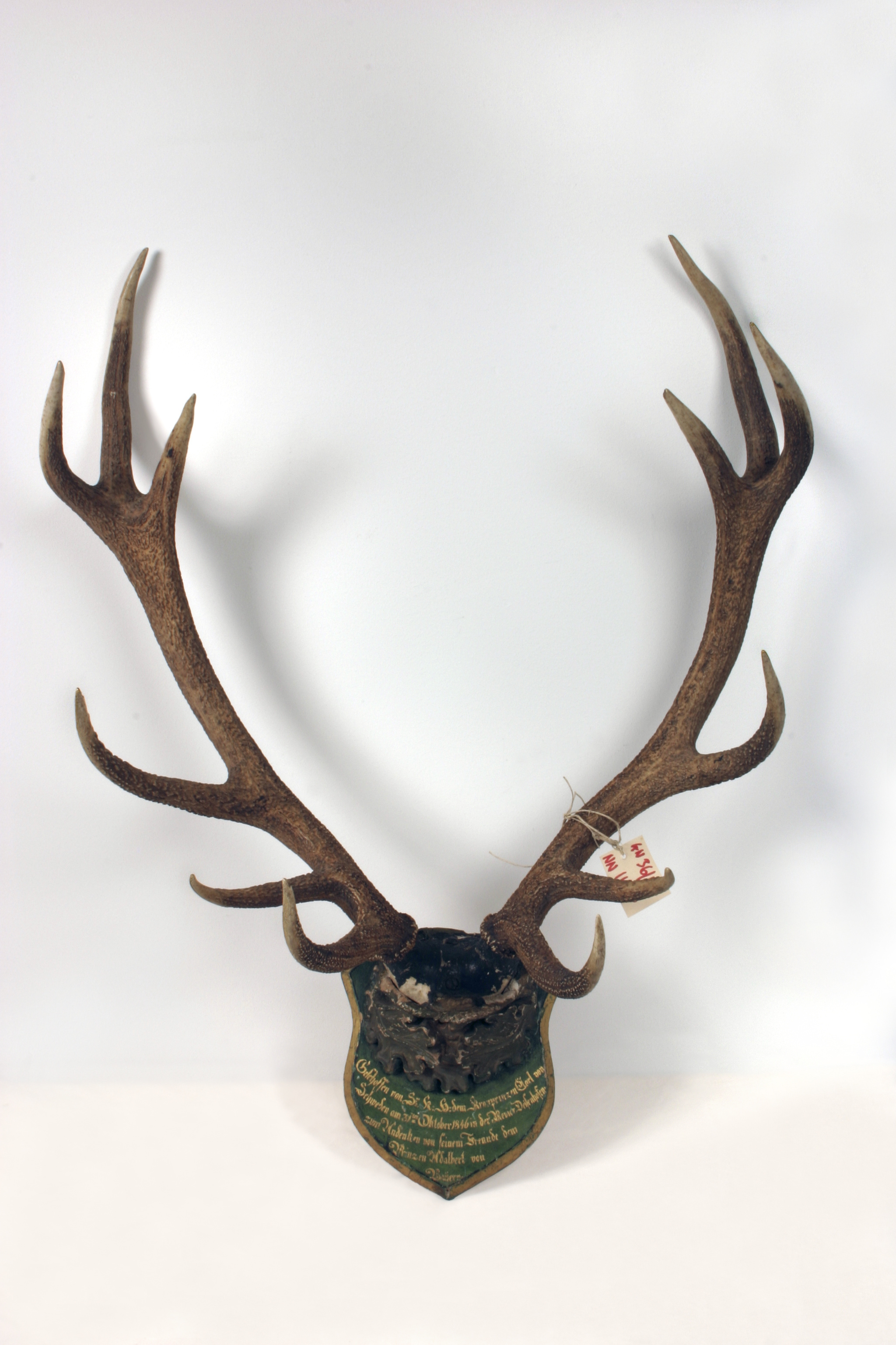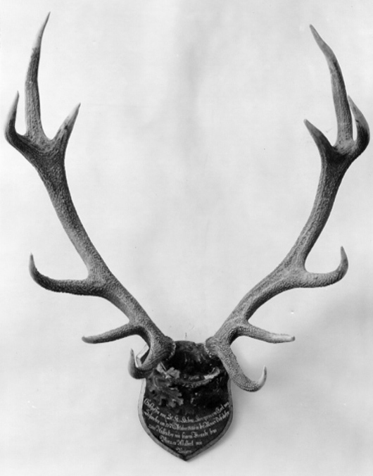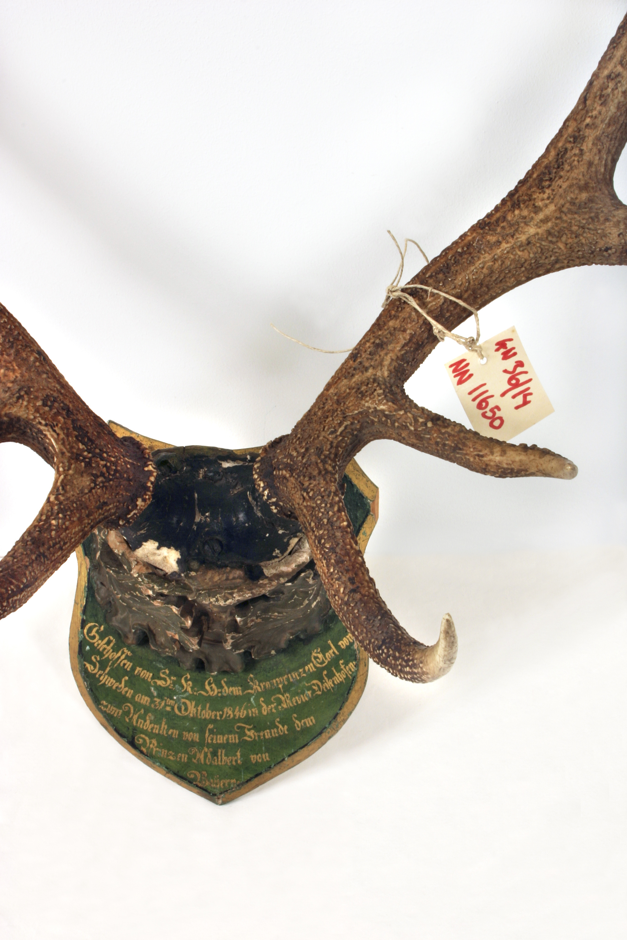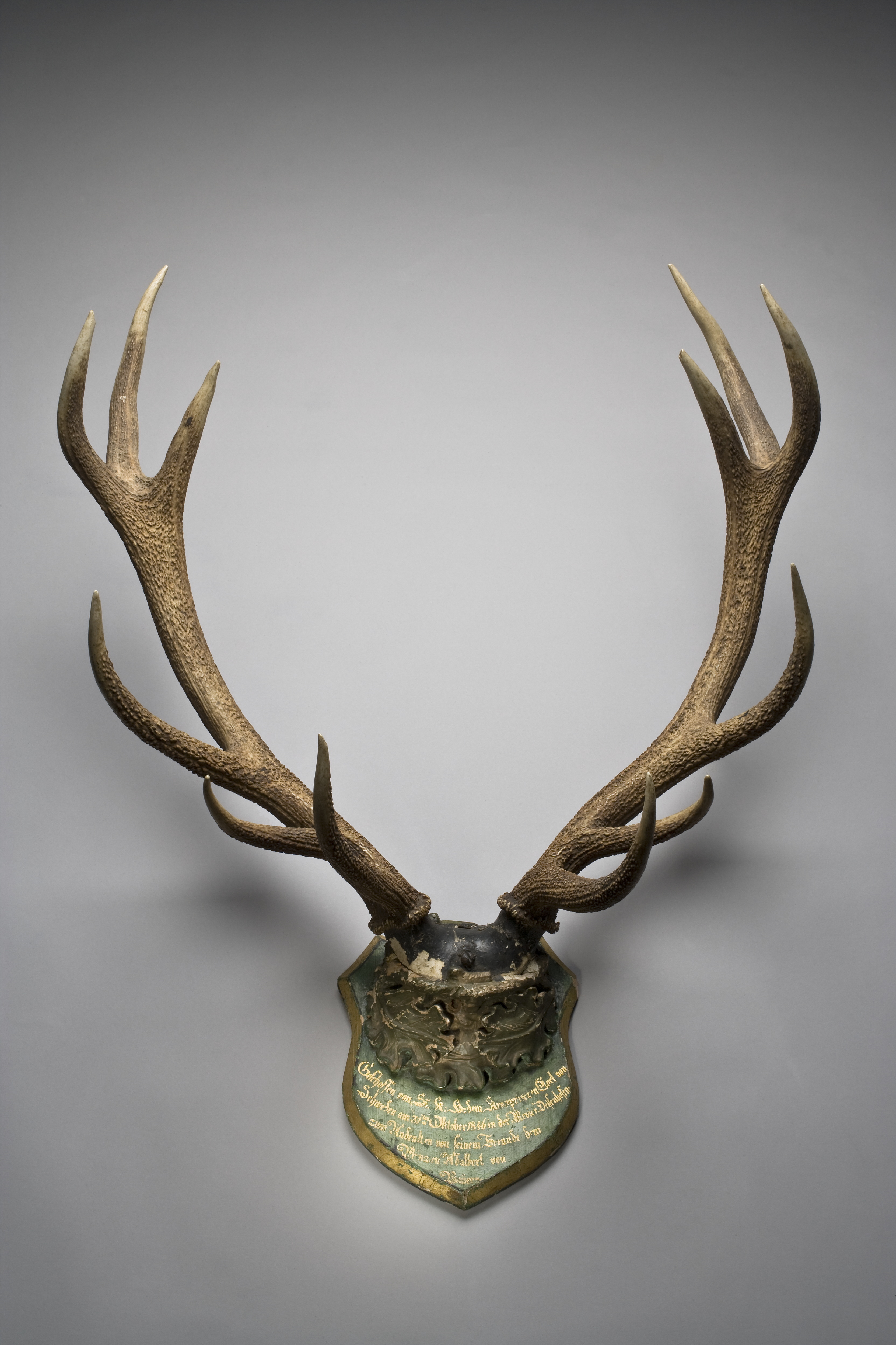 Hornkrona med 12 taggar. Svartmålad rosenstock, fastskruvad med två skruvar i snidad, grönmålad repstavskrans, omgiven av snidade eklöv, i sin tur monterade på sköldformig, grönmålad platta med fasad, guldmålad kant. På plattan guldtext: "Geschossen von S:r K:H: dem Kronprinzen Carl von // Schweden am 31:ten Oktober 1841 in der Revier Deisenhofen // zum Andenken von seinem Freunde dem // Prinzen Adalbert von // Bayern". På baksidan urtag och däröver fastskruvat en rektangulär stålplatta med rektangulärt hål. Omkrets stänger nertill 130 och 135 mm, upptill 120 och 125 mm, utslag 535 mm.