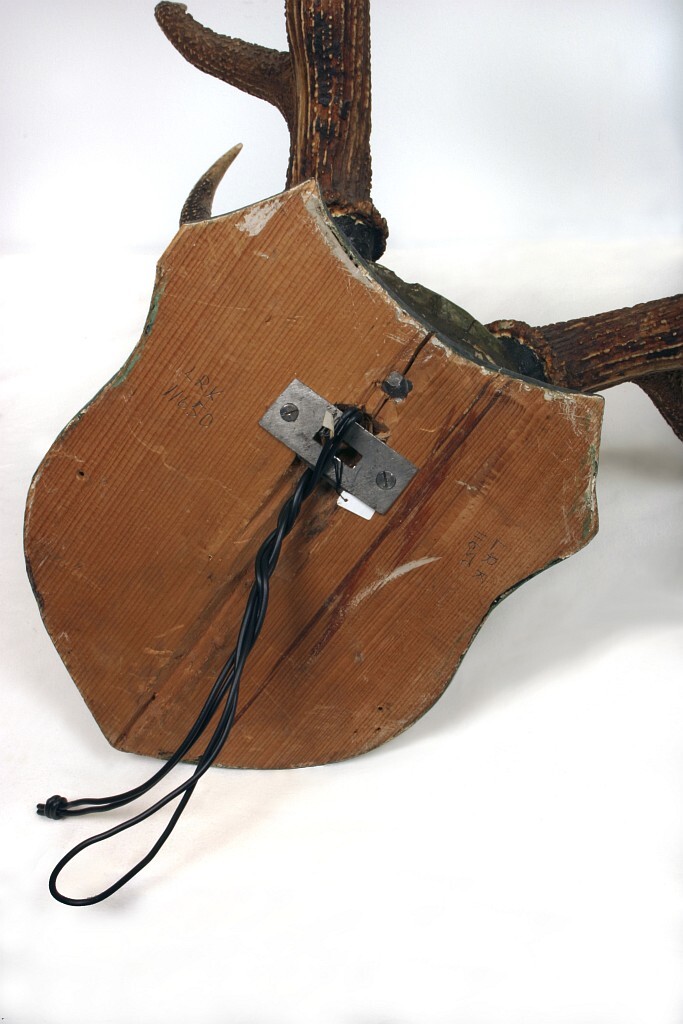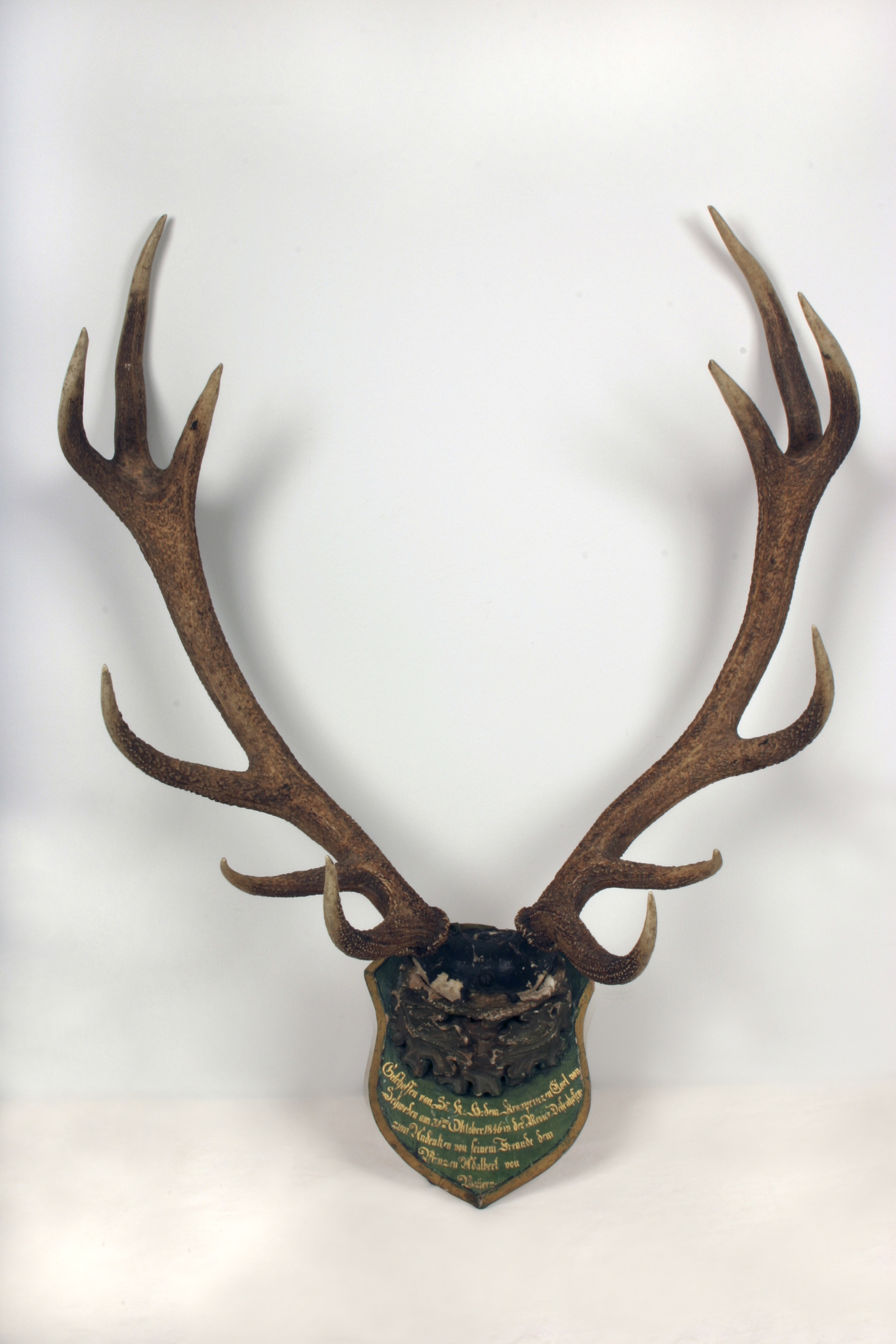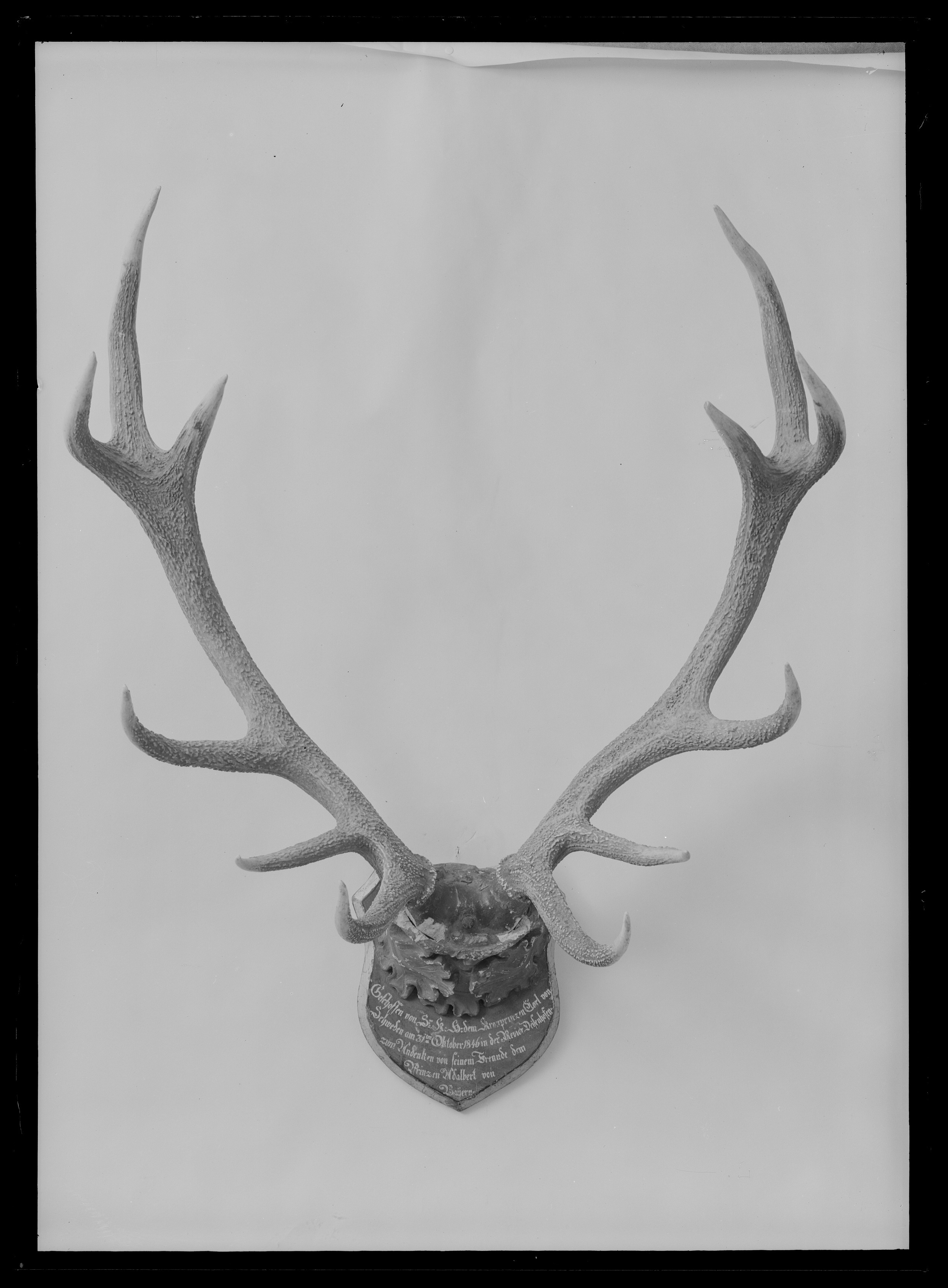 Hornkrona med 12 taggar. Svartmålad rosenstock, fastskruvad med två skruvar i snidad, grönmålad repstavskrans, omgiven av snidade eklöv, i sin tur monterade på sköldformig, grönmålad platta med fasad, guldmålad kant. På plattan guldtext: "Geschossen von S:r K:H: dem Kronprinzen Carl von // Schweden am 31:ten Oktober 1841 in der Revier Deisenhofen // zum Andenken von seinem Freunde dem // Prinzen Adalbert von // Bayern". På baksidan urtag och däröver fastskruvat en rektangulär stålplatta med rektangulärt hål. Omkrets stänger nertill 130 och 135 mm, upptill 120 och 125 mm, utslag 535 mm.