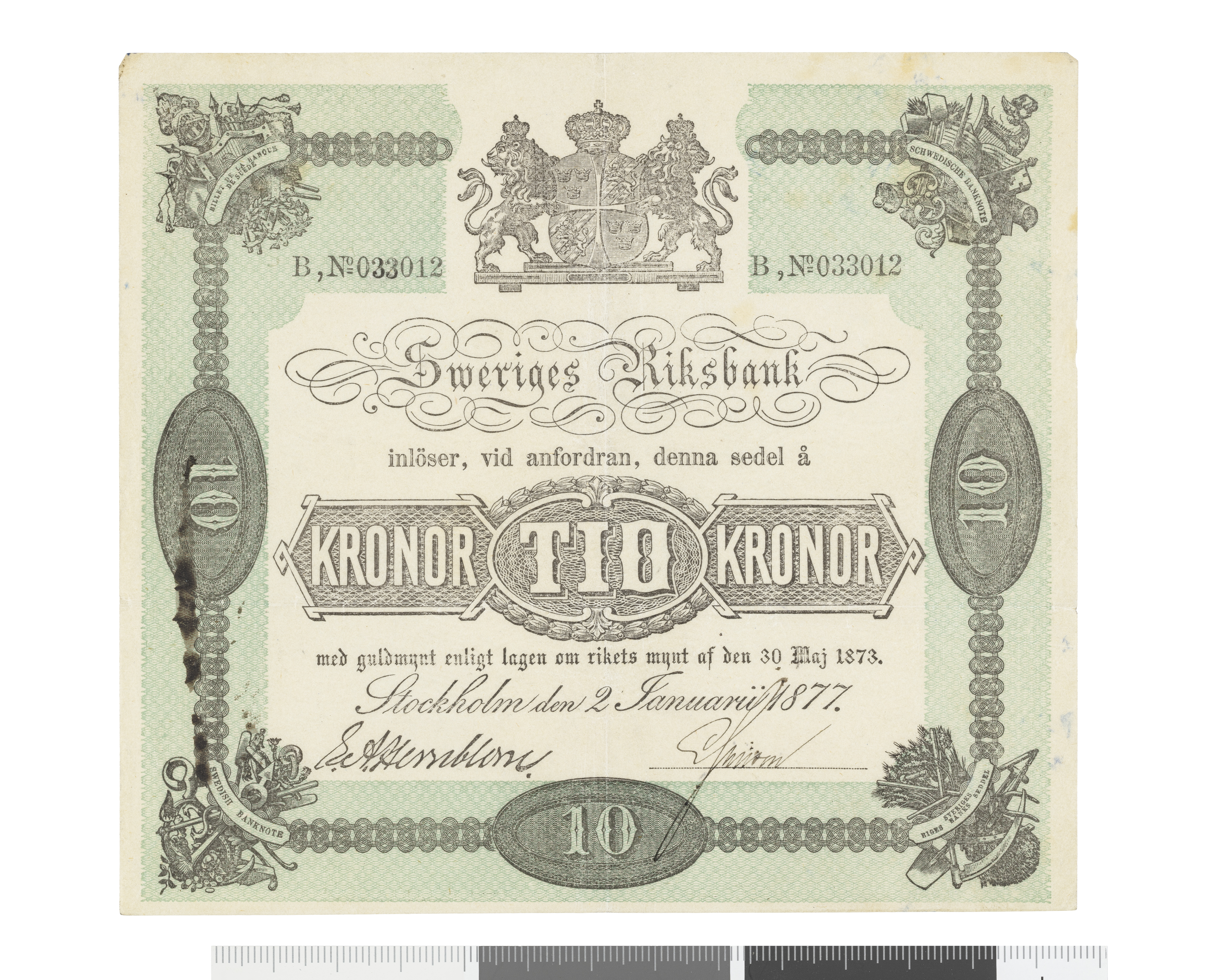Upphov: Sveriges riksbank. Media: Bonnevier, Helena. Ekonomiska museet - Kungliga myntkabinettet/SHM, (PDM) Upphovsrätten till detta verk har gått ut och är därmed fritt att använda på alla sätt. Ange gärna upphovsperson om denne är känd.