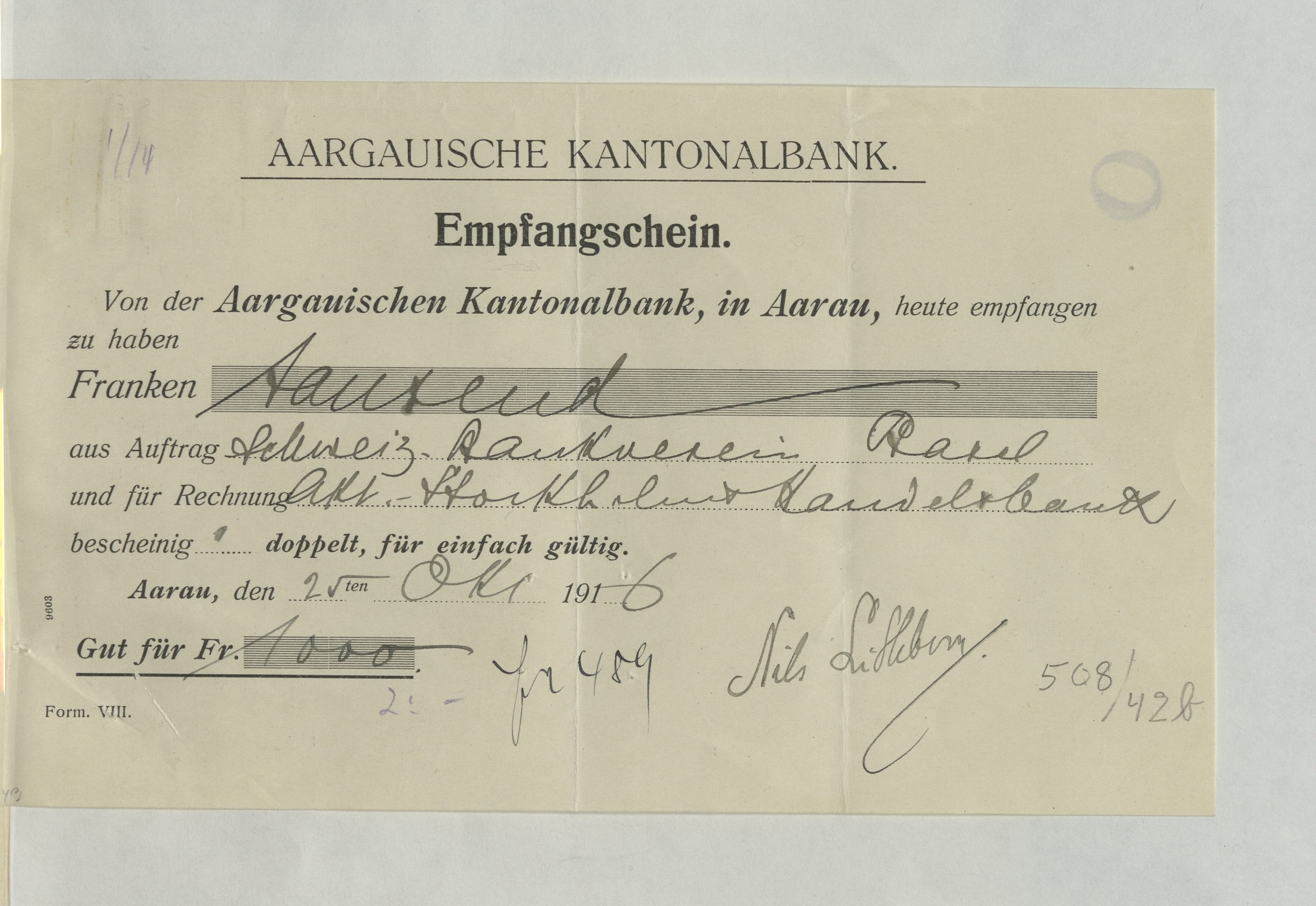 Verfikationer rörande Nils Lithberg, gällande banköverföring mellan Aargauischen Kantonalbank, Aarau, och Stockholms handelsbank, 1916.
