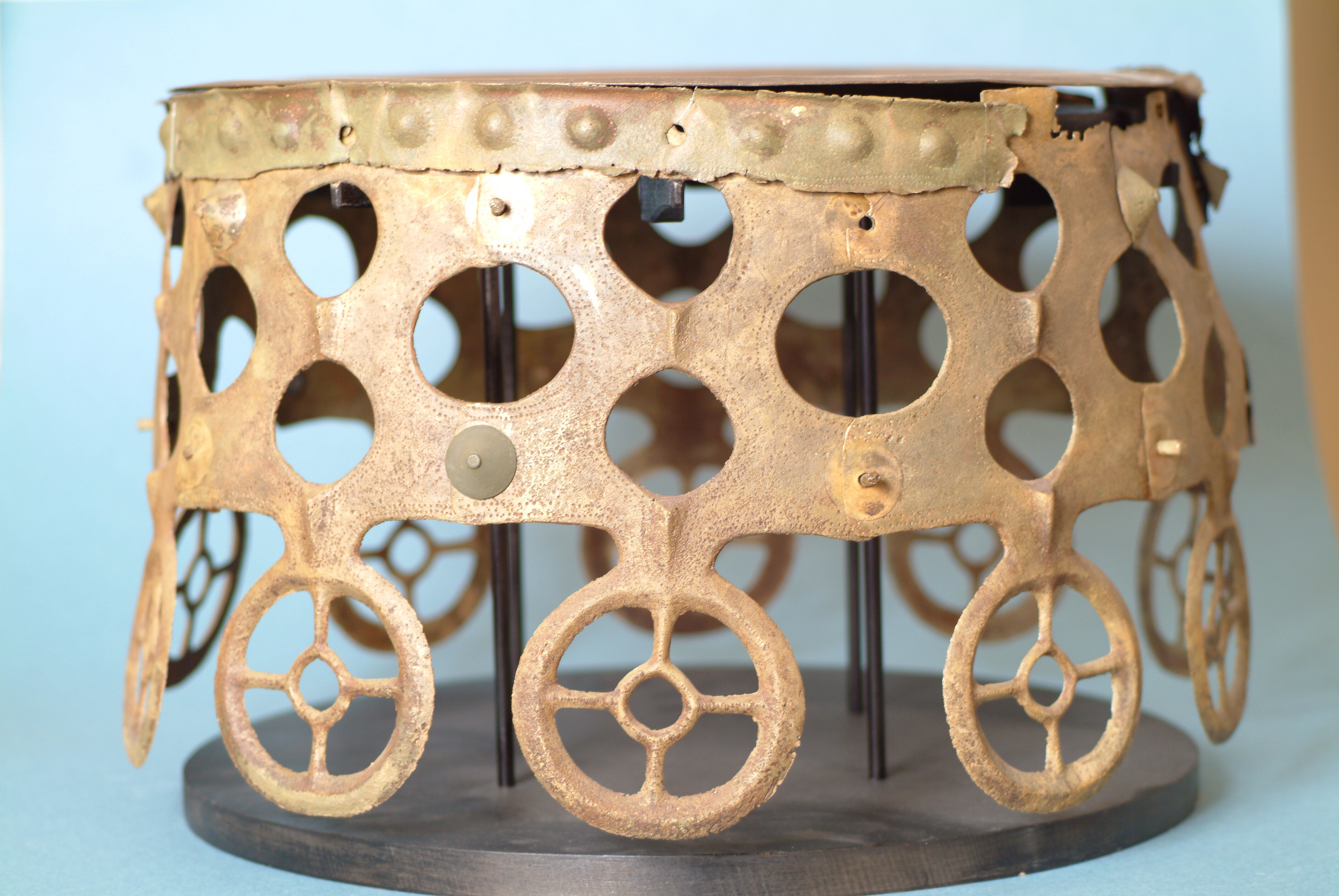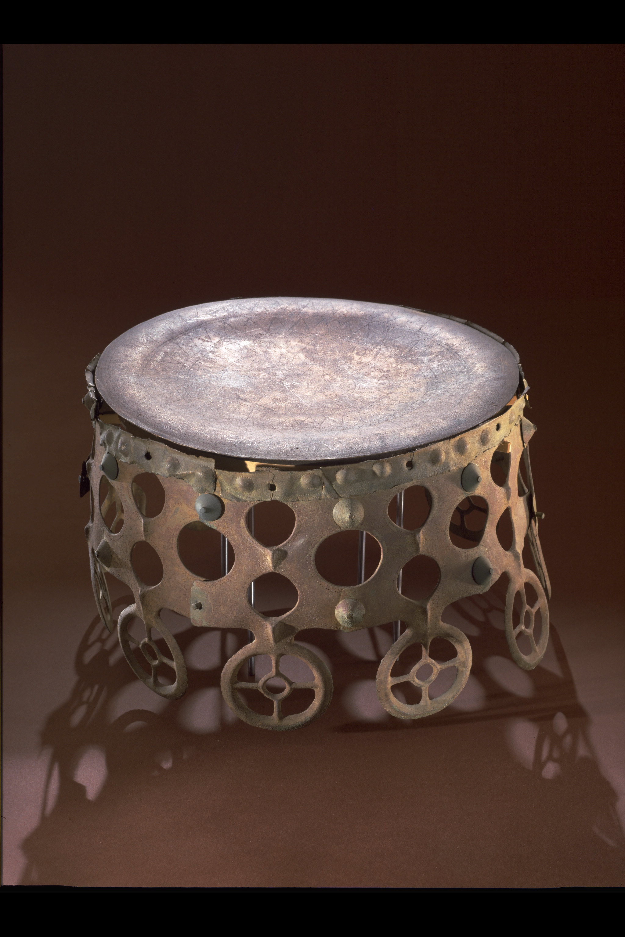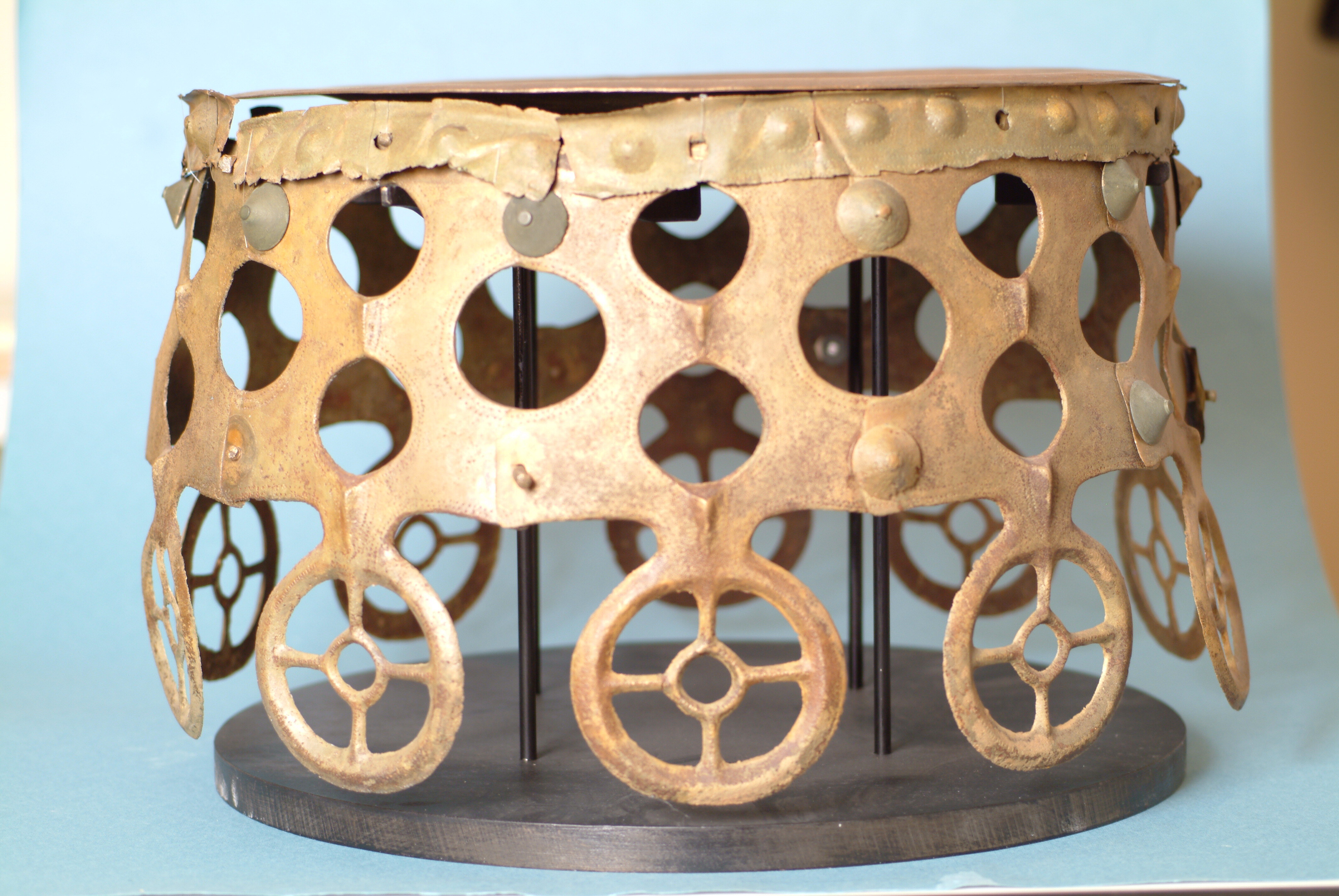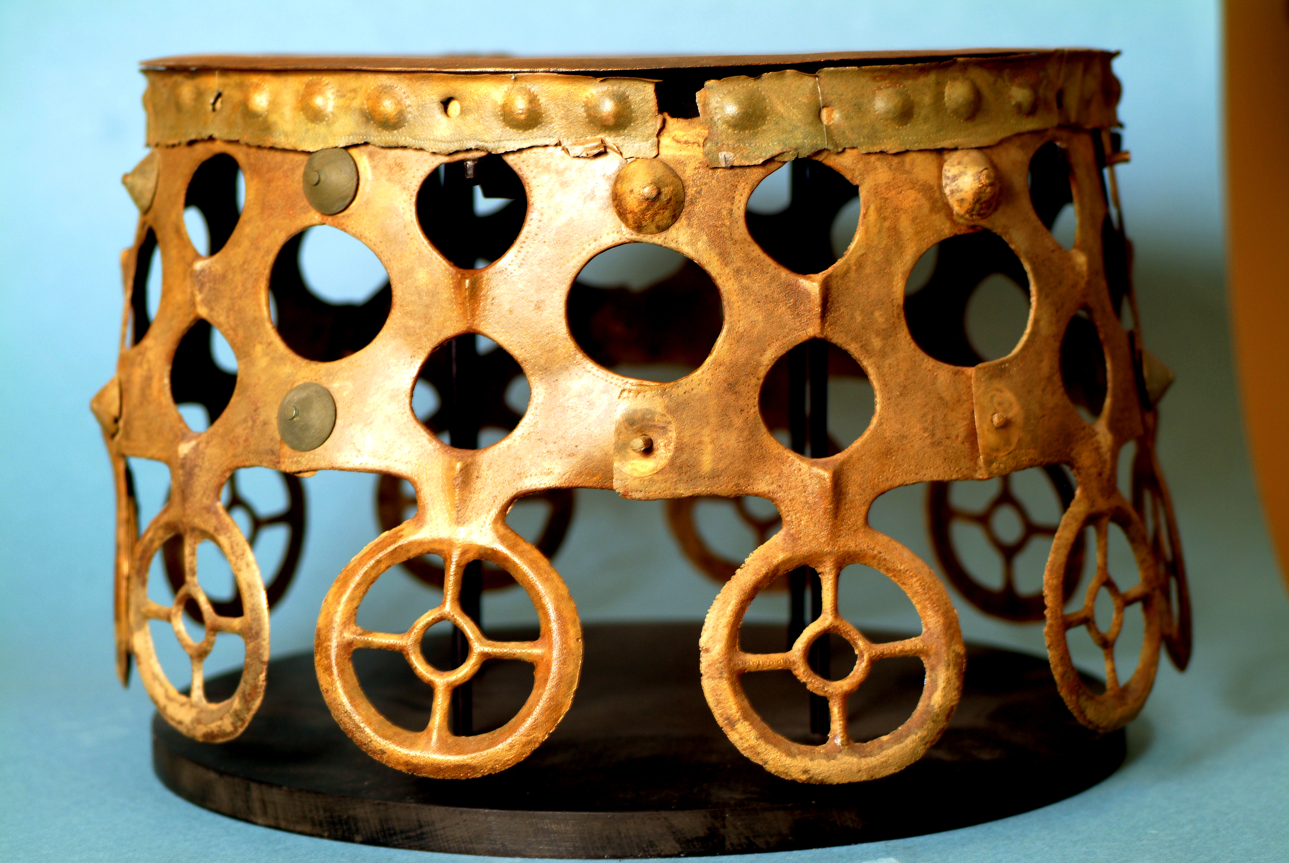 Kultföremål av brons, gjuten i flera delar. Består av en rund, platt skiva som är omgiven av en hög bård med runda hål och på övre kanten hjulformiga prydnader. På skivans uppåtvända yta är fem koncentriska kretsar av sex band med zigzaglinjer inpunsade, vilka sannolikt ska ge en bild av den strålande solen. Skivan vilar på en krans gjuten i tio delar med varandra hopnitade delar. Varje del slutar i ett hjul med fyra ekrar, en symbol för solen. De tio delarna är märkta under bronsålder med streck och punkter för att visa hur de ska sammanfogas. Nitarna är "ringnitar" med särskilt gjutna, stora, koniska huvuden. Totalt finns cirka 30 nitar. Datering osäker, kan vara äldre bronsålder men även yngre har framförts. En nästan exakt parallell finns från ett fynd i Hasfalva, på gränsen mellan Ungern och Österrike. Dekoren på skivorna avviker dock något. Detta exemplar förvaras på Soproni Muzeum, Ungern.