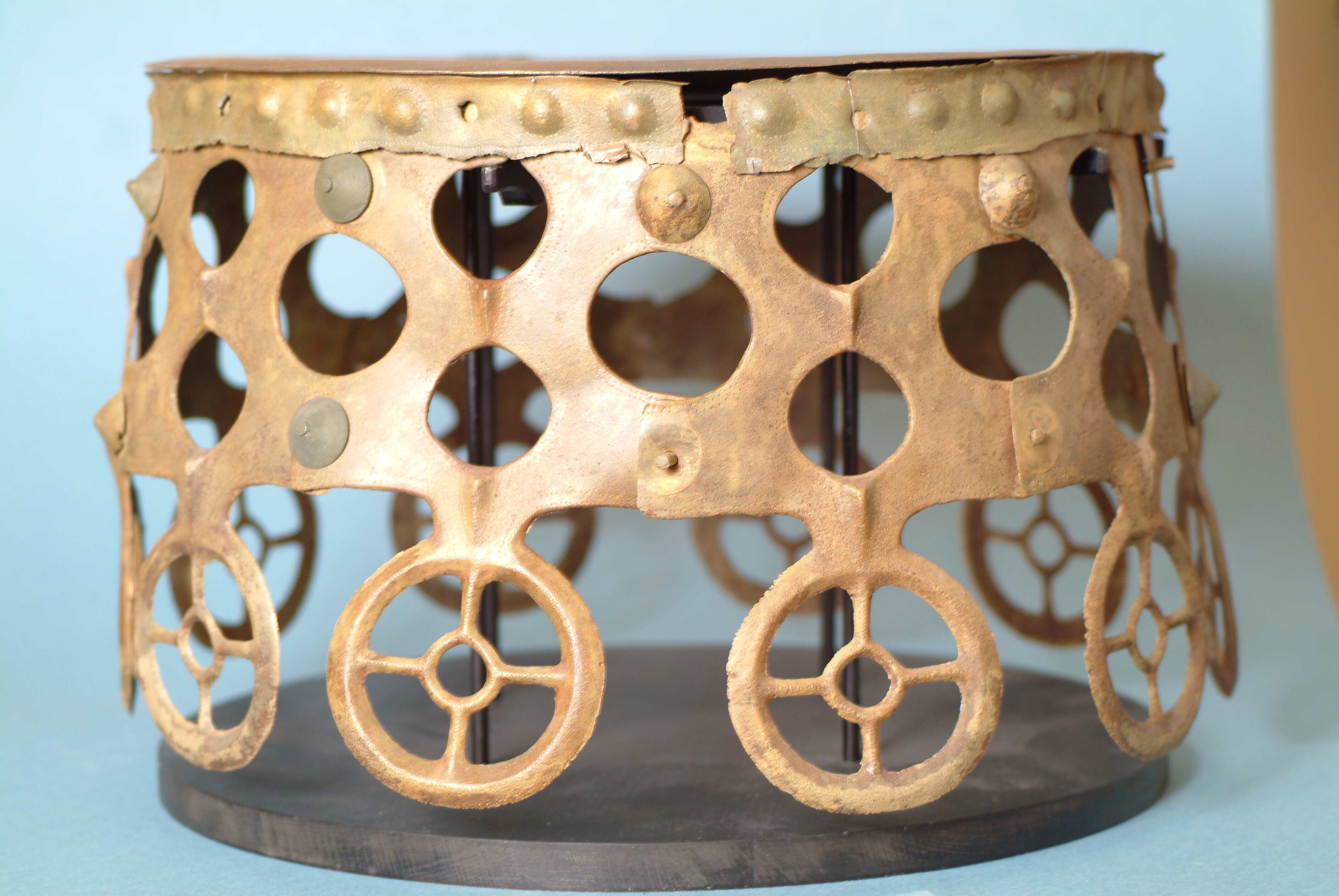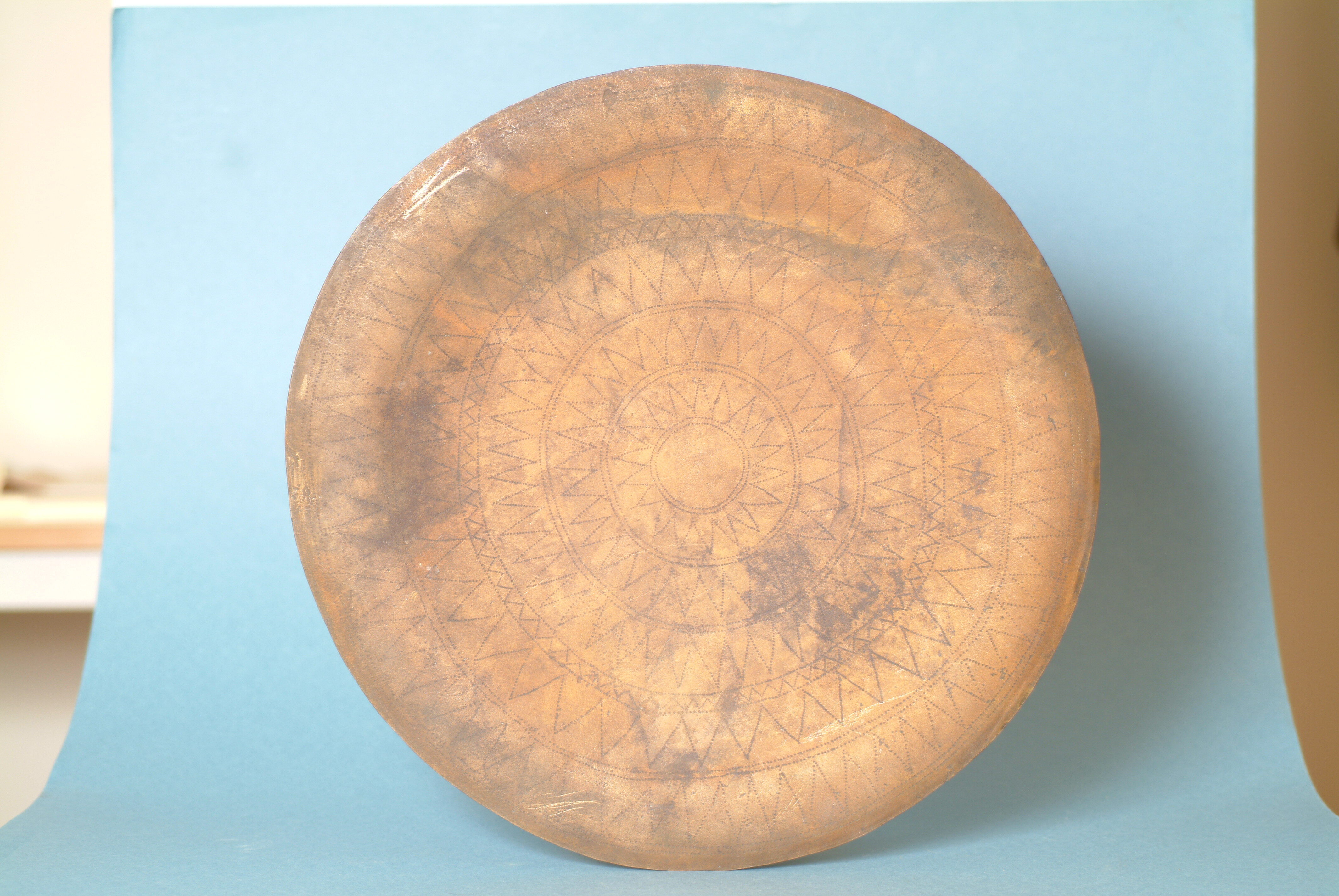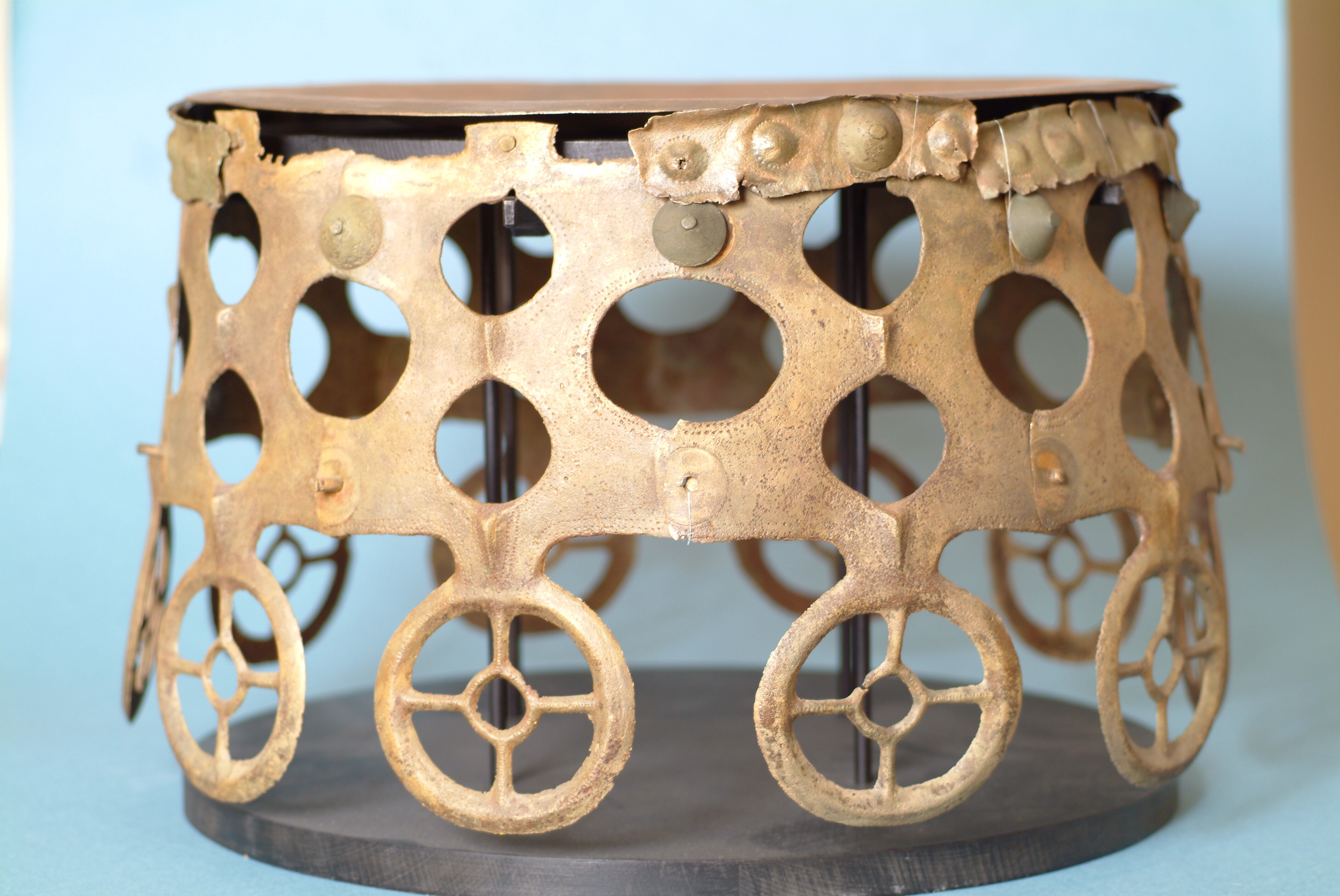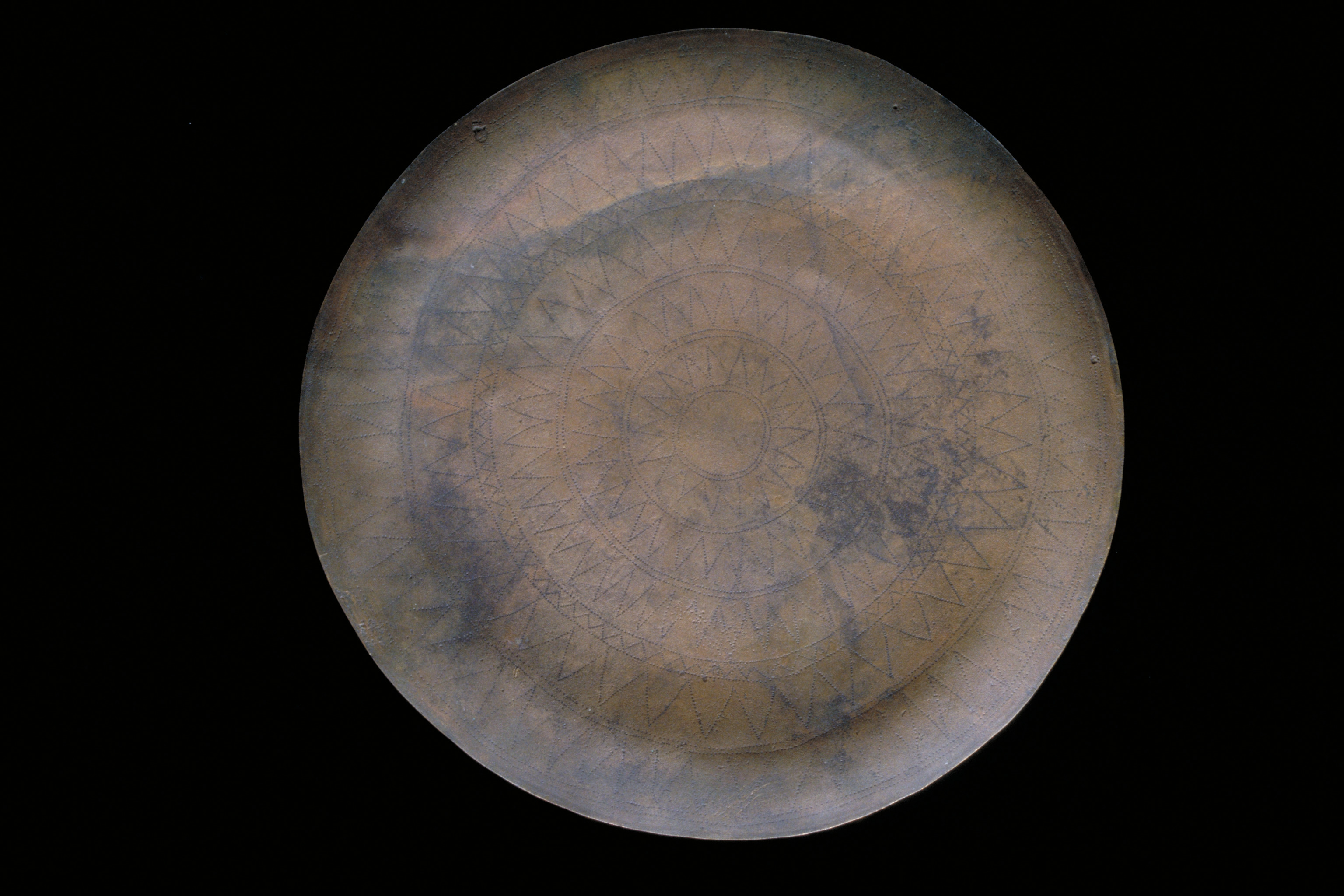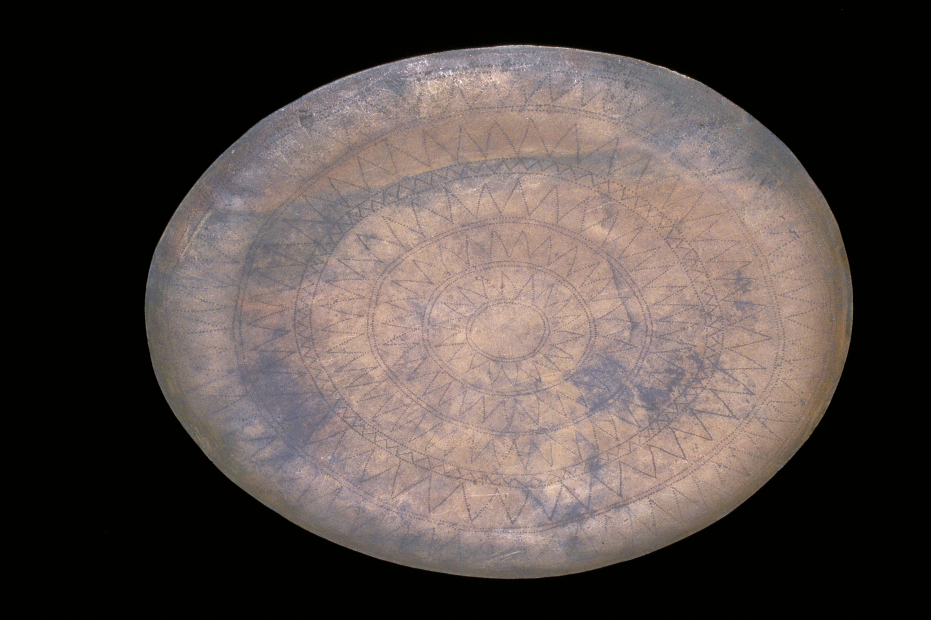 Kultföremål av brons, gjuten i flera delar. Består av en rund, platt skiva som är omgiven av en hög bård med runda hål och på övre kanten hjulformiga prydnader. På skivans uppåtvända yta är fem koncentriska kretsar av sex band med zigzaglinjer inpunsade, vilka sannolikt ska ge en bild av den strålande solen. Skivan vilar på en krans gjuten i tio delar med varandra hopnitade delar. Varje del slutar i ett hjul med fyra ekrar, en symbol för solen. De tio delarna är märkta under bronsålder med streck och punkter för att visa hur de ska sammanfogas. Nitarna är "ringnitar" med särskilt gjutna, stora, koniska huvuden. Totalt finns cirka 30 nitar. Datering osäker, kan vara äldre bronsålder men även yngre har framförts. En nästan exakt parallell finns från ett fynd i Hasfalva, på gränsen mellan Ungern och Österrike. Dekoren på skivorna avviker dock något. Detta exemplar förvaras på Soproni Muzeum, Ungern.