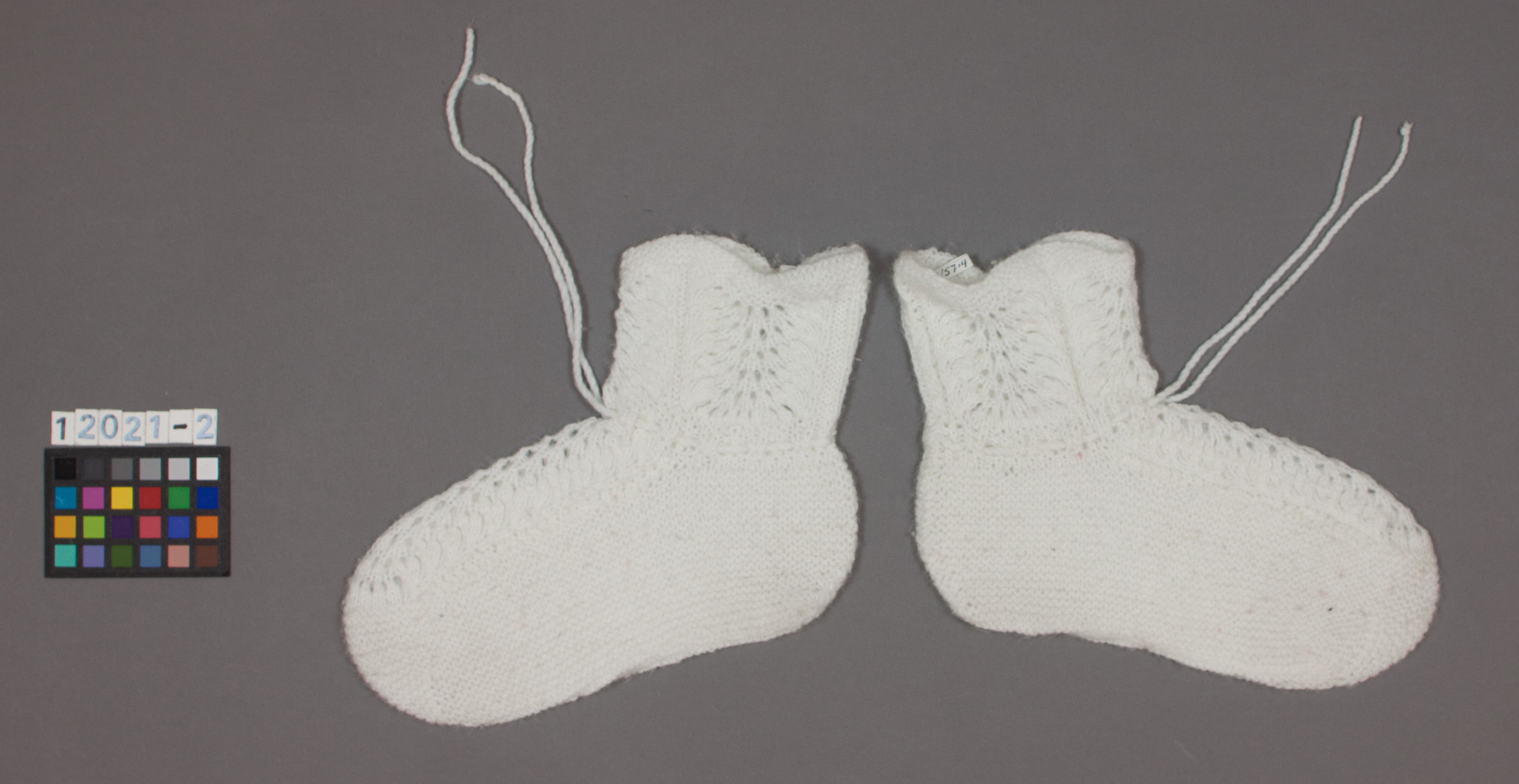 Stickad socka av vitt yllegarn. Söm mitt under foten samt baktill. Denna stickad med enbartaviga varv. Ovansidan av foten samt skaftet med genombruten dekor. Kanten runduddad medbård av aviga varv. Runt nederdelen av skaftet en dragsko av tvinnat garn.