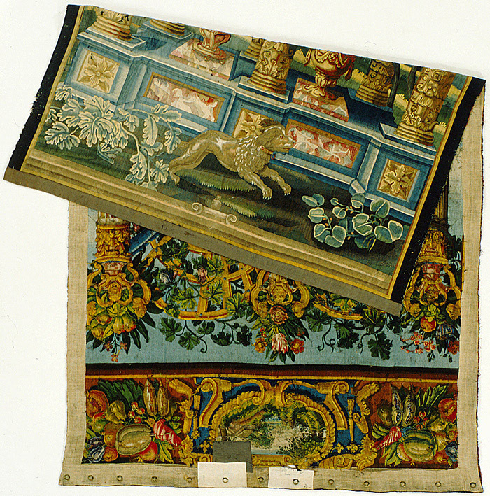 Motiv: arkad med två vaser och pudel. Av ylle och silke /6-7 trådar per kv.cm) i gobelängteknik. Troligen vävd i Holland vid 1600-talets mitt efter kartong av Johan Boeckhorst.
