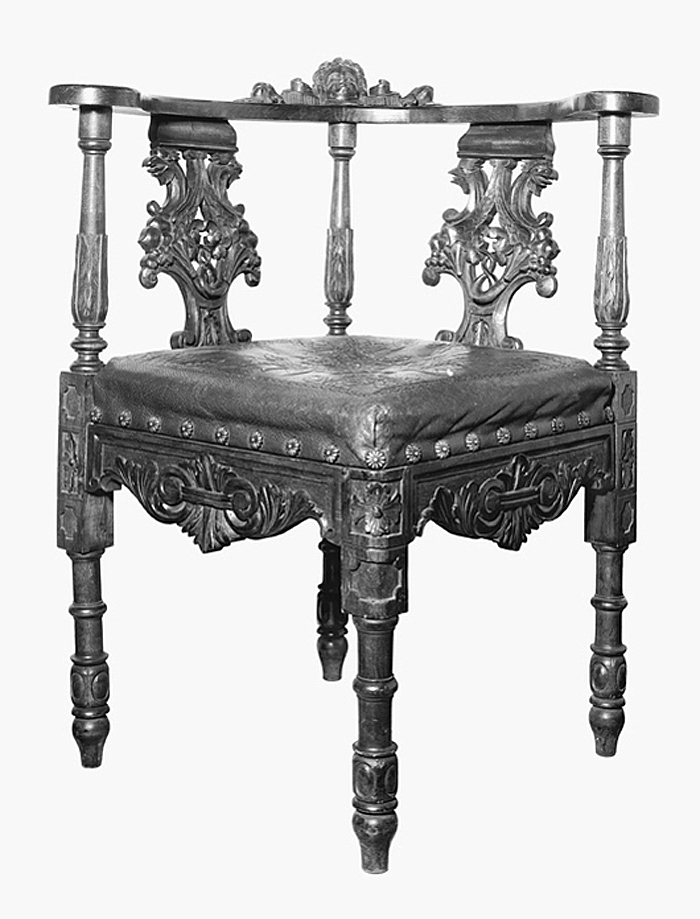 Med fyra ben, sarg, sits och rygg. Ben svarvade, profilerade, delvis snidade samt med fyrsidiga utsvällningar för sargen. I varje bens nedre ända ett hål för fottrissa. Sarg ställd över hörn samt med rak över- och konturerad underkant; på utsidorna snidat i relief mot prickerad botten två frånvända bladornament, vardera med inre ändan avslutad i en volut , vilka voluter är sammanbundna genom ett horisontalt band, gående över en mellan voluterna vertikalt ställd bladrosett; längs sargstyckenas överkant och ändar en slät list, kring vars inkant en käl; på benens fyrsidiga utsvällningar på utsidorna en bladrosett mot prickerad botten. Sits lös, med ram samt stoppad med tagel och klädd med gyllenläder, stoppningen liggande på en flätning av sadelgjordar. Lädret med pressade orneringar i relief i brunt, grönt och svart: i mitten en diagornalt ställd blombukett, utgående från ett vasformigt ornament, buketten med stor mittblomma, omgiven av fyrbladiga mindre blommor, blad och fruktklasar, överst en bukett av små fyrbladiga blommor och långa smala blad, i två av hörnen en grupp inåtriktade, i det tredje en bladkrans samt på ömse sidor om denna en inåtriktad kvist med två granatäpplen, två fyrbladiga blommor samt blad; allt mot guldstoftad botten; kring kanterna en smal bård av sammanhängande inåtvända bågar med ett treflikigt blad i varje. Lädret fäst kring kanterna med en rad möbelspikar med strålformigt refflade stora kullriga huvuden. Ryggen utgörs av en på bredsidan liggande bred båge med rundat utvidgade ändar som armstöd samt uppburen av tre ståndare, vilka utgör en förlängning på bak- och sidobenen, mellan dessa två stående breda mellanstycken. Ståndarna profilerade, nedtill på vardera snidade uppåtvända bladornament. Ovanpå bågen snidat i mitten i fri figur ett änglahuvud mellan två voluter, utanför vardera en frukt, omgiven av blad, därefter på vardera sidan i relief mot prickerad nedsänkt botten tre snett framåt och inåt riktade blad samt på vardera ändan en fyrbladig blomma, från vilken utgående inåt ett långsträckt bladornament med övre ändan avslutad i en blomkalk. Mellanstyckena med snidad framsida, delvis genombrutna samt med starkt konturerade kanter, nedtill på vardera en insvängd båge med volutformiga ändar, mellan bågarna nedtill ett nedåtvänt bladornament, upptill två blommor med sammanvirade stjälkar, från vilkas nedre ändar utgående åt vardera sidan ett frukt- och bladknippe, överst två frånvända örnhuvuden med bågböjda halsar och uppåtriktad vinge; baksidan med sirade orneringar. Tillhört inventarierna i Walther von Hallwyls privata kontorsrum, inrymt i Hamngatan 4, Stockholm, 1 Oktober 1896 - 1921.