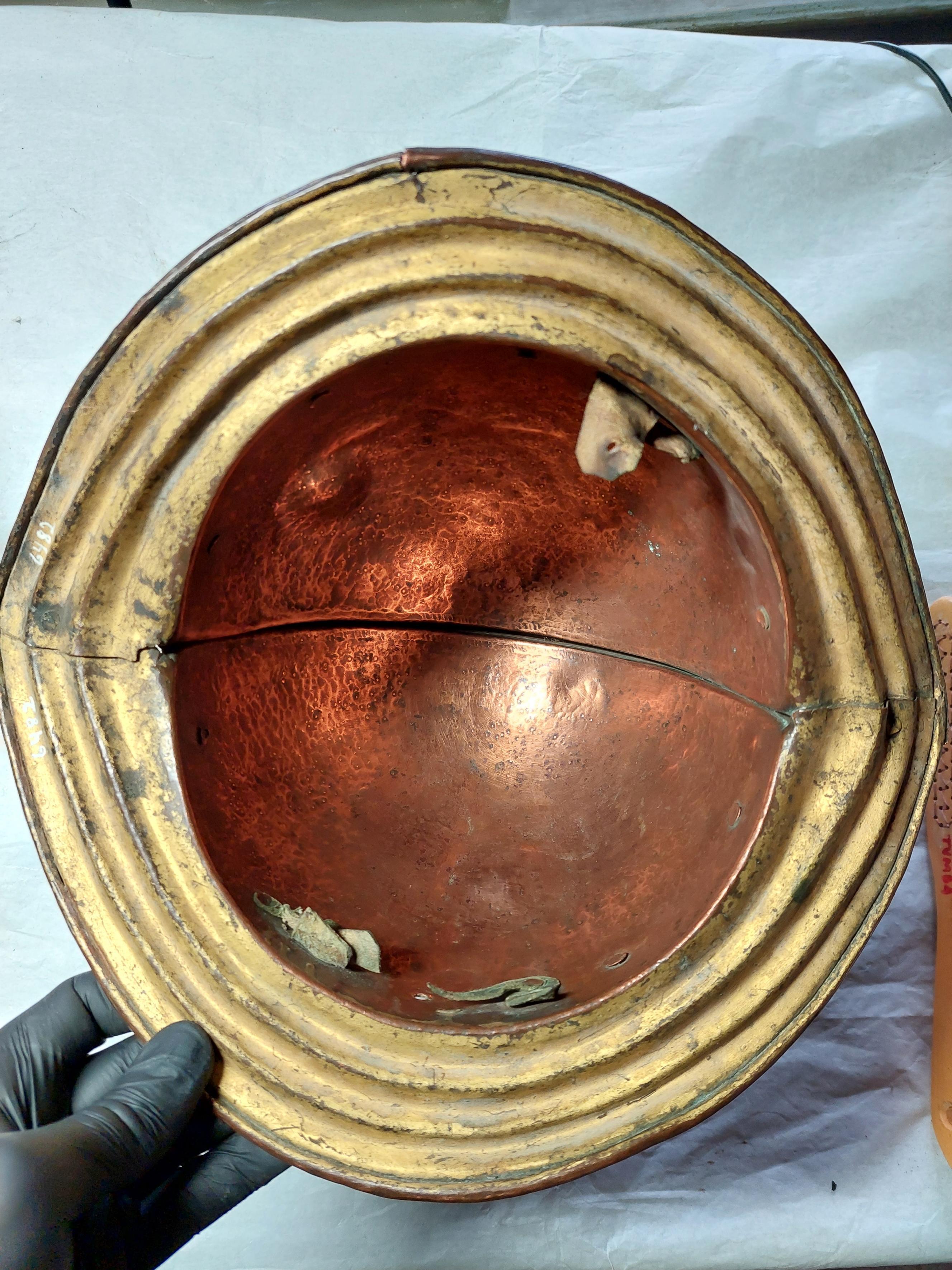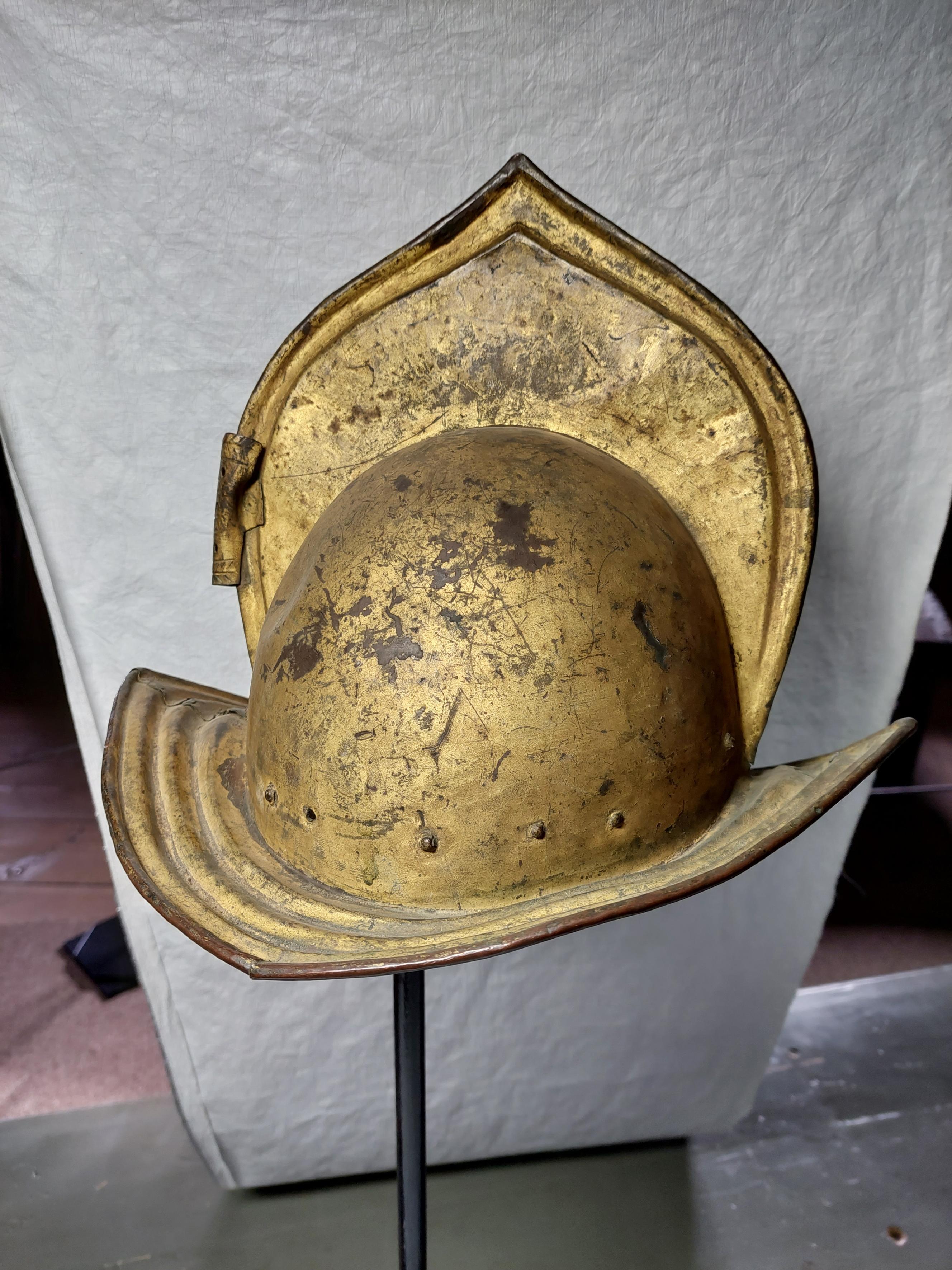 Hjälm av typen morion, möjligen använd vid karusellspel. Hjälmen är av förgylld koppar, målad med guldfärg. Den har en lökformig kam med uppsvängda och räfflade bretten samt en plymhållare.