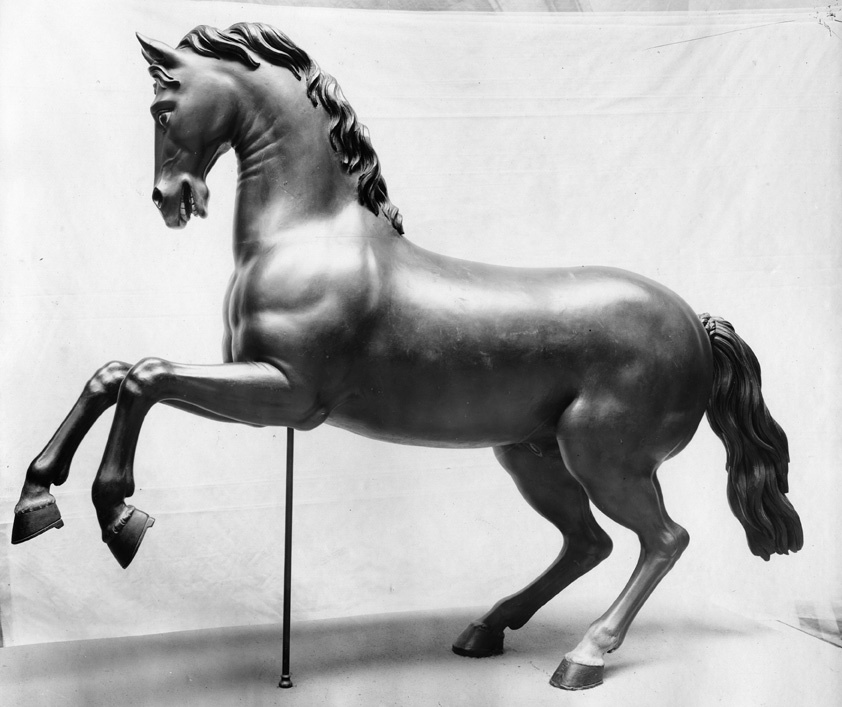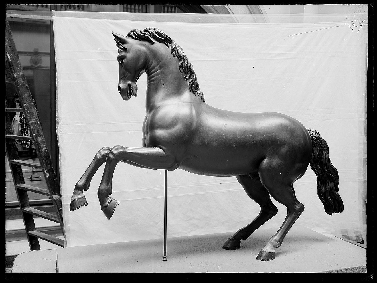 - 1 mindre häst af trä med mahn och svans äfvenledes af trä, plinen ekmålad.
