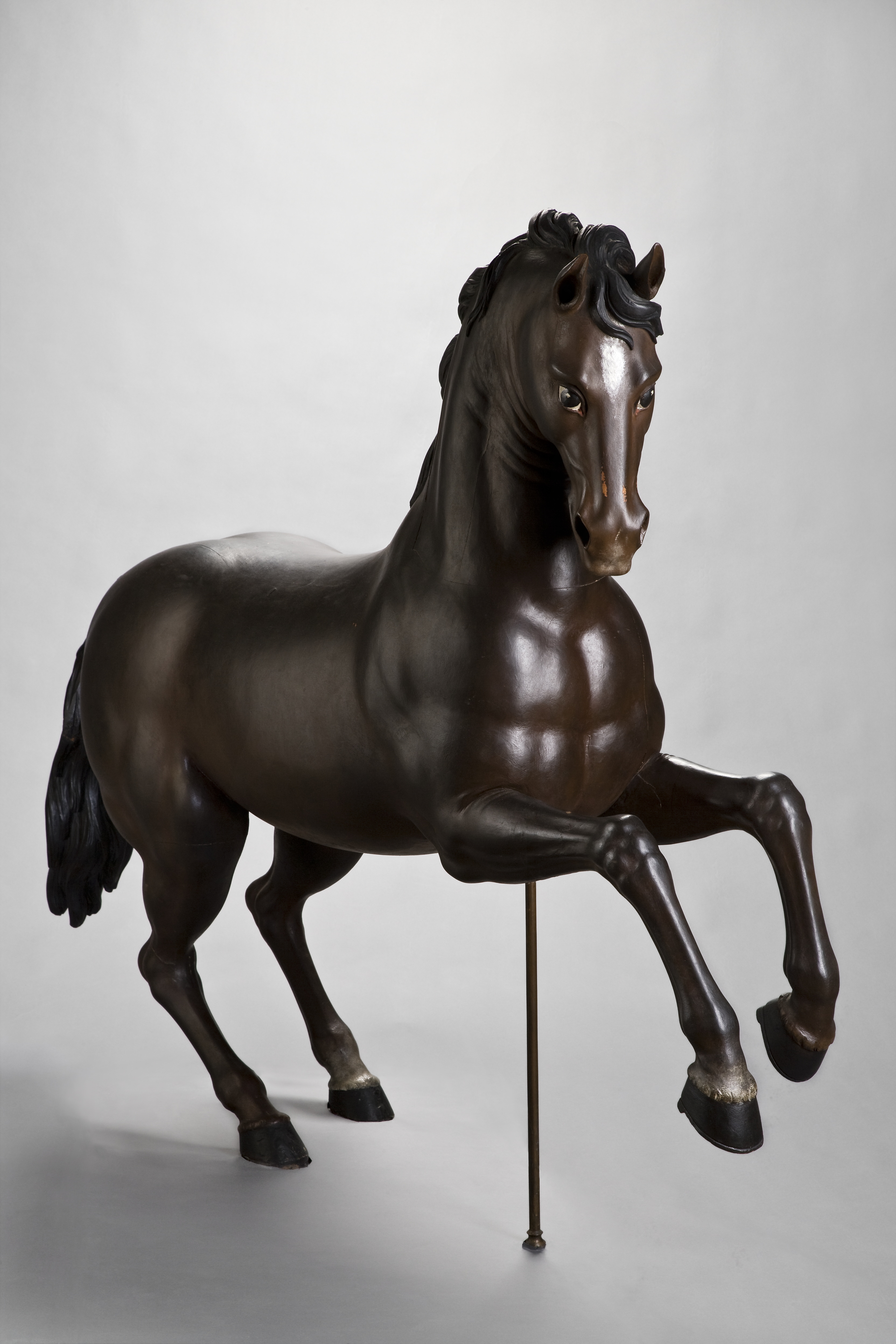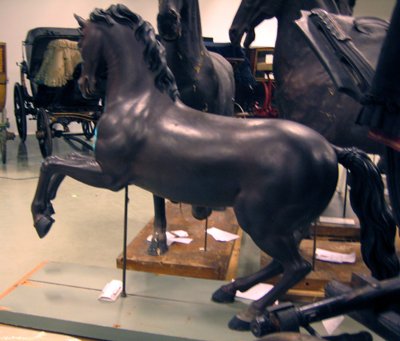 - Konung Carl XI:s som barn: häst af träd på fotställning med sadel af Cramoisierödt sammet med guld broderad och en liten bord omkring med Konung Carl XI:s namn och krona på kåporne och karmarne, med stora guld- och silkesfransar kring kåporne och smärre om karmarne, 1 par hölsterkappor af D:o sammet och fransar med Kongl. namnet och kronor, 1 par hölster af svart läder, sadelknappen förgyld, hufvudställe, handtygel, förbögel, ryggstycke samt capsontygel af brunt silke med guld, allt med förgyllda messingsbeslag; sadeltäcke eller valltrapp af Cramoisiesammet, underfodradt med rödt lärft, nedanom med stora guld i silfverfransar. Täcket med en bord broderad med guld perlstickararbete öfver hela täcket konungens namn och kronor af guld broderade.