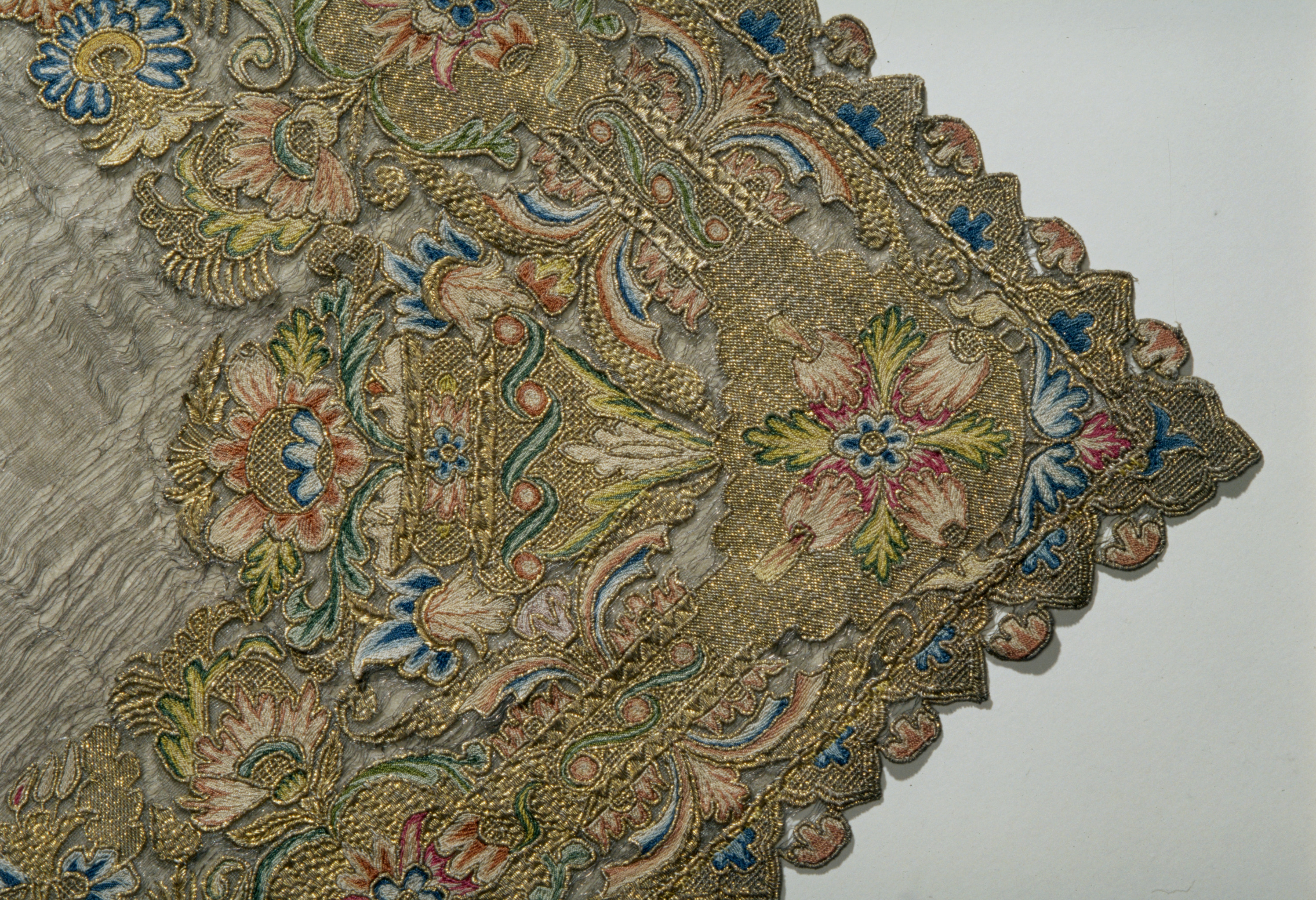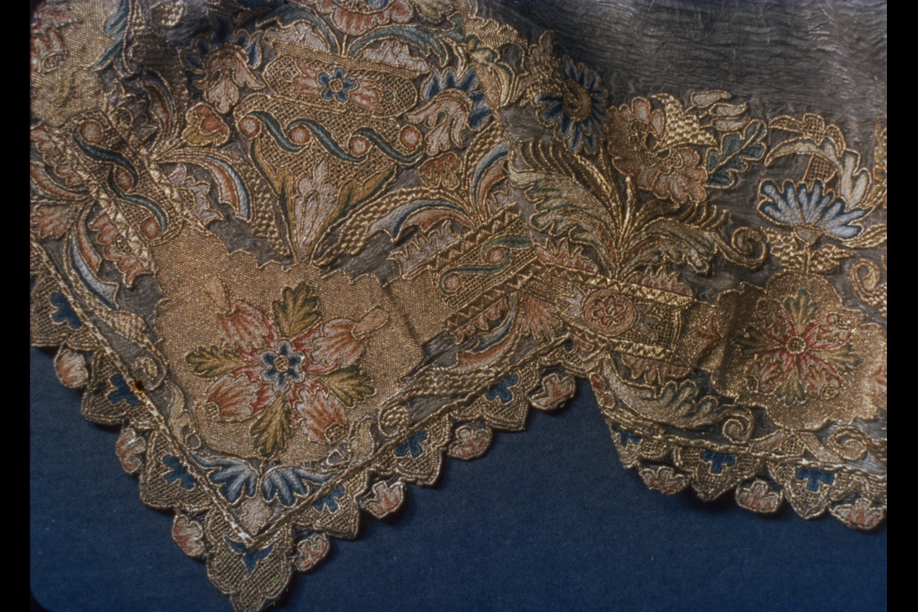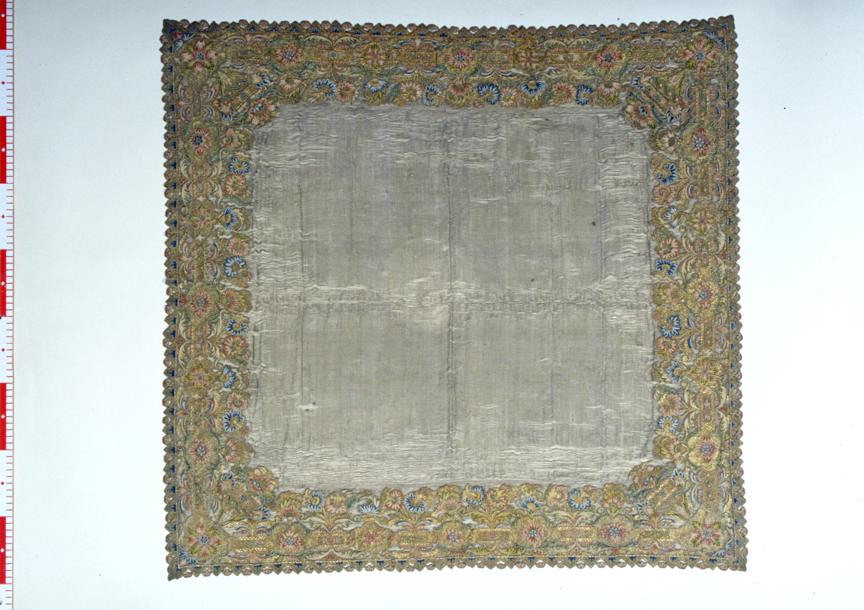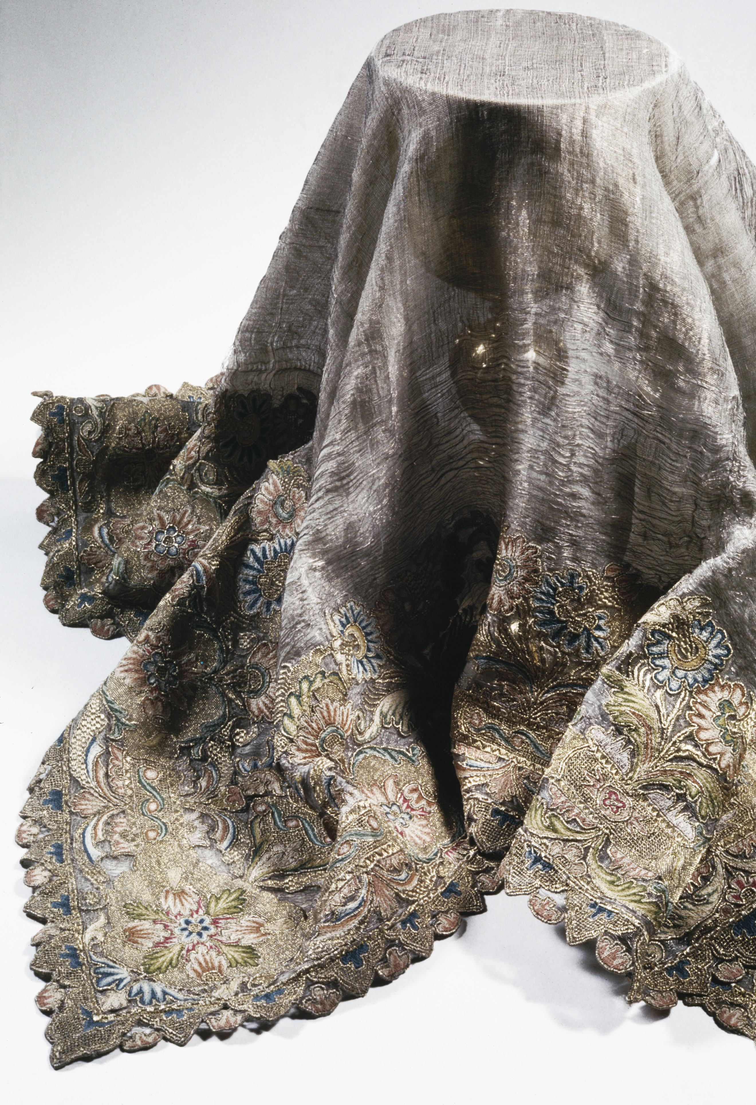 Silverskir med bård av dubbelsidigt broderi i guld och silke. Bården bildas av kartuscher sammanhållna av ornamentband med utgående blom- och bladkvistar. Skänkt 1728 av fröken Emerentia von Düben. Sannolikt Mindre Asien. Deponerad 1873.
