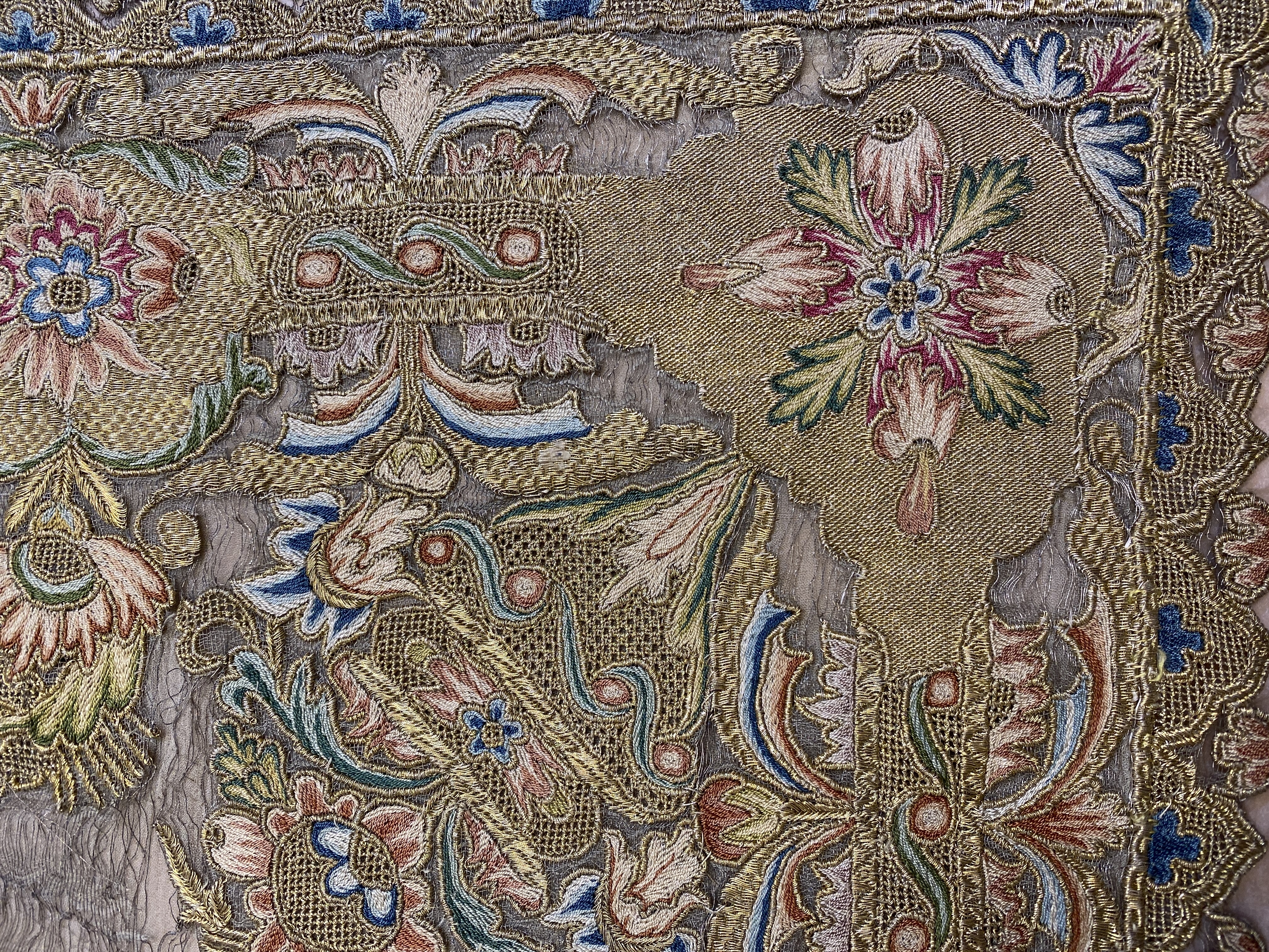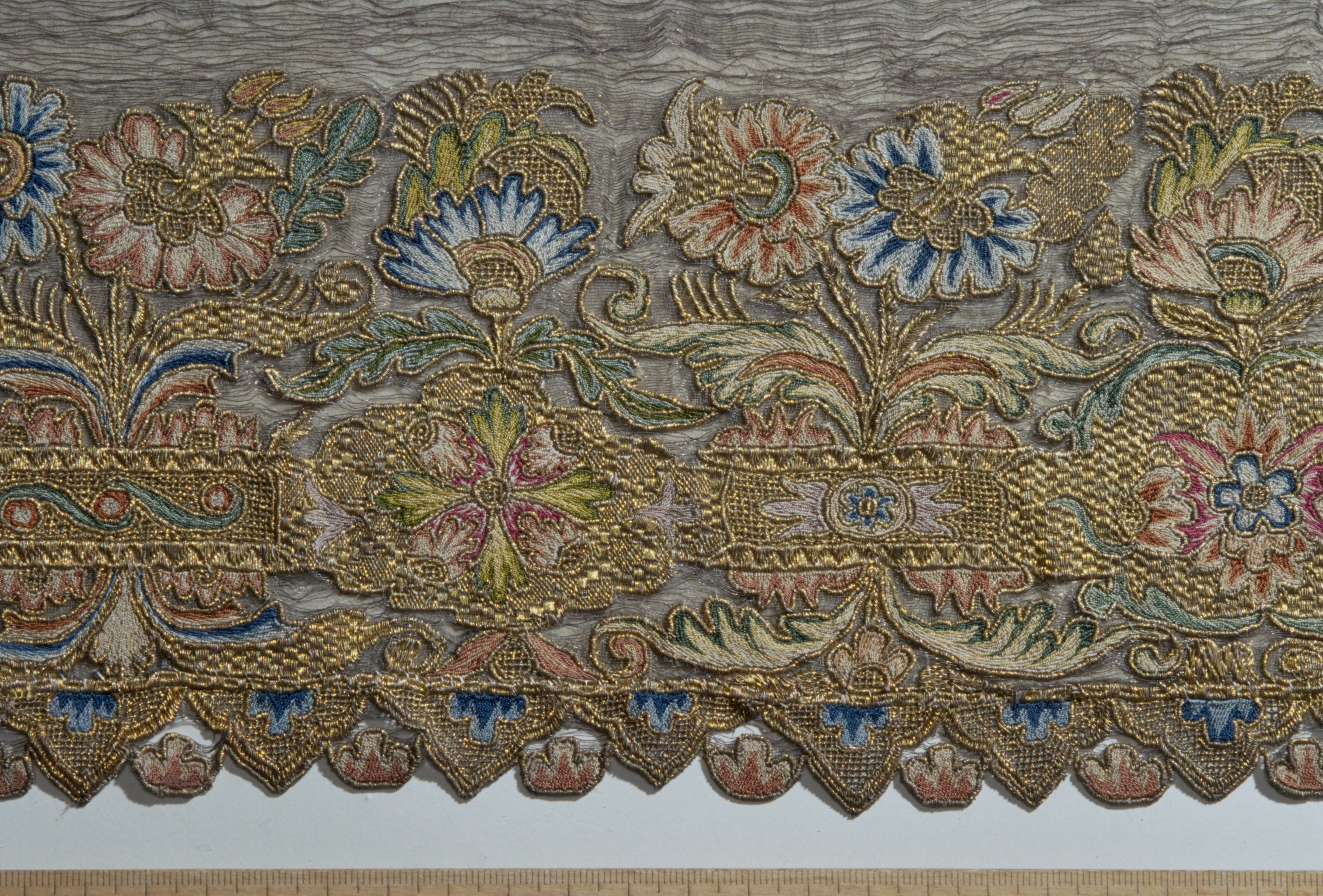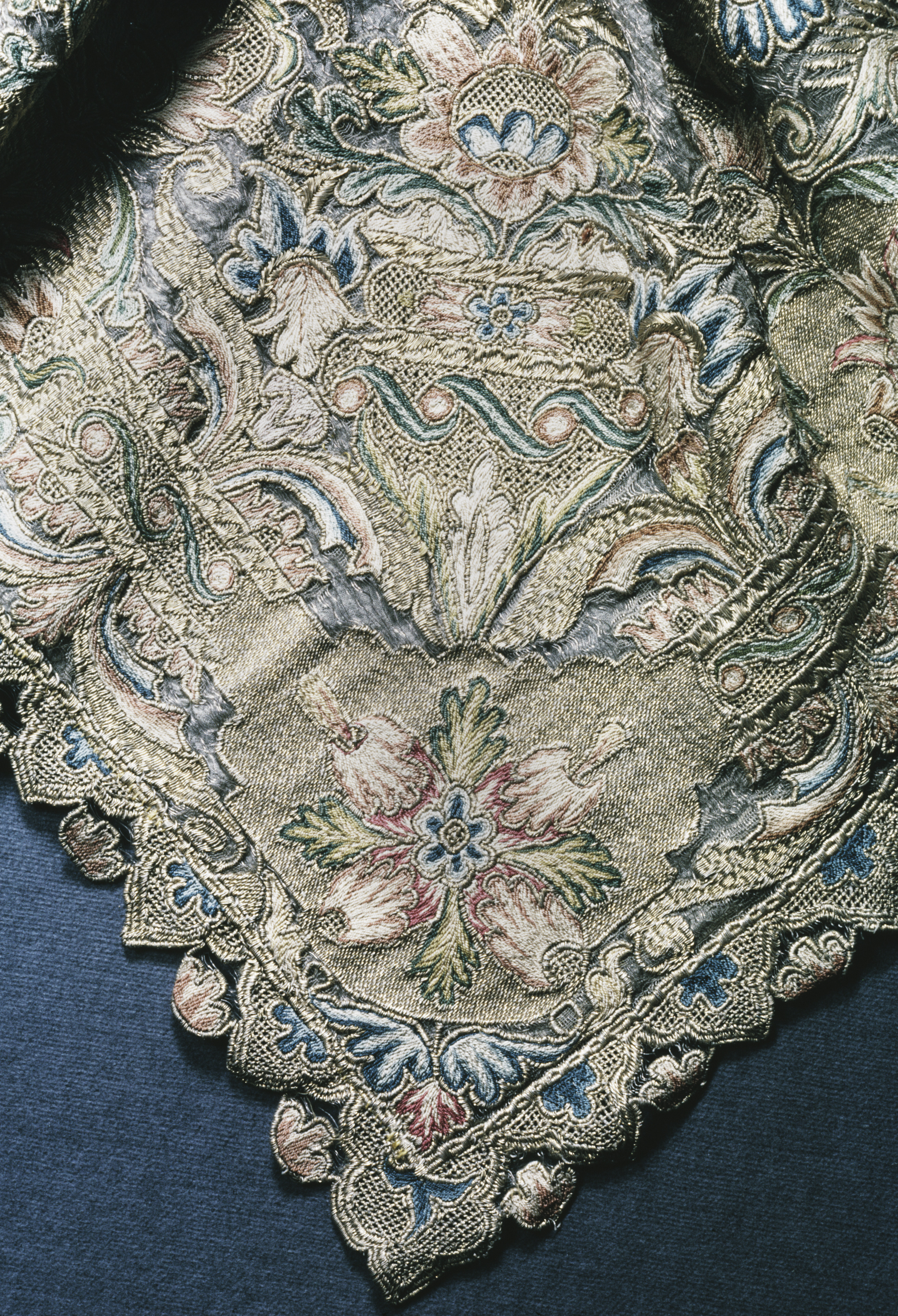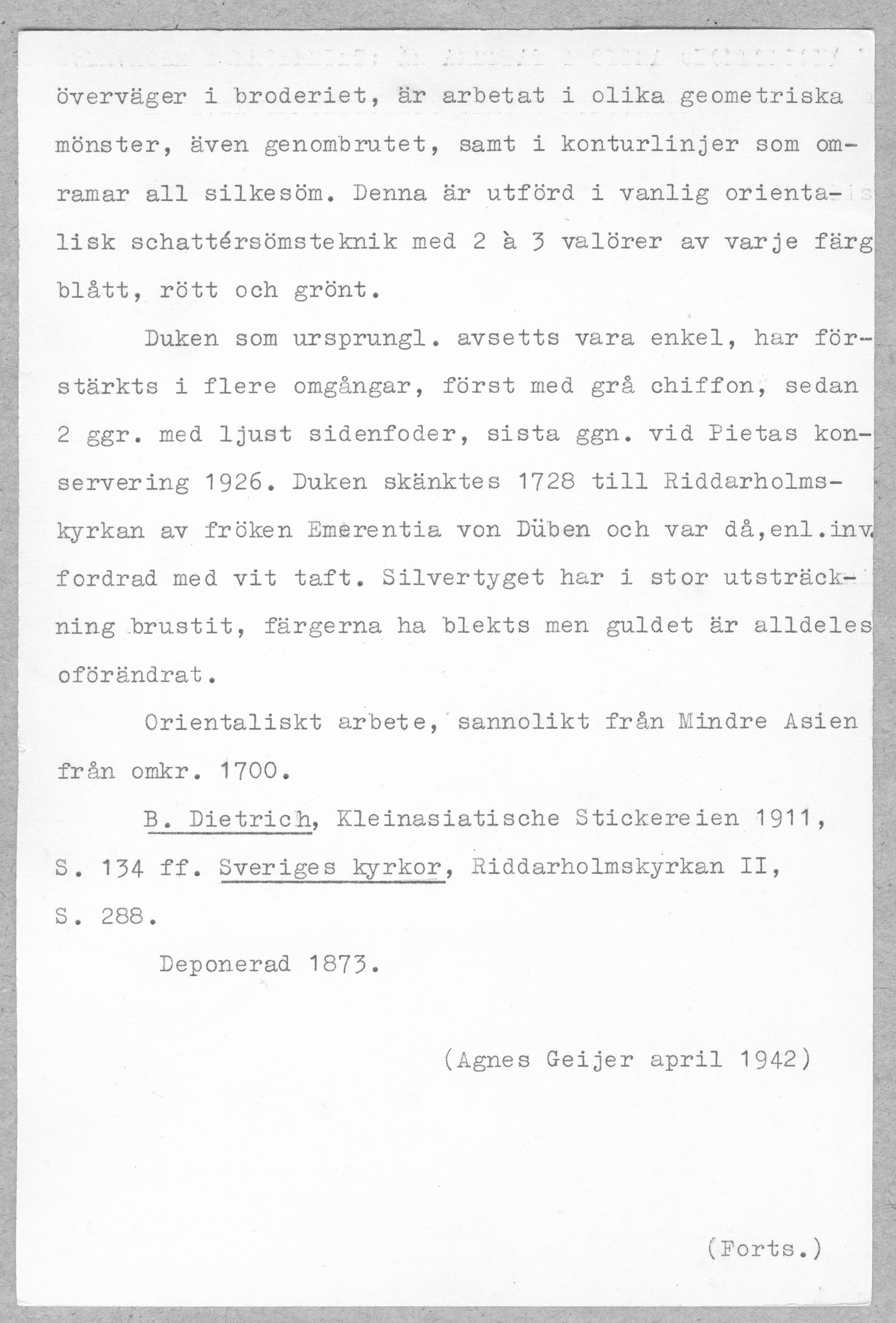 Silverskir med bård av dubbelsidigt broderi i guld och silke. Bården bildas av kartuscher sammanhållna av ornamentband med utgående blom- och bladkvistar. Skänkt 1728 av fröken Emerentia von Düben. Sannolikt Mindre Asien. Deponerad 1873.