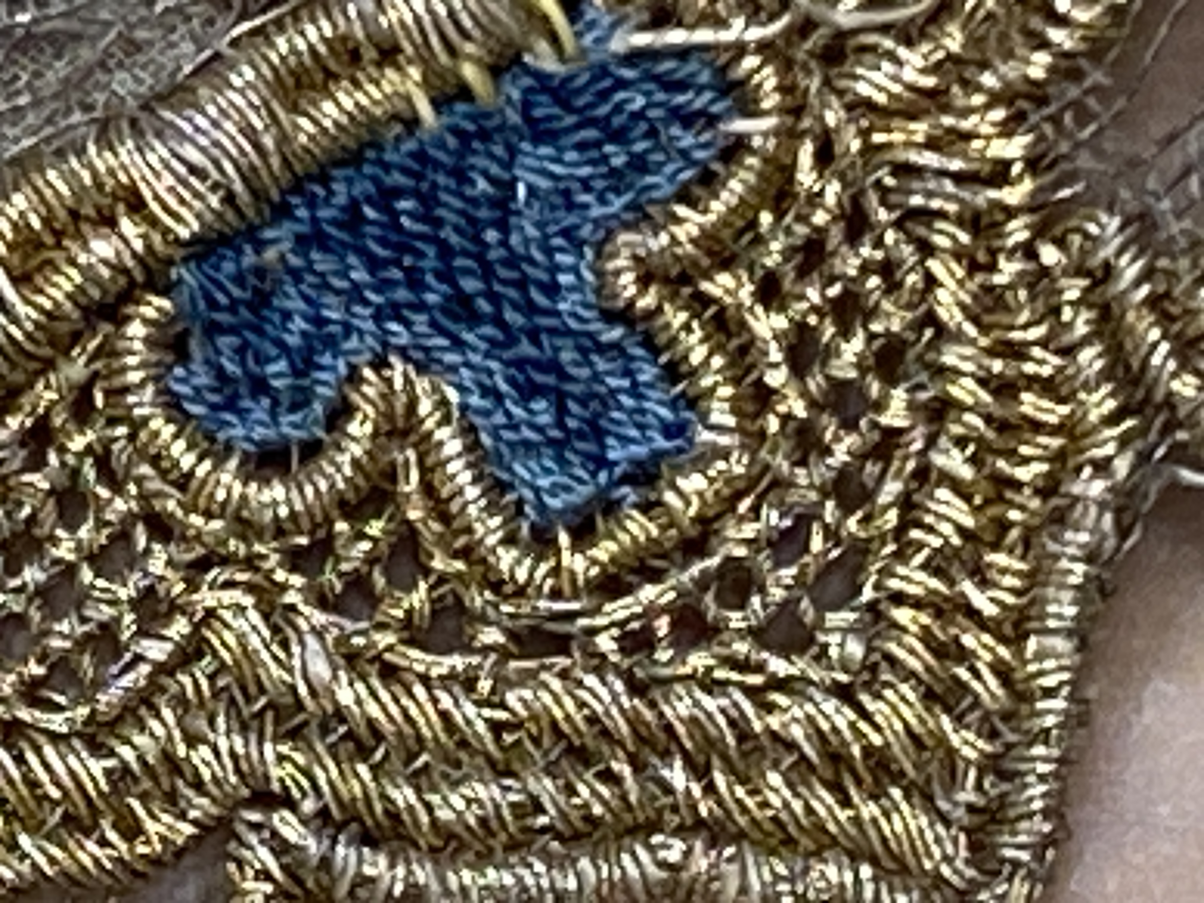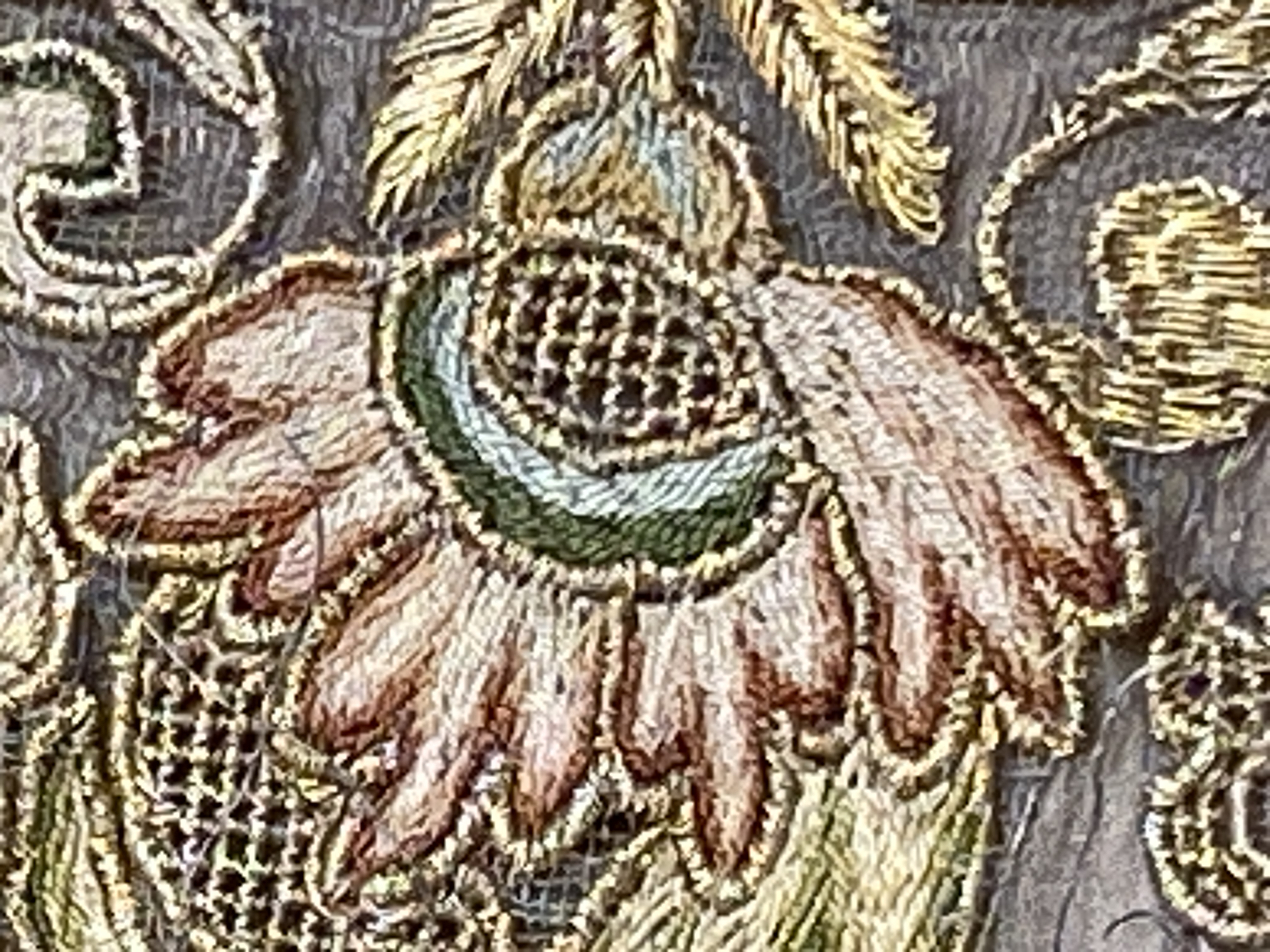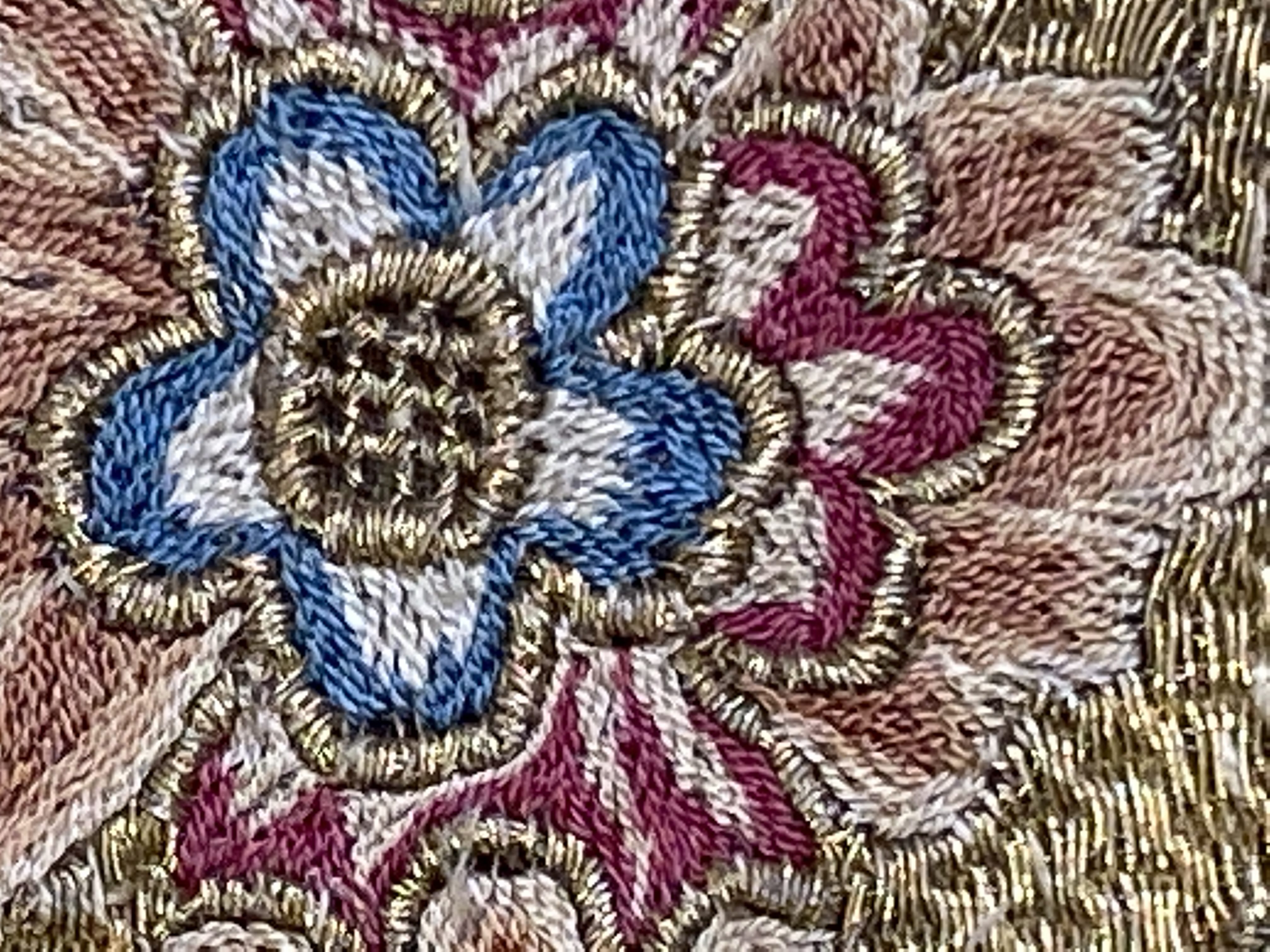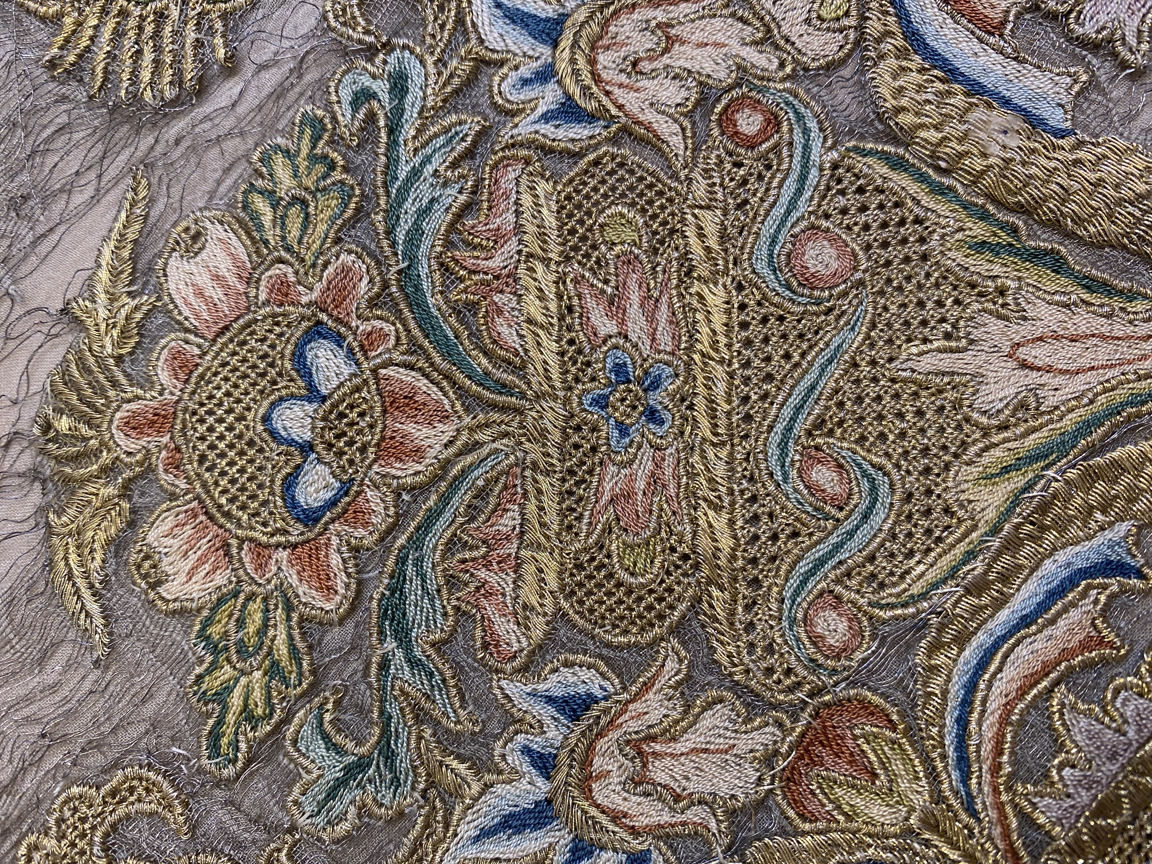 Silverskir med bård av dubbelsidigt broderi i guld och silke. Bården bildas av kartuscher sammanhållna av ornamentband med utgående blom- och bladkvistar. Skänkt 1728 av fröken Emerentia von Düben. Sannolikt Mindre Asien. Deponerad 1873.