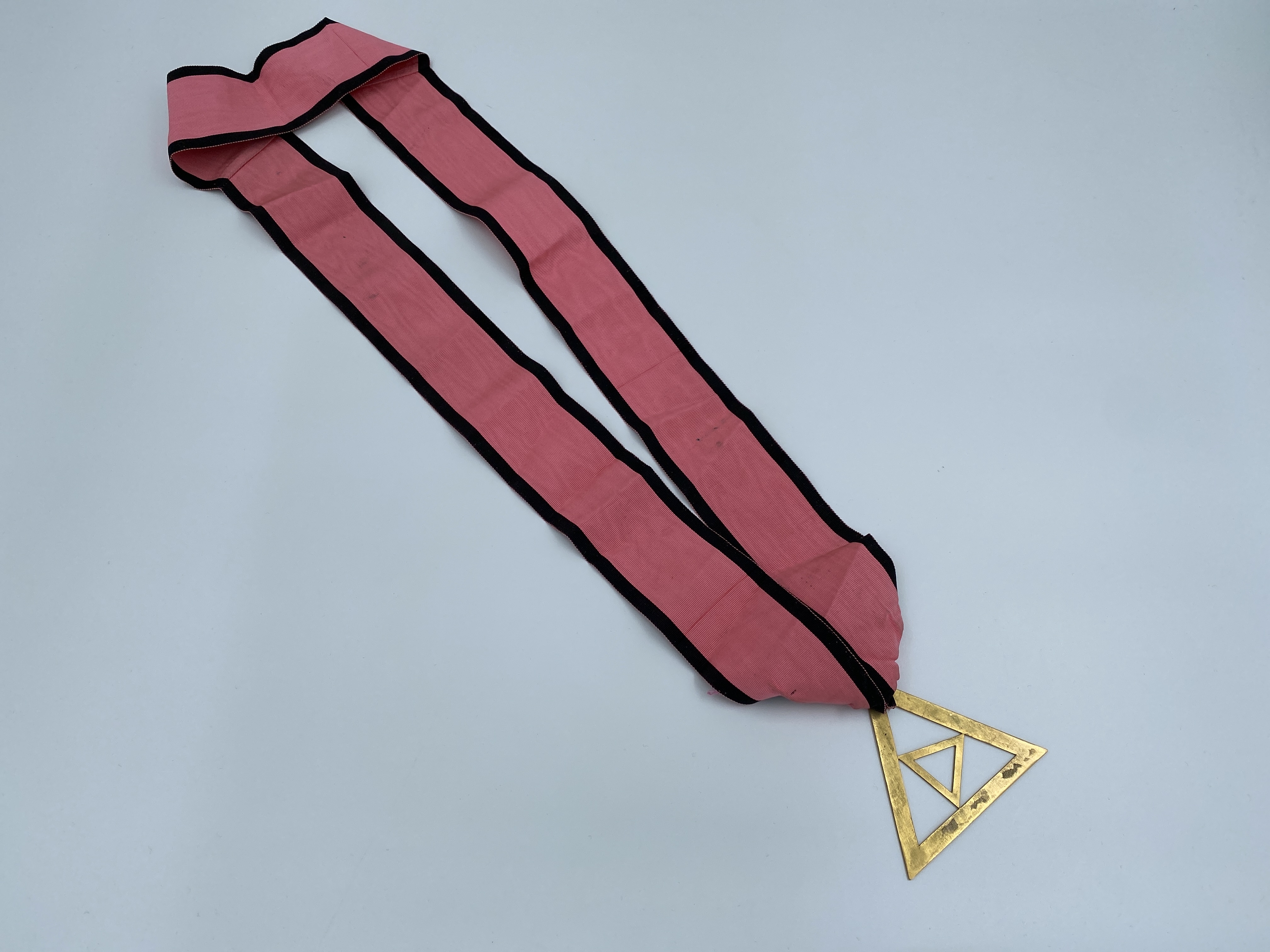Ordensband för Tempel riddare orden (Kärlekens tecken) som tillhört Göte Hedenquist. Rosa ordensband med svarta kanter, samt ordentecken i form av triangel i metall.