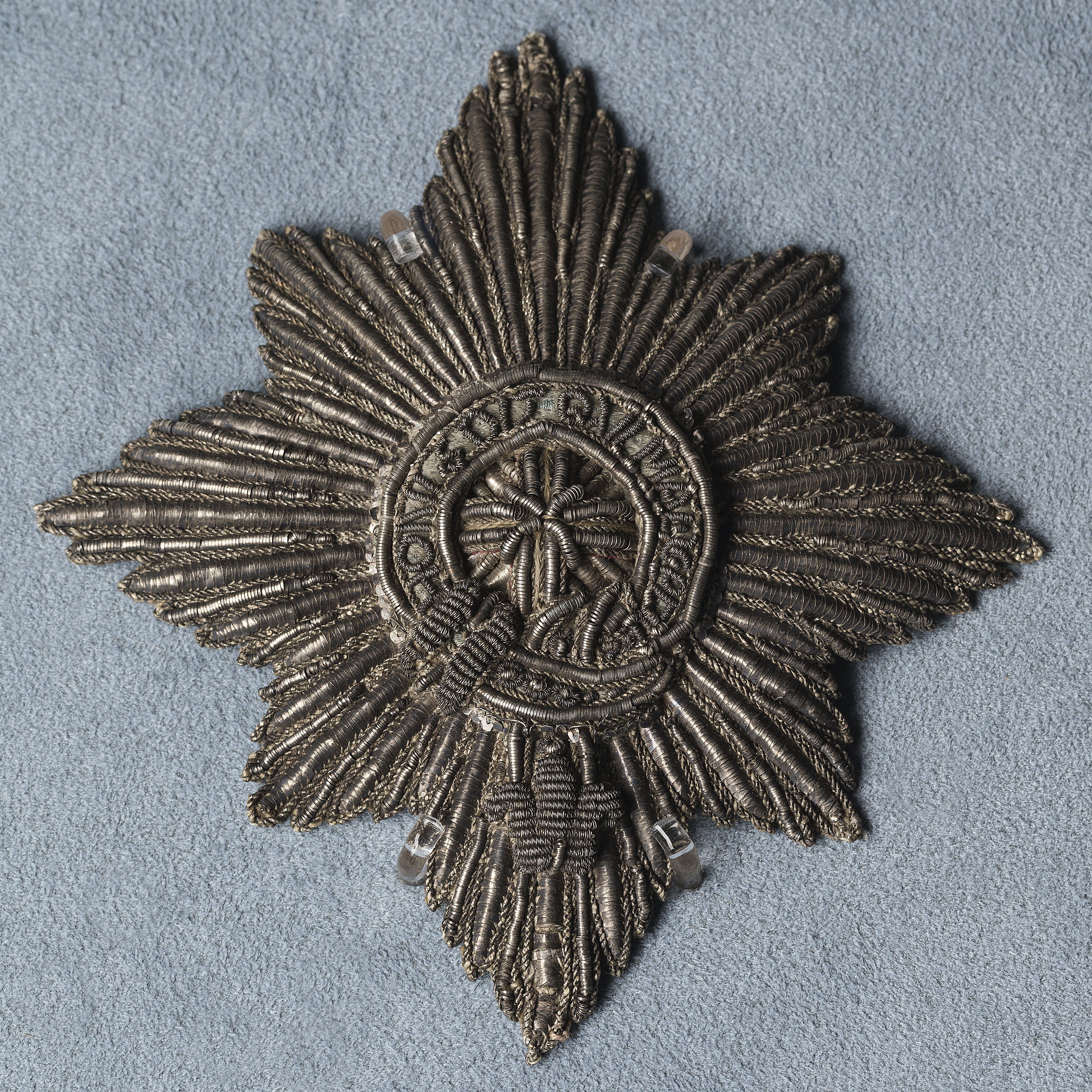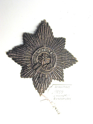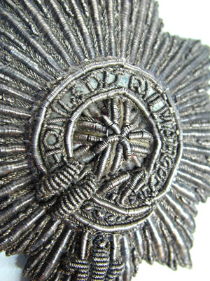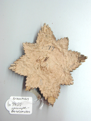 Åttsidig strålstjärna, belagd med strumpebandet, text: HONI SOIT QVI MAL Y PEN", allt broderat med silvertråd, -lan och -kantlinjer. Baksidan täckt av gulnat papper, bläckskrift: "No 77 // fol:10 …" Karl XI utnämndes till riddare av Strumpebandsorden 1668 och dubbades högtidligen på rikssalen av engelske ambassadören Carlisle den 29 juli 1669. Ordensinsignierna återsändes till England efter konungens död genom kungl. rådet greve Karl Bonde.