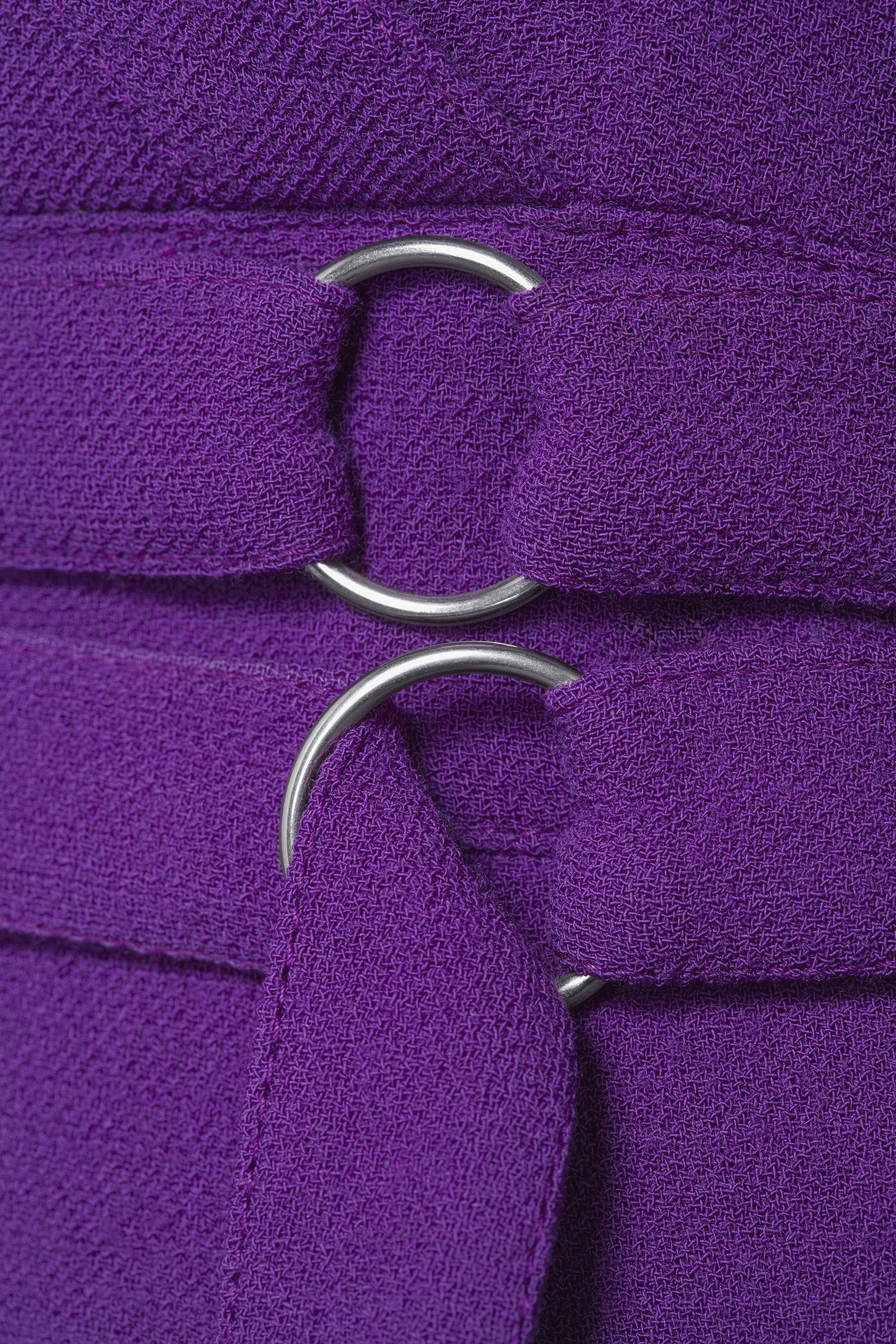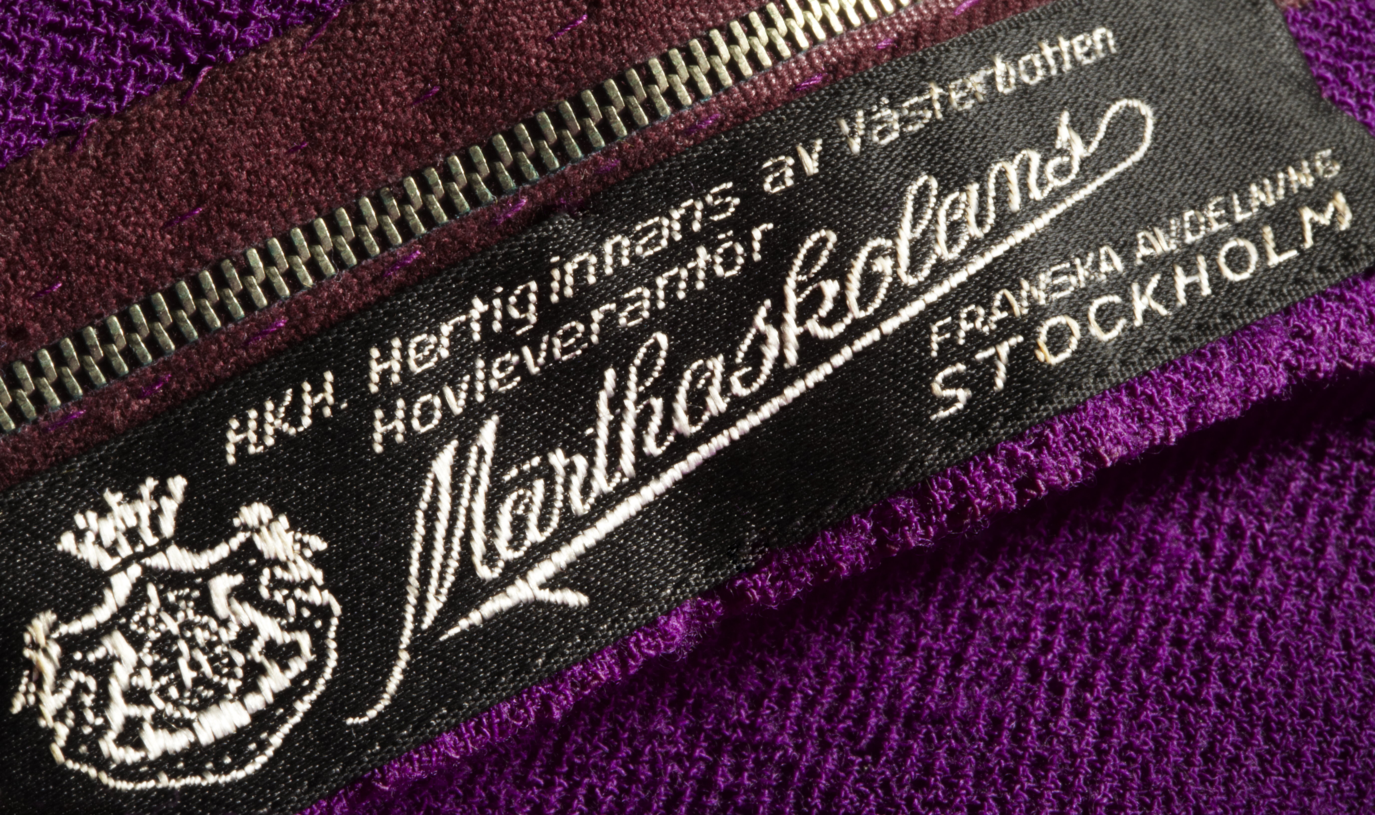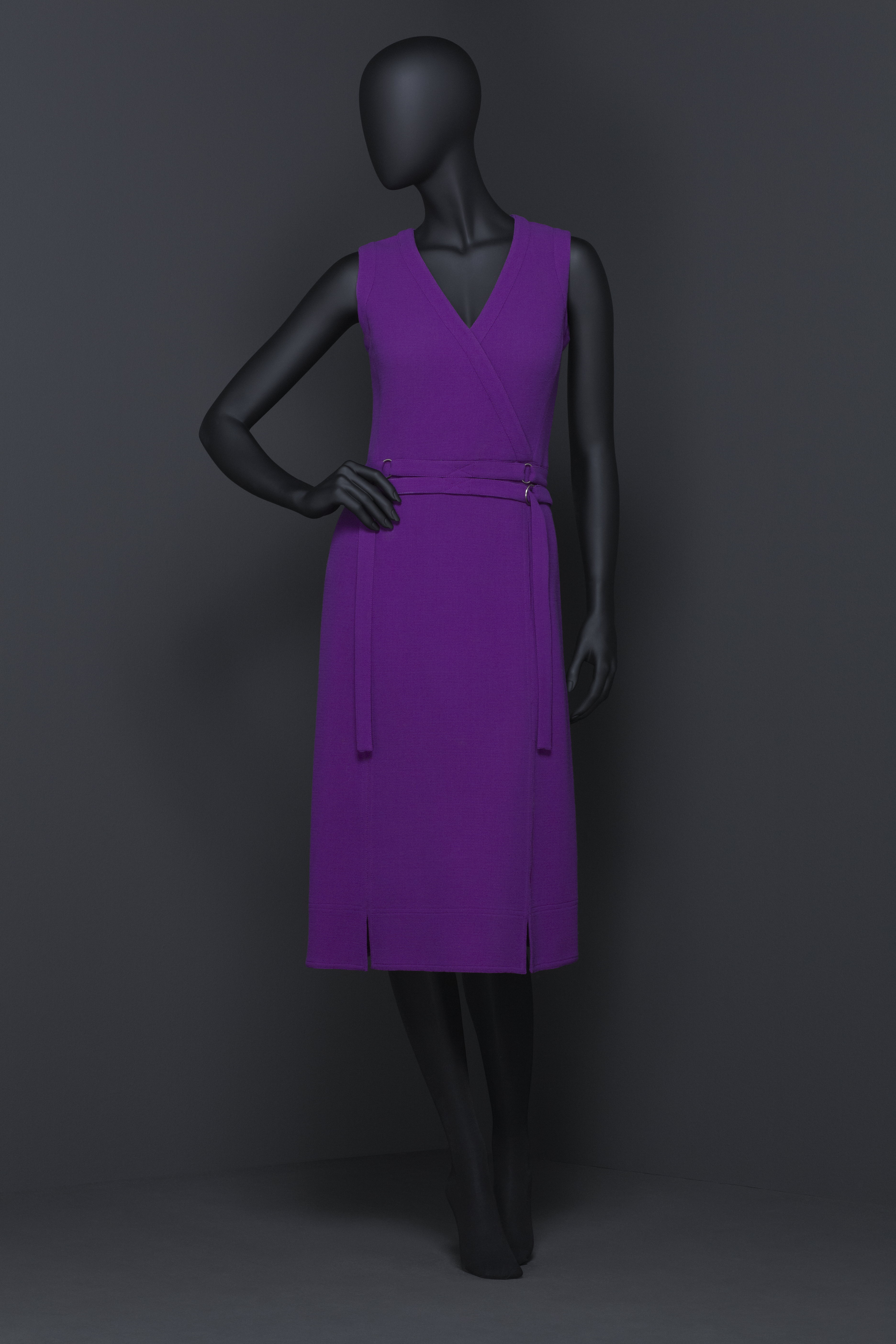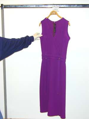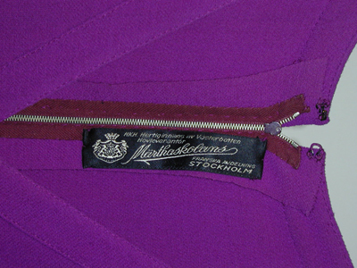 Ärmlös ofodrad klänning i lila yllekräpp, avtagen i midjan. Livet är omlottskuret med V-ringning, kantad i ärmhål och hals med 2 ½ cm bredaband av tyget. Framstycket med extra sidostycken och snedställda bystinprovningar. Livet bak är skuret i fyra delar med två inprovningar i nacken. I midjan är infällt en 5 cm bred linning med två delvis fastsyddatygskärp, vardera 2½ cm breda. Skärpen skarvas/hålls ihop fram och bakav fyra metallringar. Kjoldelen är ganska rakt skuren i tre våder. Sidsömmarna är flyttade fram på framstycket och döljer två rakställdafickor. Fickpåsar i taft samt i klänningstyget syns på avigsidan. Sömmarna är stickade med dubbla sömmar och har två korta sprund, detfinns även dubbla sömmar som prydnad där sprunden slutar och runt hela klänningen med tygförstärkning på avigsidan. Blixtlås baktill och i nacken hake och hyska klädd i lila tråd. Etikett med texten: HKH Hertiginnans av Västerbotten Hovleverantör,Märtaskolans Franska Avdelning STOCKHOLm