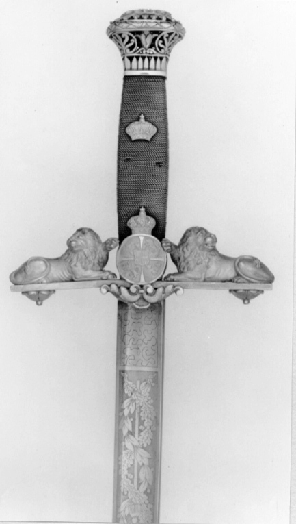 Fäste korsformigt av förgylld mässing med hög, uppåt vidgad, genombruten knapp med rektangulärt tvärsnitt. På ovansidan två kransar av blad. På sidorna enkelt bladornament samt i hörnen fembladiga palmetter. Raka parerstänger med två liggande lejon, vända mot kaveln, mellan dessa en rund, krönt, kvadrerad sköld, fält 1 och 3 tre kronor, fält 2 och 4 Folkungalejonet, fälten åtskilda av ett utåt vidgat kors. Sköldformig hjärtsköld med Bernadotte-vapnet. Under denna en enkel ranka som styrskena. Kaveln lindad med tvinnad silvertråd med på utsidan sluten krona av förylld mässing. Klinga rak, eneggad utom vid det 190 mm långa, tvåeggade spetspartiet. Flack hålkäl, l: 623 mm med yttäckande ornering av blankpolerade ornament mot mattpunsad botten. På båda sidor vid klingbasen ett rektangulärt fält med ett finmönstrat ådernät. Därefter på utsidan stångvapen med en löst tvinnad ek- och lagerranka; Oscar I:s monogram under kunglig krona; trofégrupp; strålande Nordstjärna; rankverk; ymninghetshorn; blom- och bladranka. På insidan ett svärd, runt detta en lagerranka; C under kronprinskrona (Carl XV som kronprins); två korslagda klubbor ovanpå en lagerranka; korslagd lager- och palmkvist; rankornament; pilkoger och blom- och bladranka.