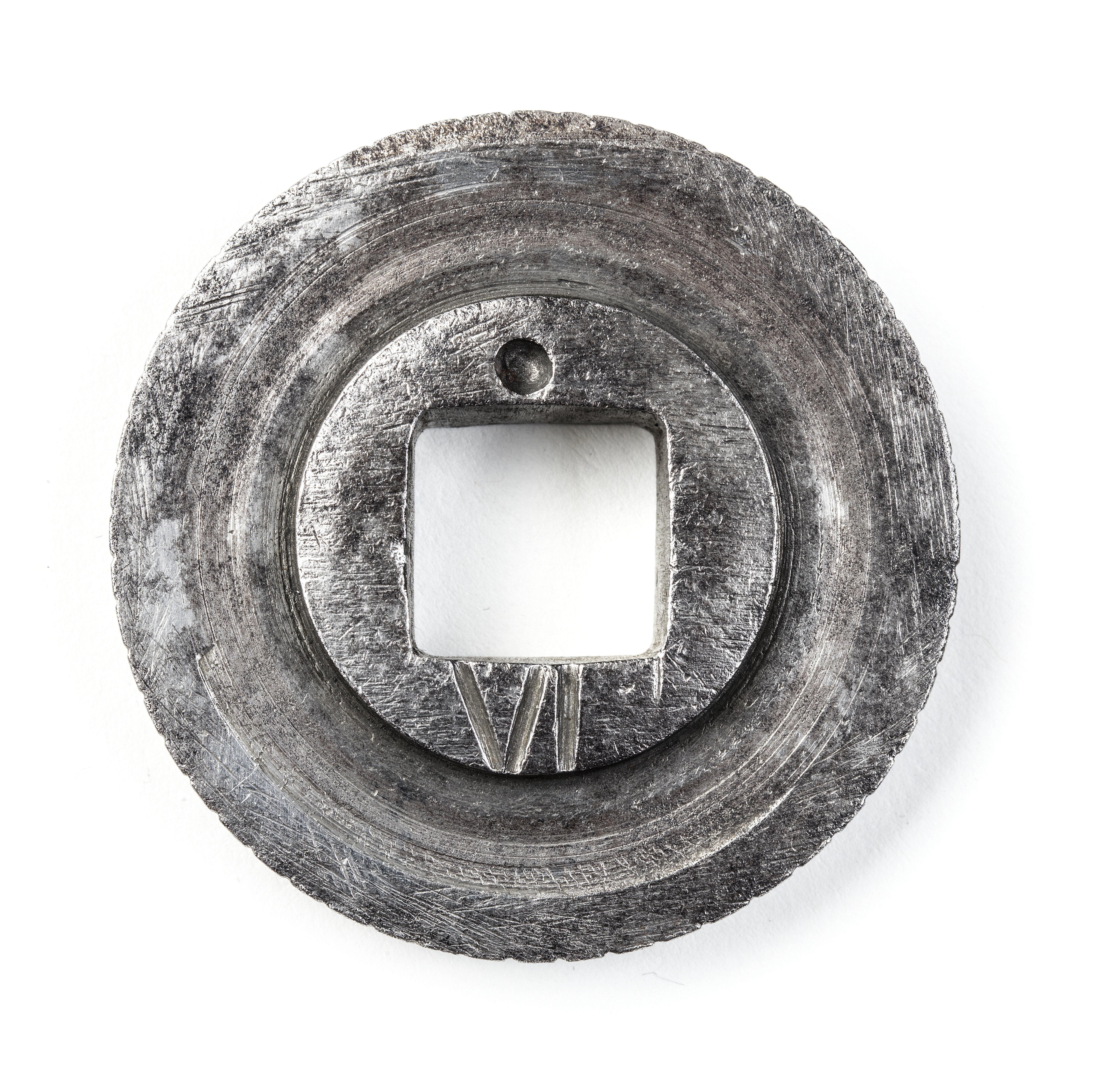Vals till blyvinda. Runt omkretsen tvärstreck och W. I centrum fyrsidigt hål i en rund förtjockning. Hålet är på ena sidan märkt med en punkt och VI.