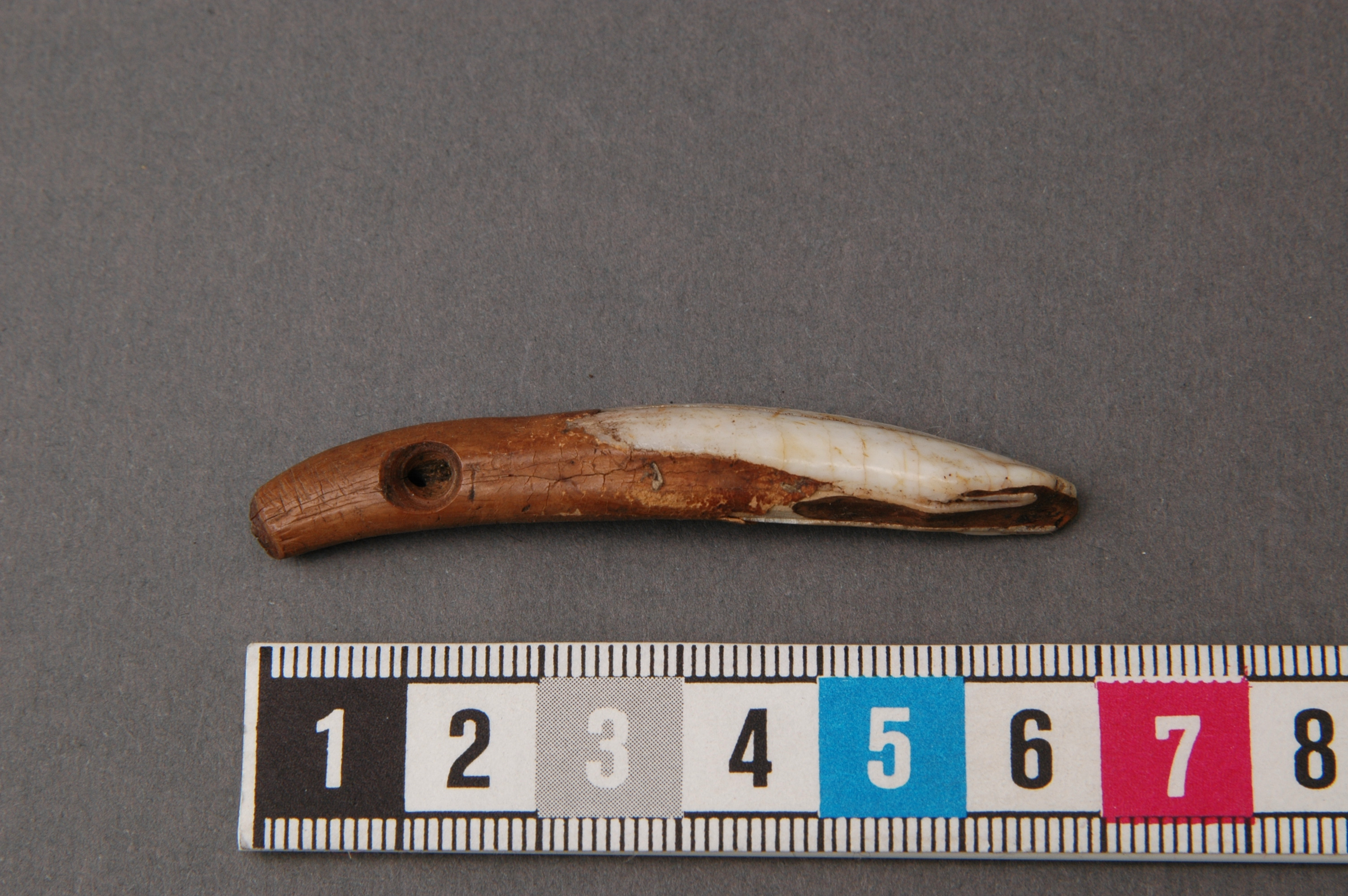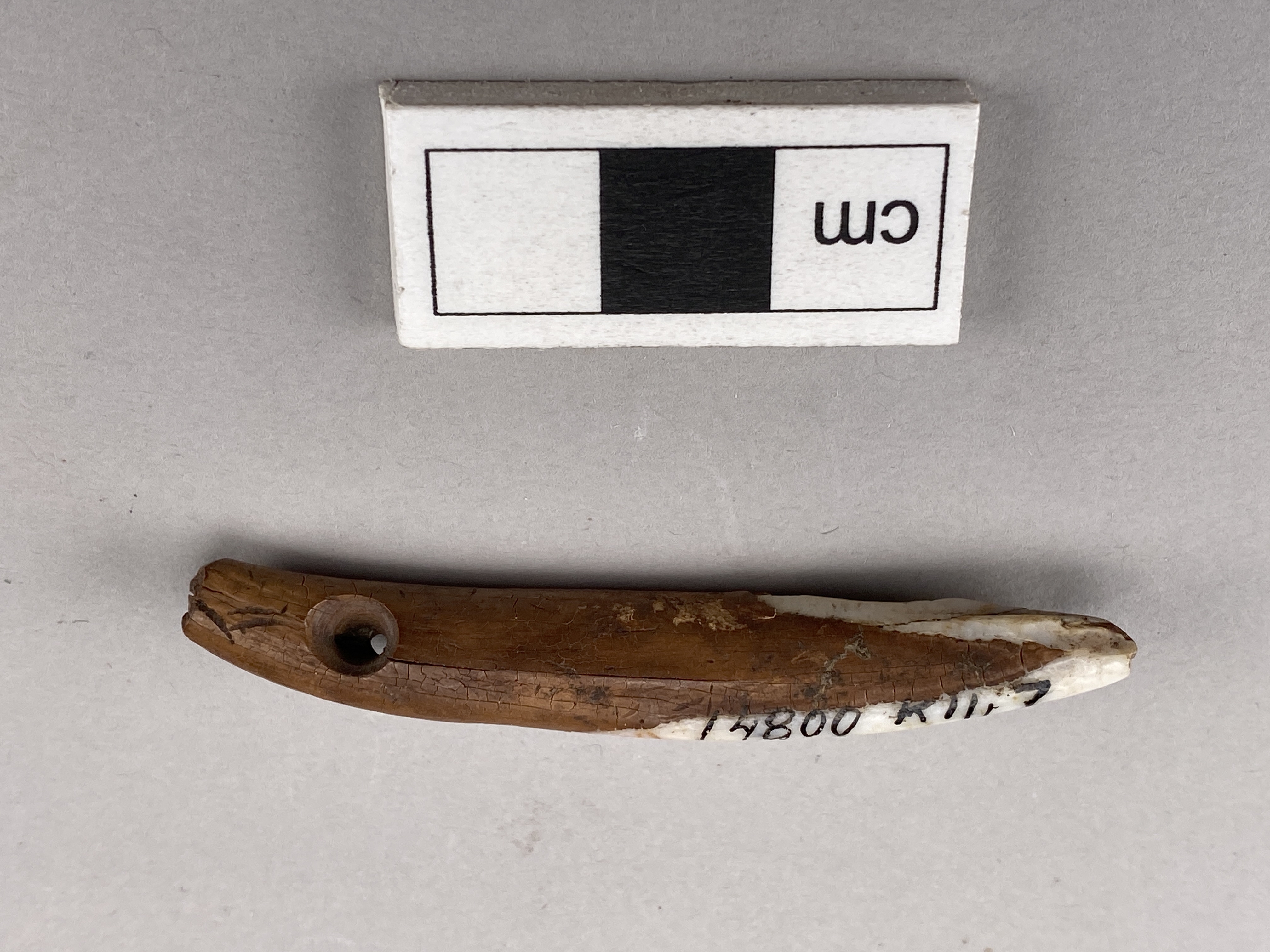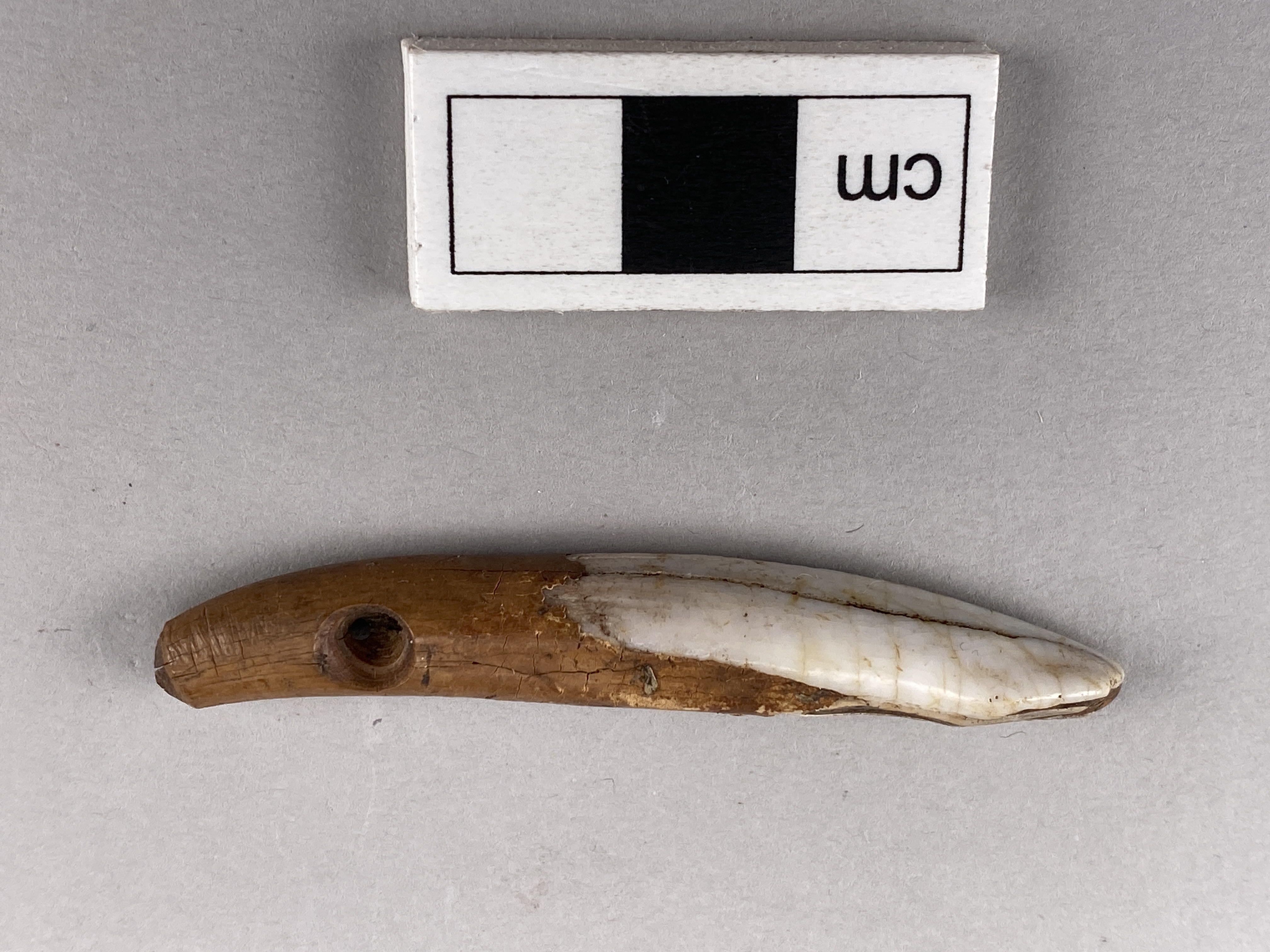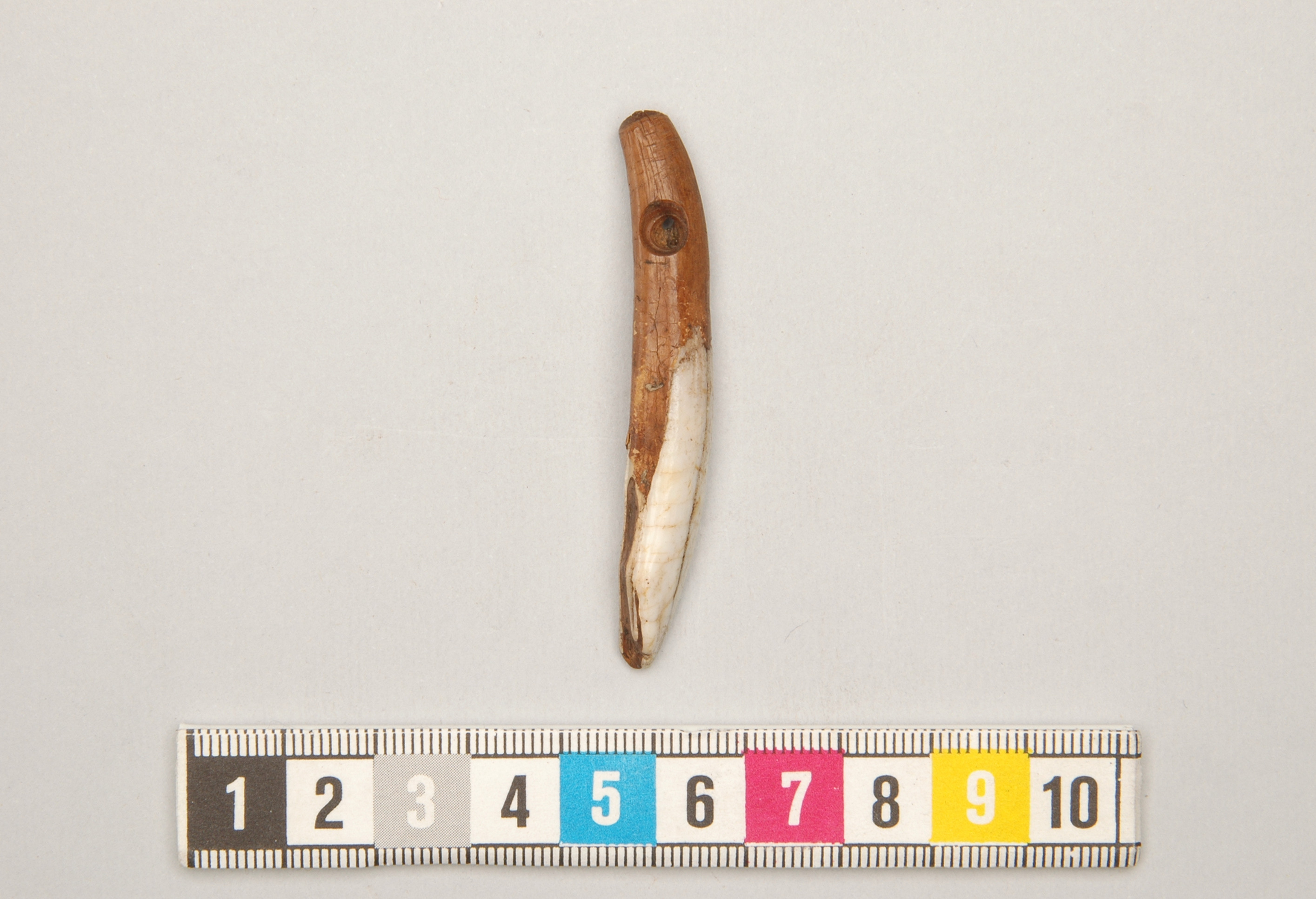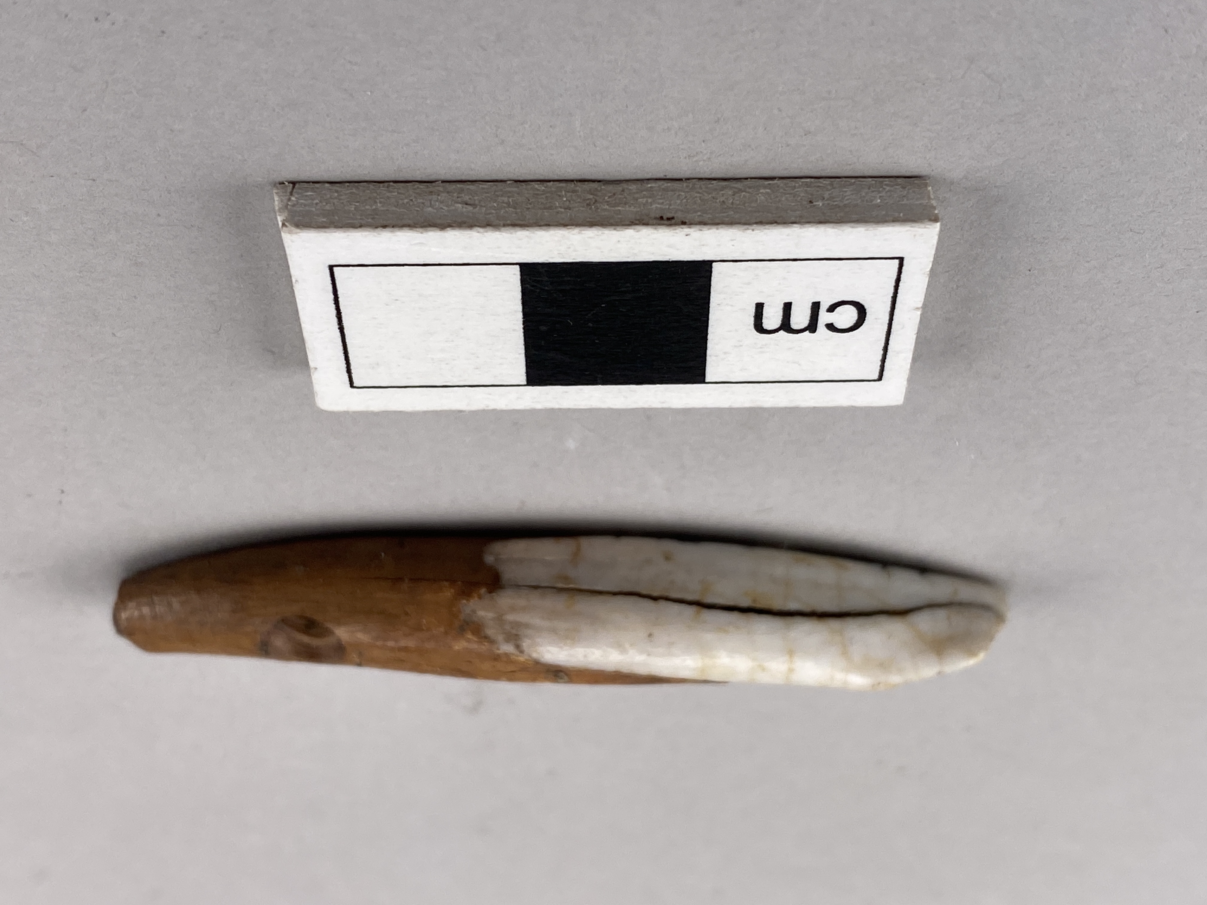 Tandpärla av framtand från underkäke av svin; hål.